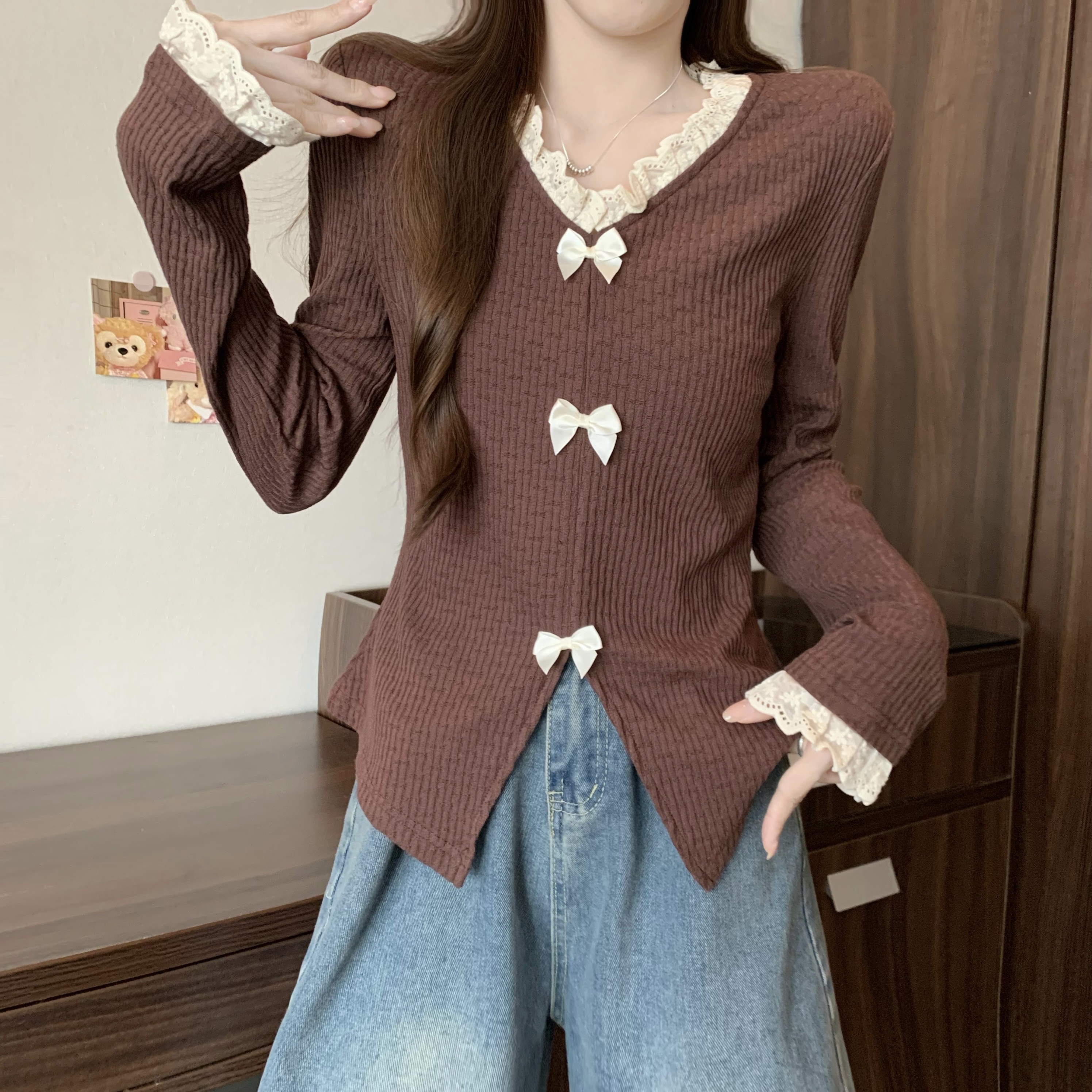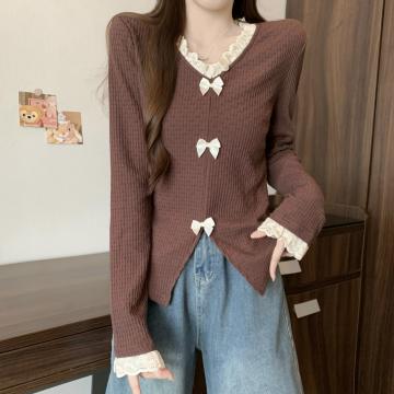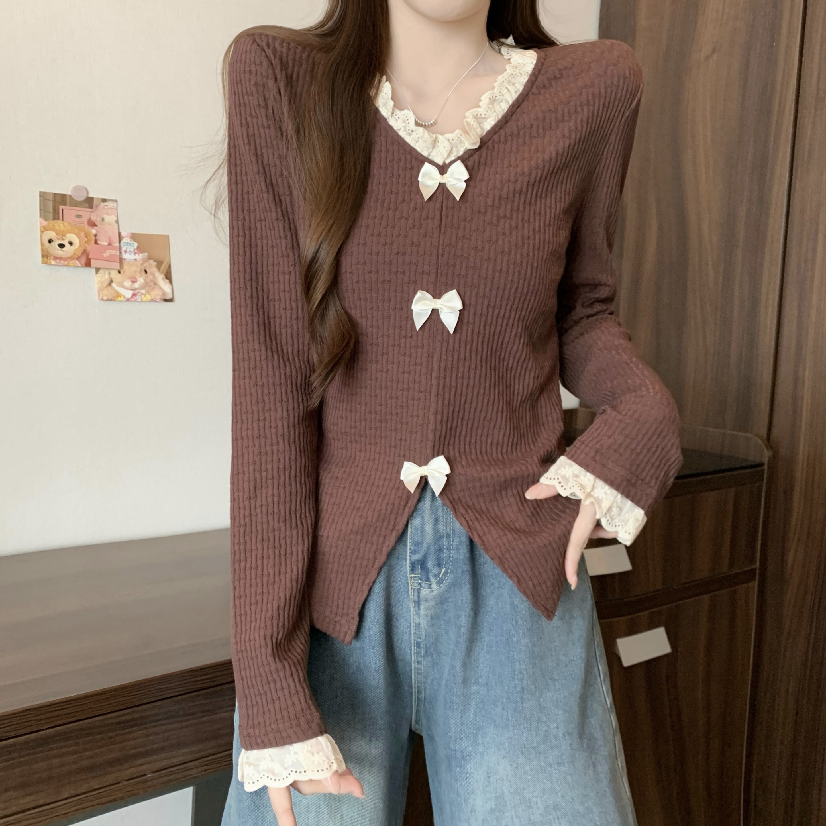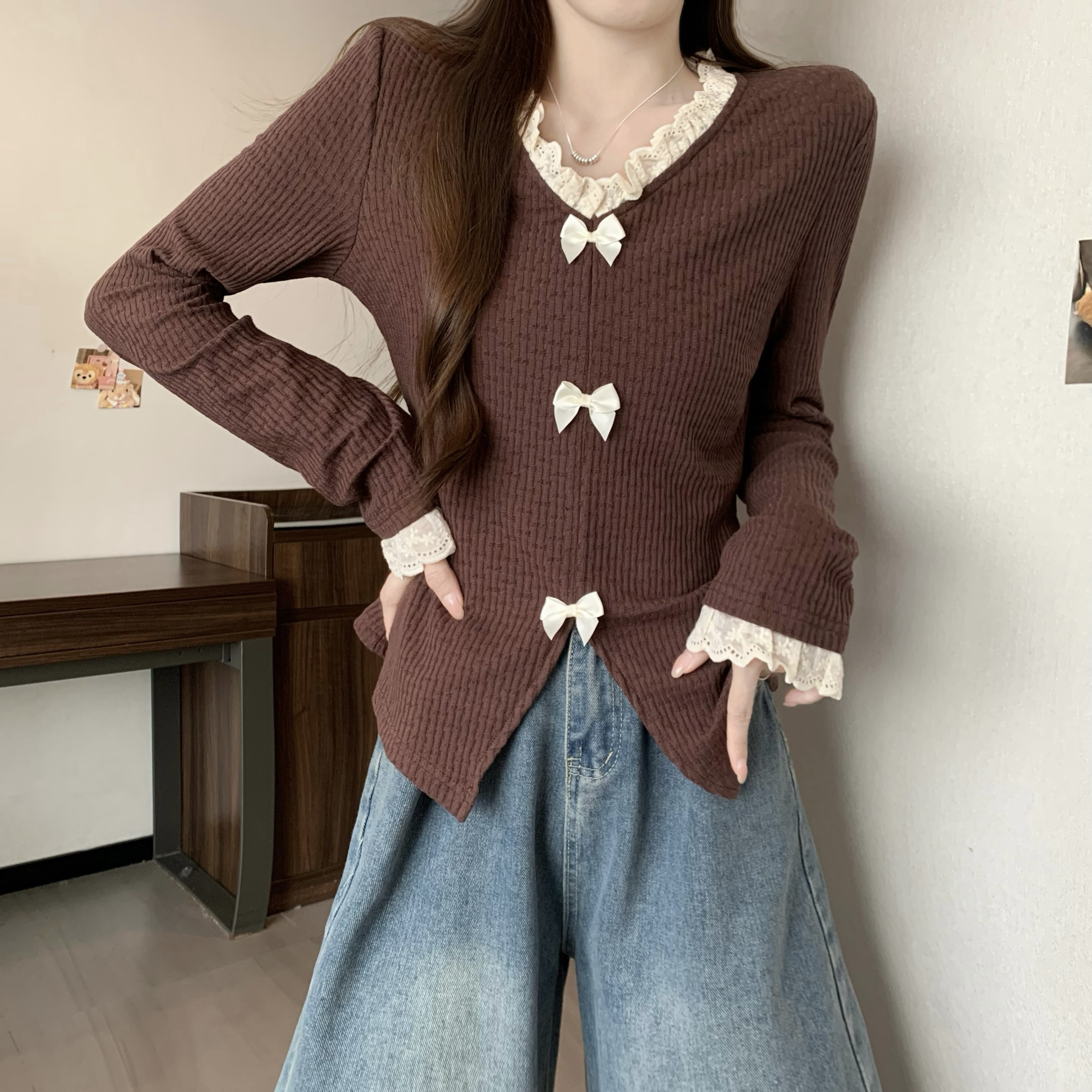 FA56454# 胖MM咖色V领长袖T恤女秋冬新款蝴蝶结蕾丝拼接收腰显瘦短上衣 服裝批發女裝批發服飾貨源
