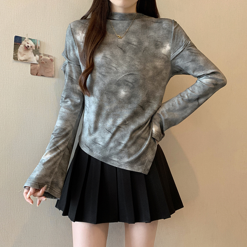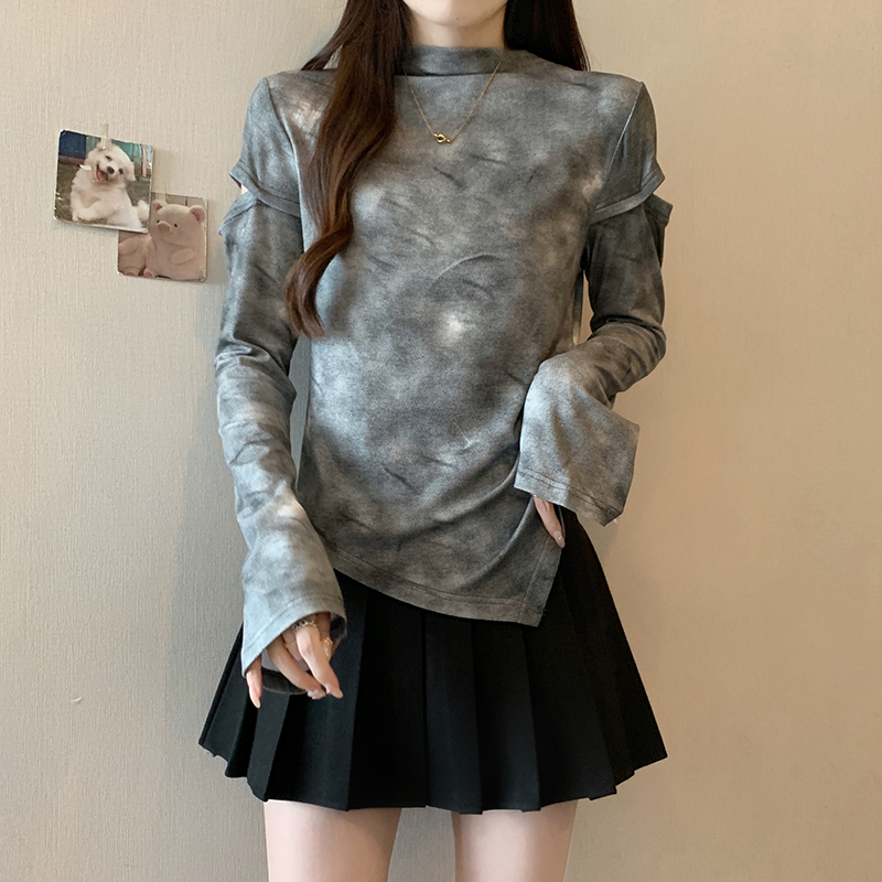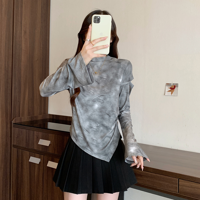 FA56479# 春季新款胖mm大码女别致扎染破洞甜辣不规则长袖T恤 服裝批發女裝批發服飾貨源