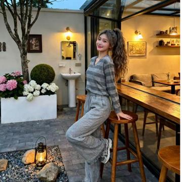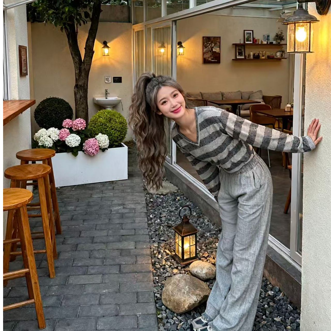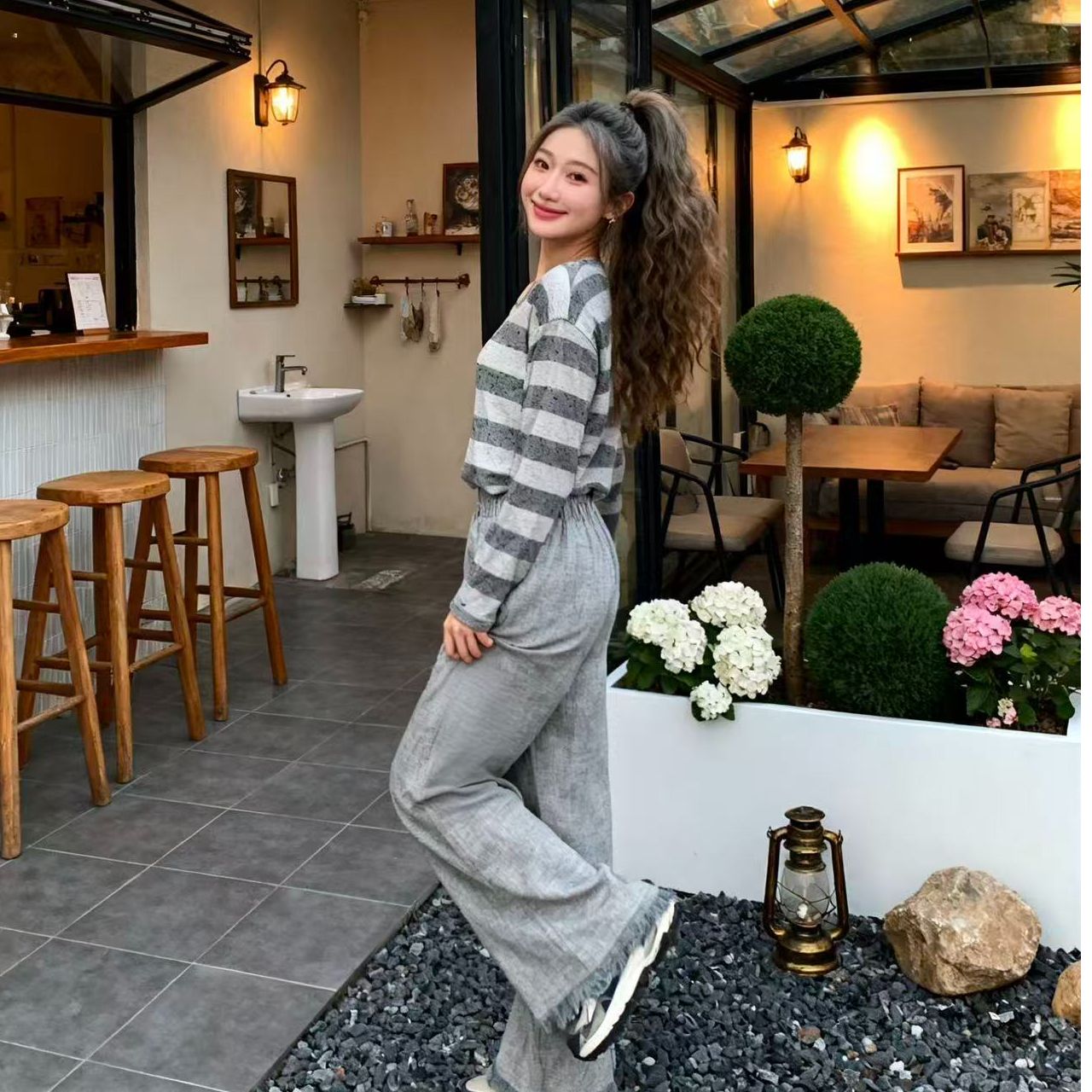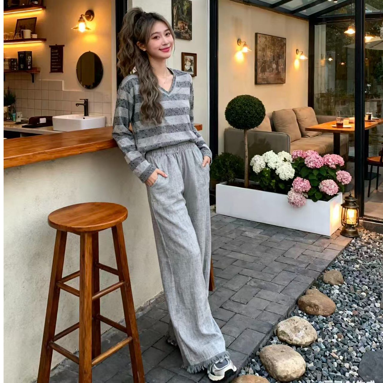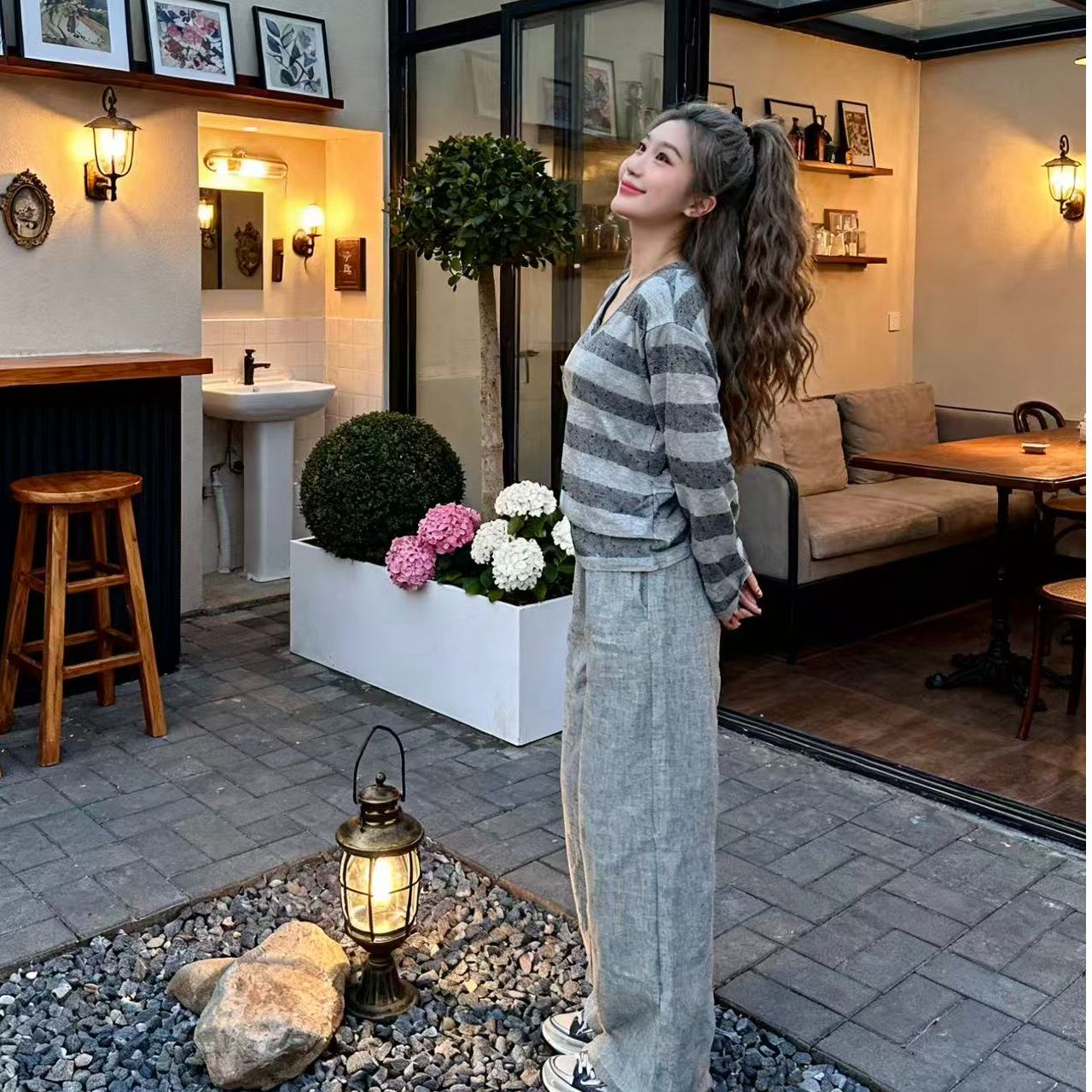 FA56494# 春秋氛围感穿搭女装V领条纹衫防晒长袖上衣气质休闲裤两件套 服裝批發女裝批發服飾貨源