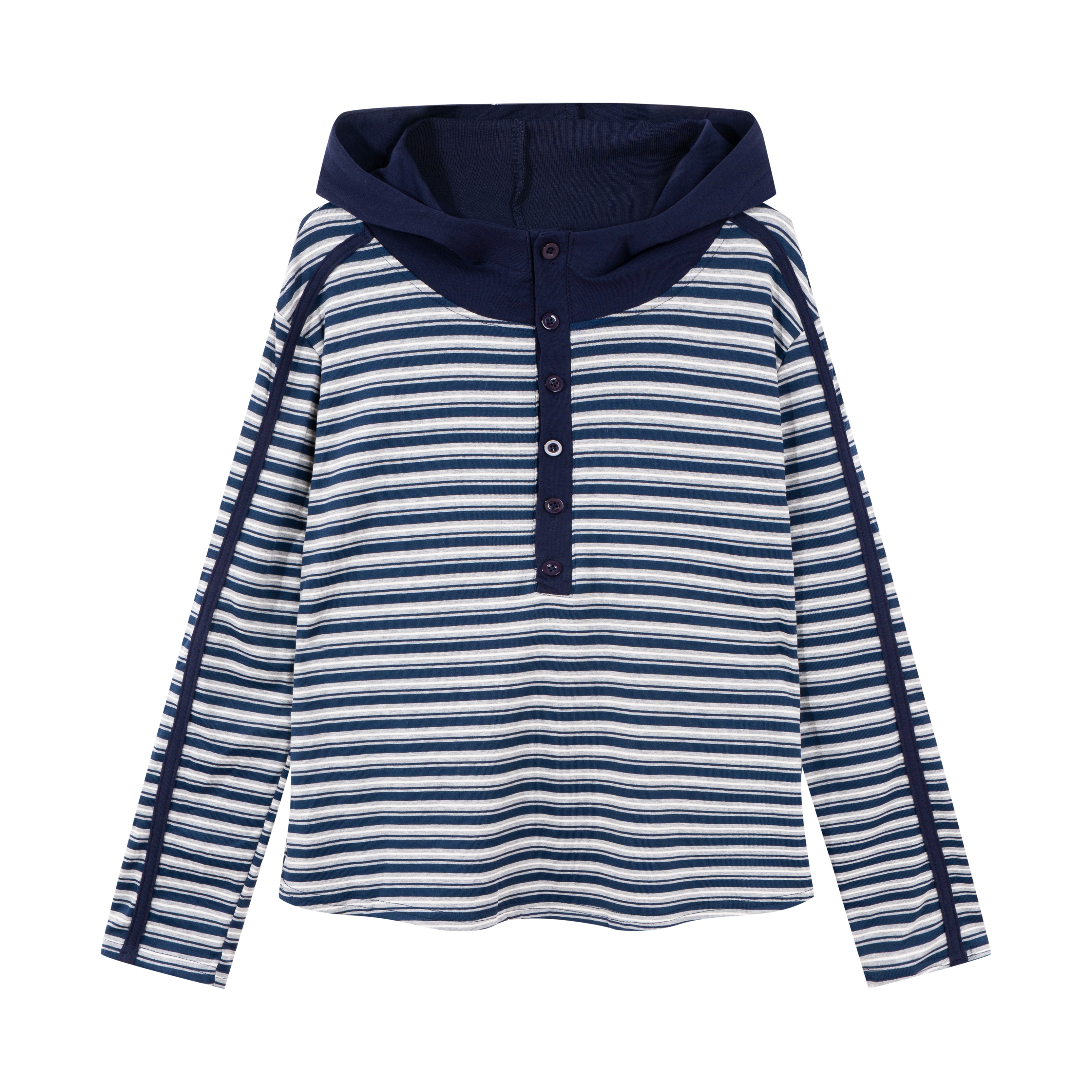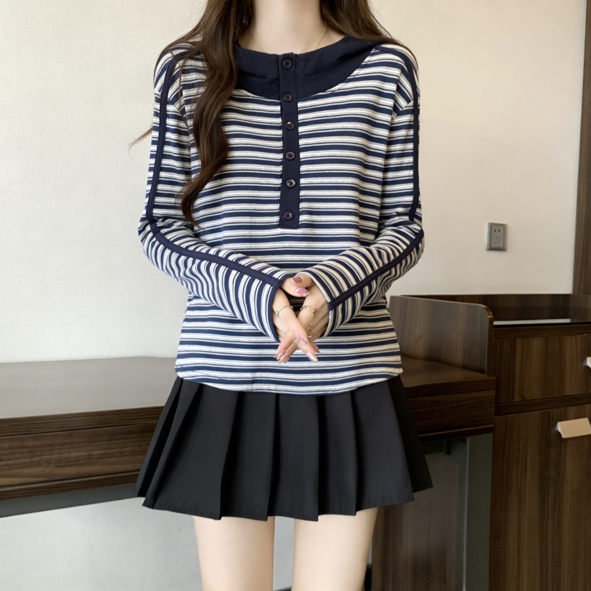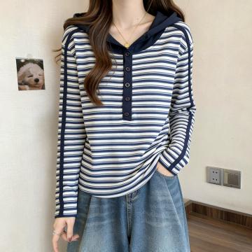 FA56498# 条纹长袖连帽t恤女秋季内搭打底衫新款大码胖mm收腰显瘦上衣 服裝批發女裝批發服飾貨源