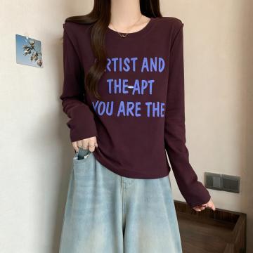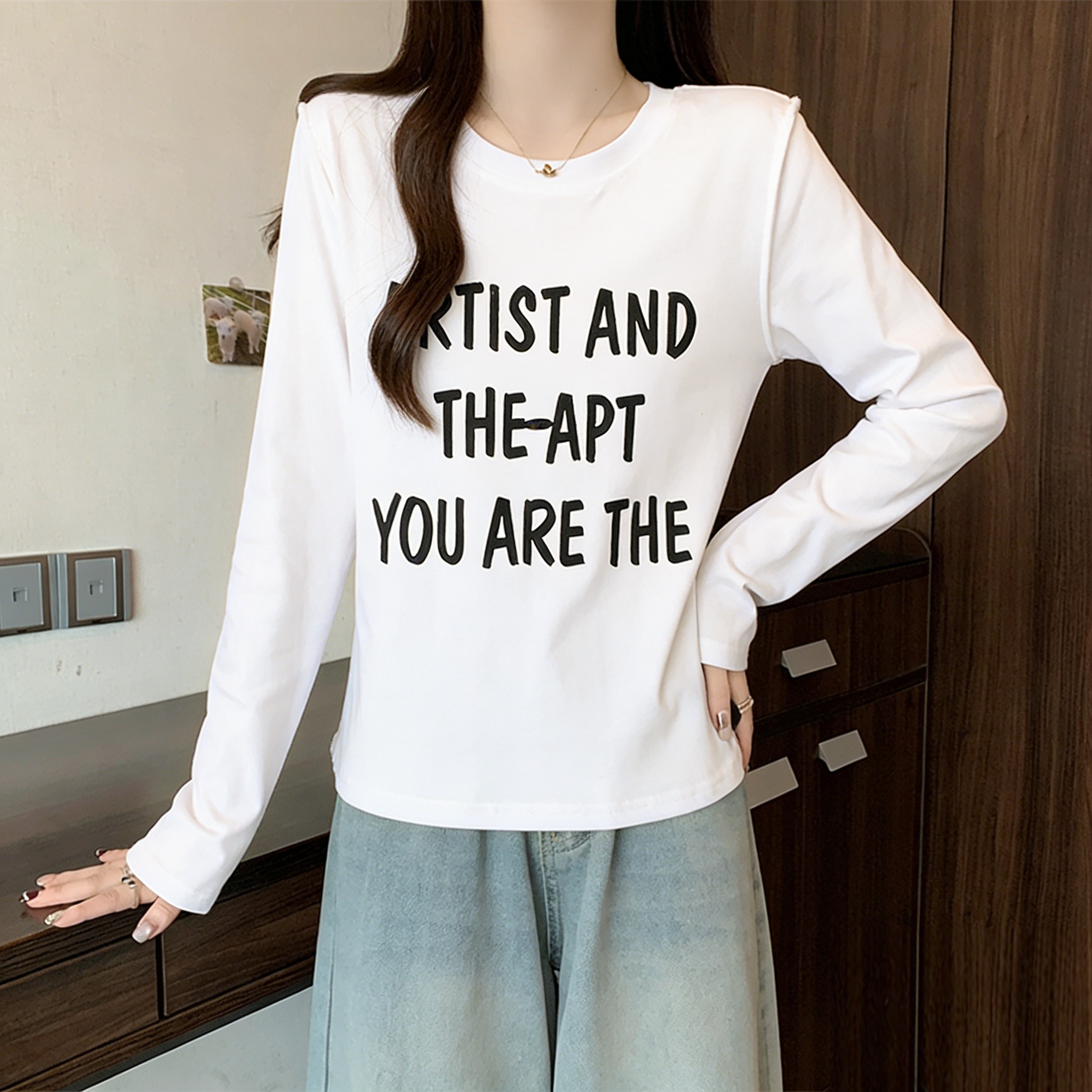 FA56500# 大码微胖纯棉减龄长袖T恤女装秋季百搭打底衫胖MM显瘦设计感上衣 服裝批發女裝批發服飾貨源