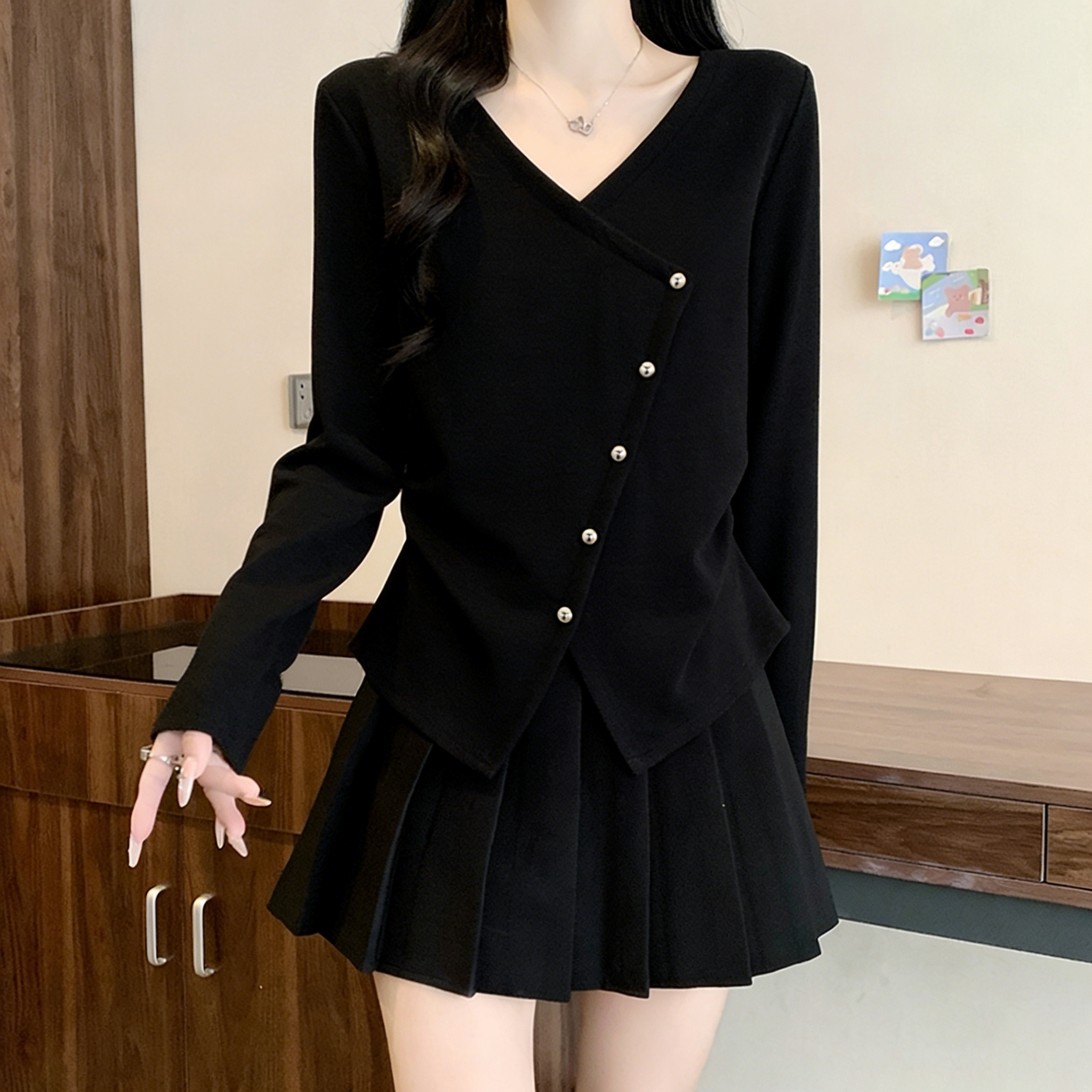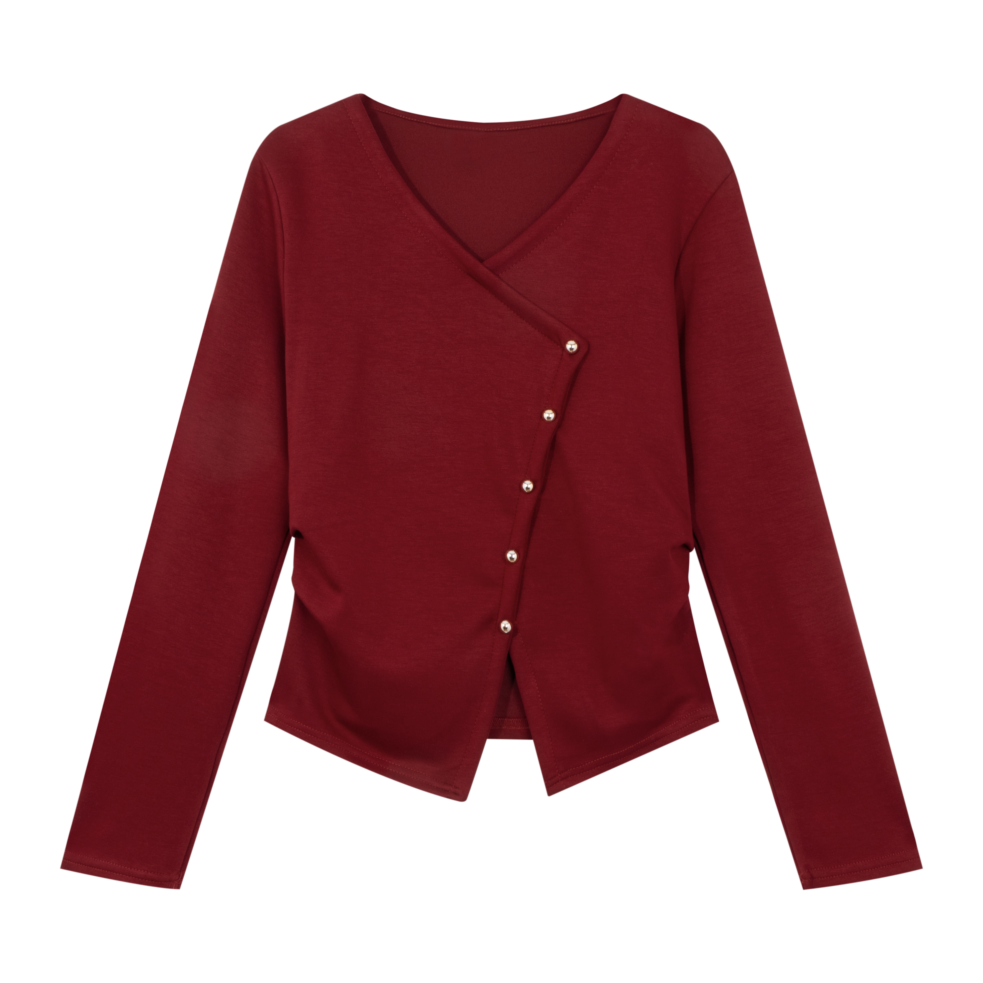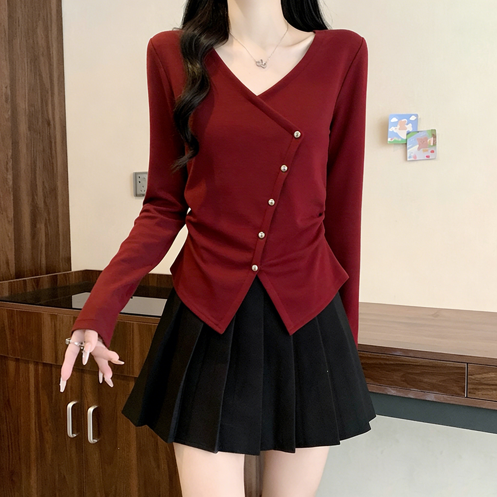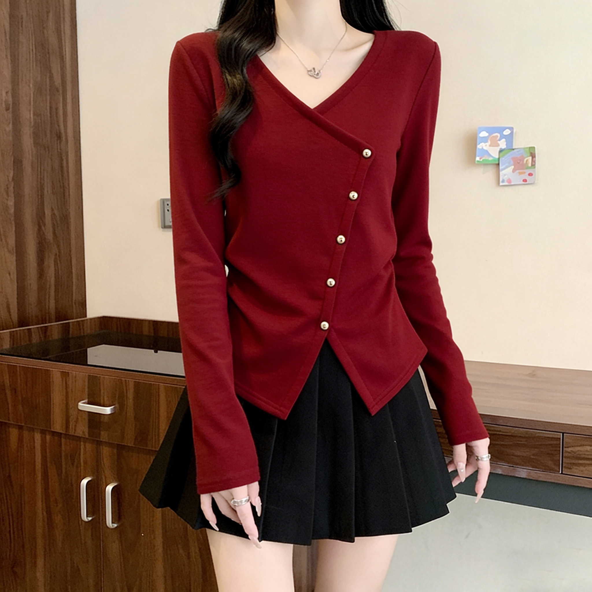 FA56502# 气质正肩V领长袖开衫T恤女秋季大码微胖mm遮肚子显瘦内搭打底上衣 服裝批發女裝批發服飾貨源