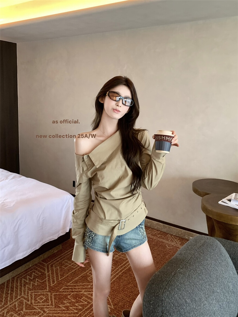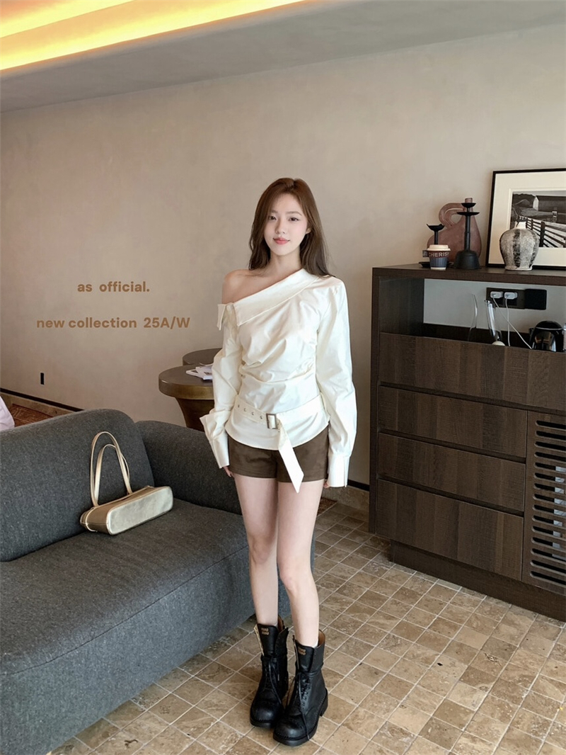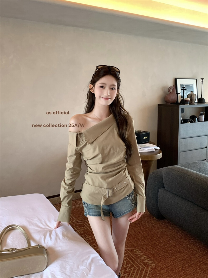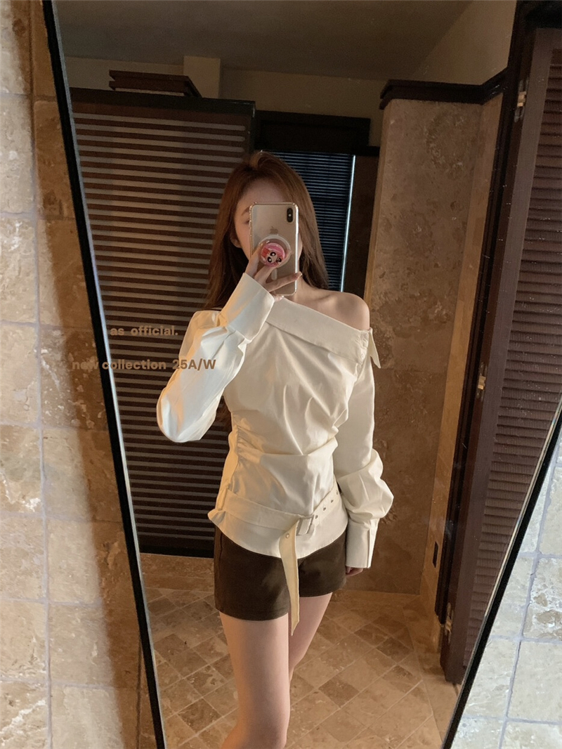 FA56541# 古早美少女调性DNA•斜门襟掐腰设计露肩衬衫配腰带 服裝批發女裝批發服飾貨源