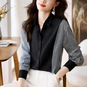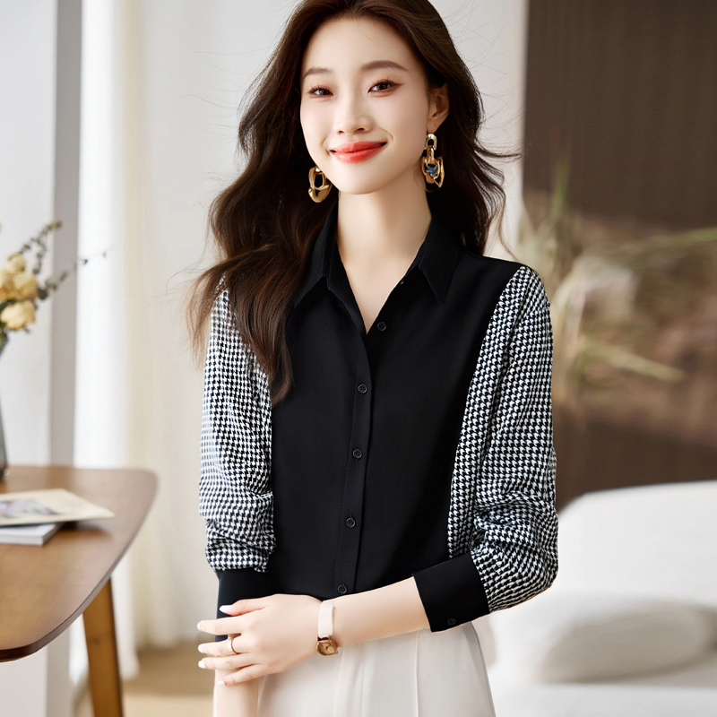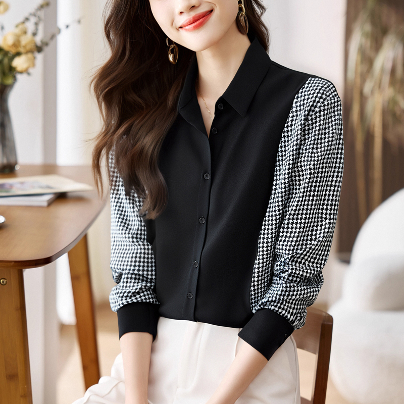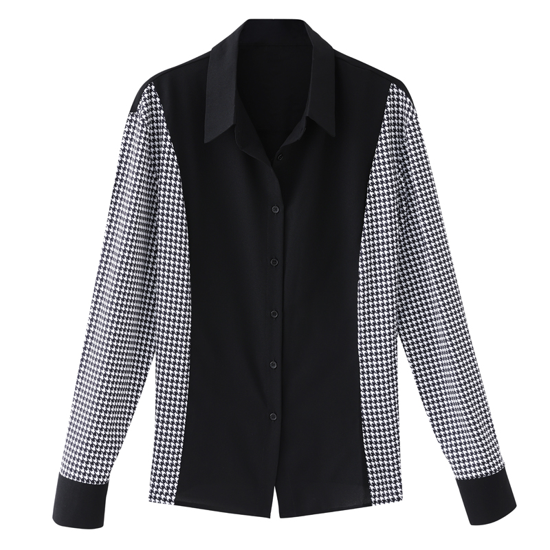 FA56557# 洋气休闲春秋新款女装翻领拼接雪纺衫上衣开衫衬衫打底衫衬衣 服裝批發女裝批發服飾貨源