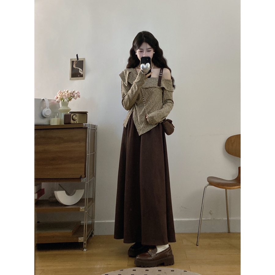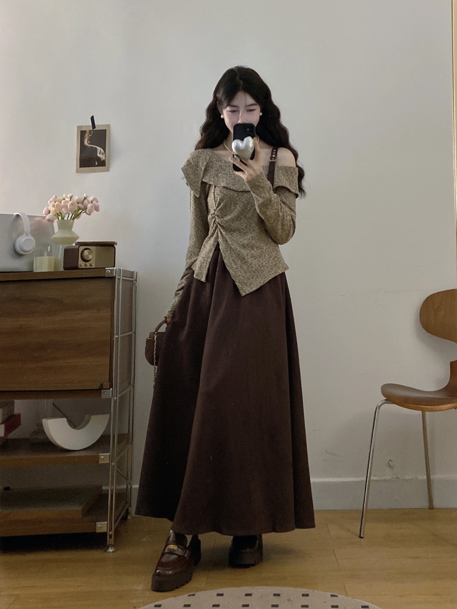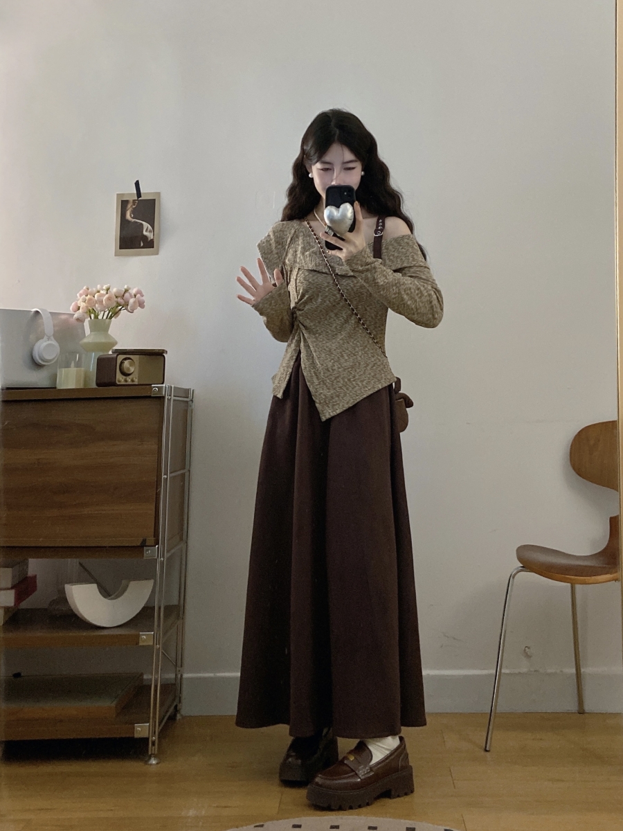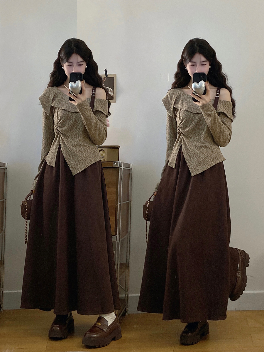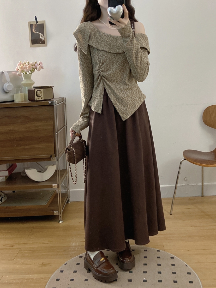 FA56670# 大码女装胖mm春季设计感不规则斜领露肩上衣时尚半身裙两件套 服裝批發女裝批發服飾貨源