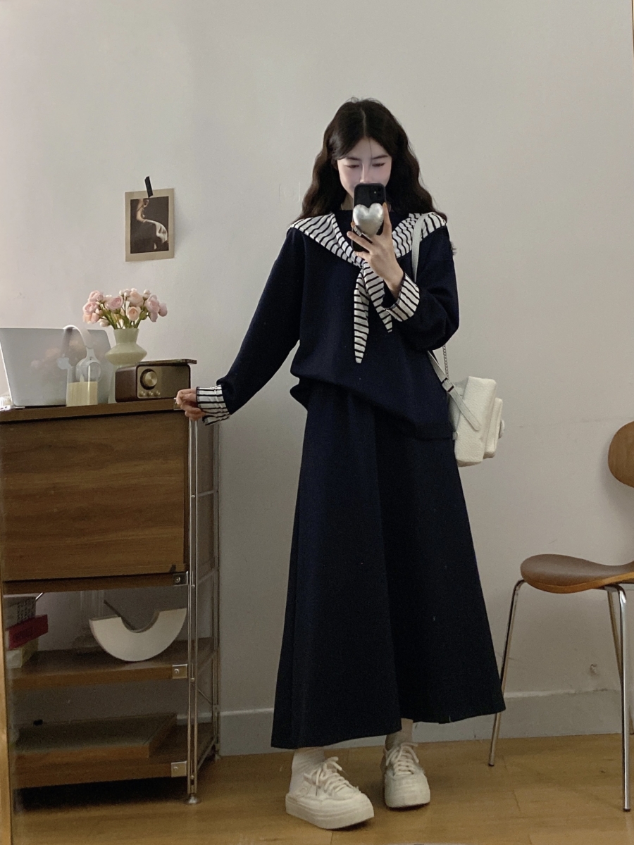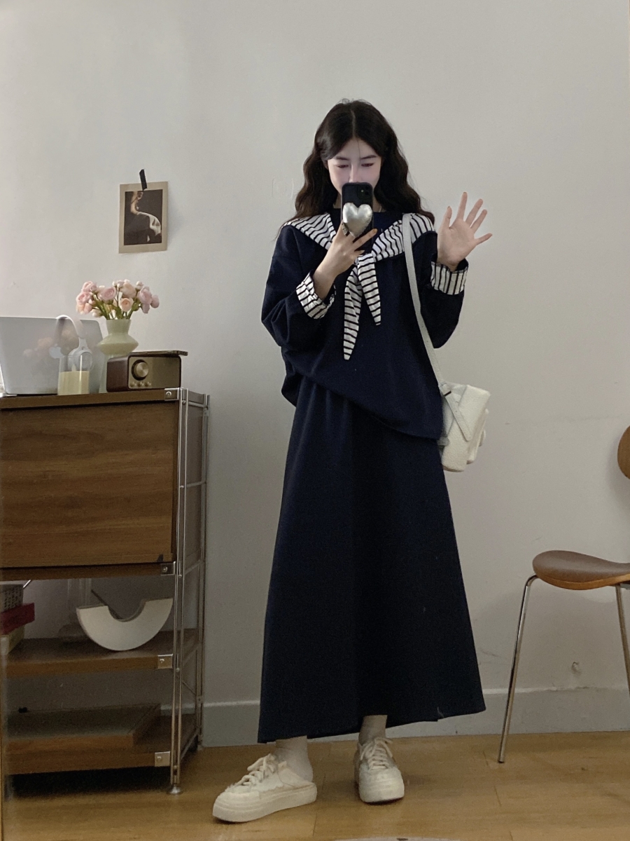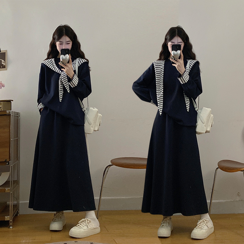 FA56672# 大码女装胖mm春季条纹披肩连帽卫衣宽松半身裙遮肚显瘦两件套 服裝批發女裝批發服飾貨源