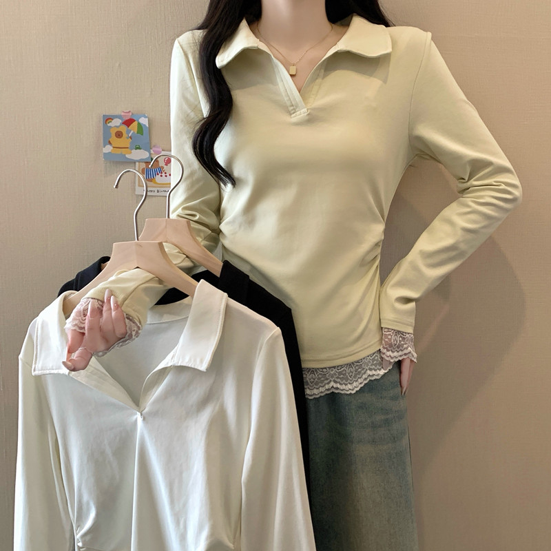 Home > 长袖T恤 > FA56677# 大码女装胖mm春季设计感蕾丝拼接翻领假两件上衣显瘦长袖T桖 服裝批發女裝批發服飾貨源