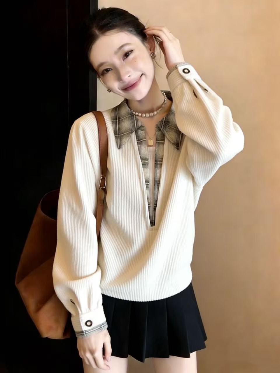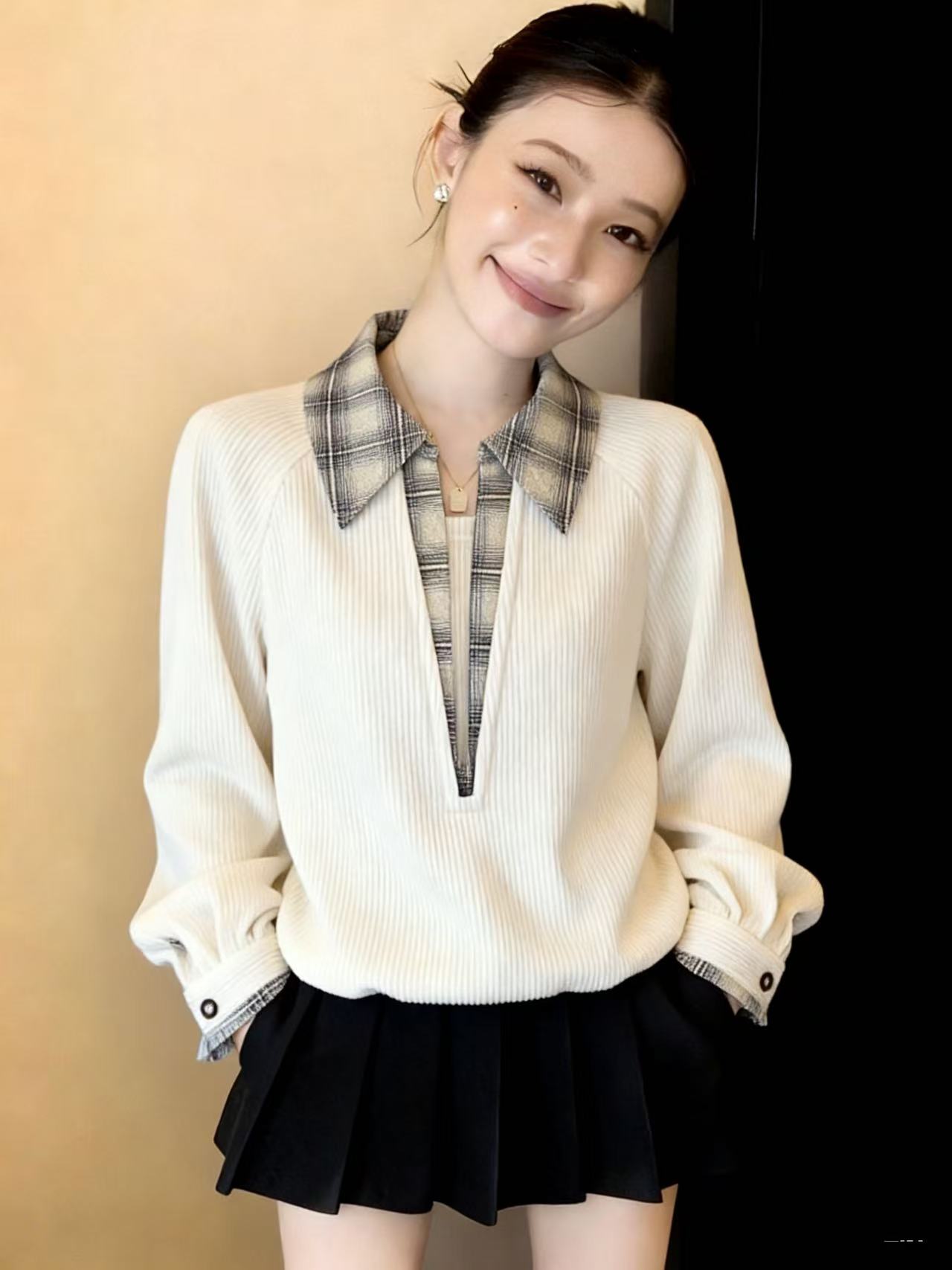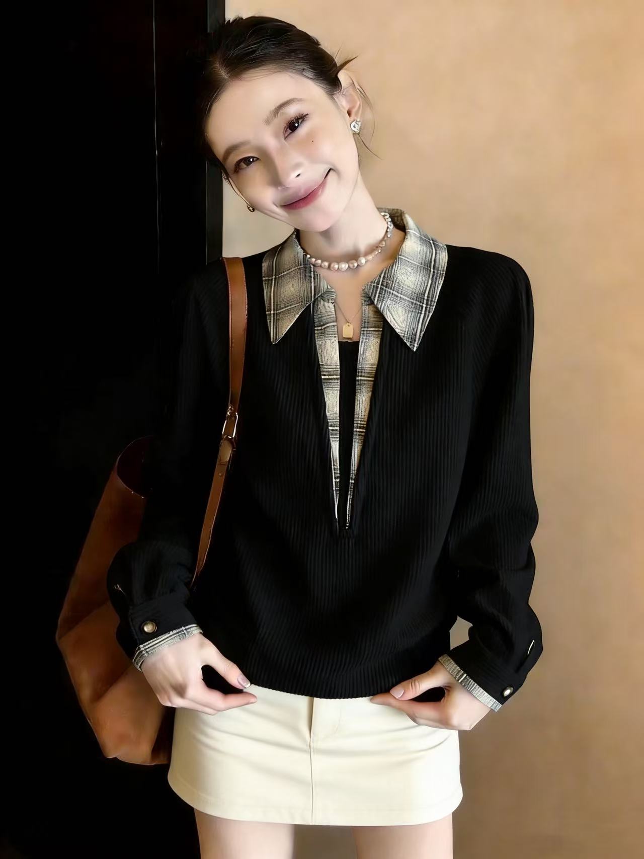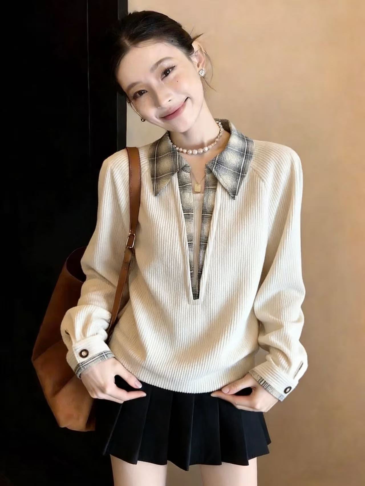 FA56704# 假两件格子拼接polo领长袖卫衣女春季季大码宽松套头上衣 服裝批發女裝批發服飾貨源