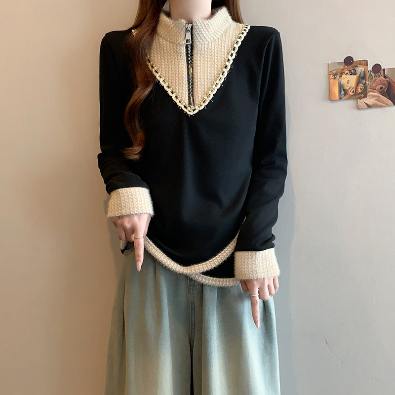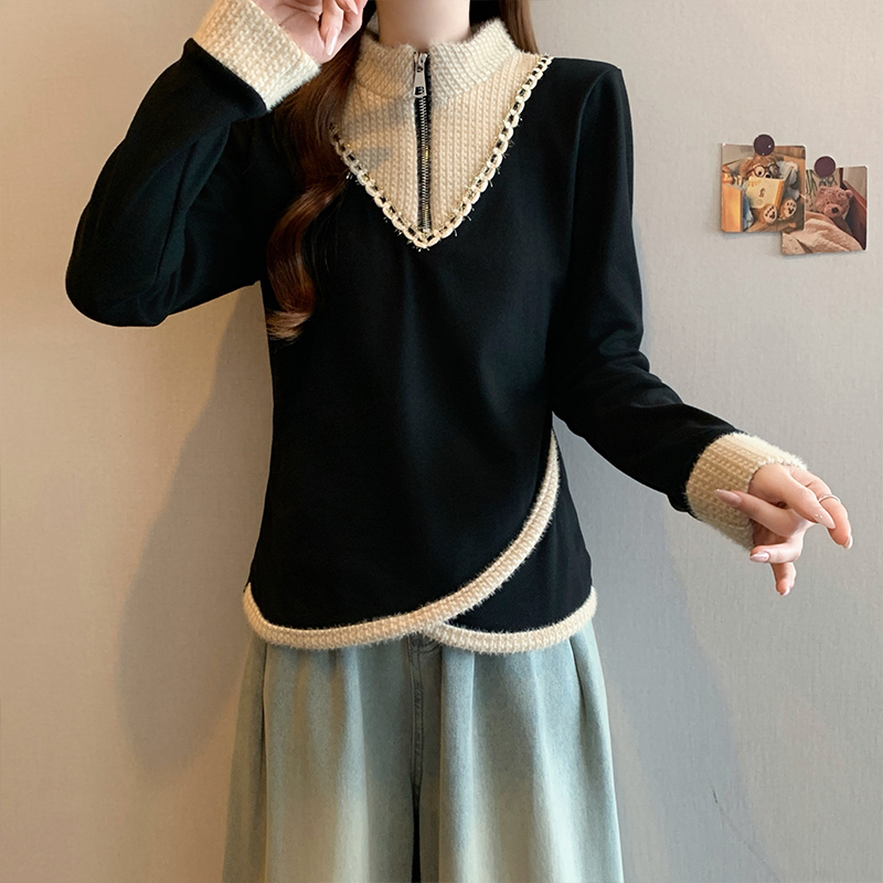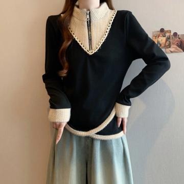 FA56727# 春季新款大码时尚小香风撞色拼接假两件宽松显瘦百搭上衣 服裝批發女裝批發服飾貨源