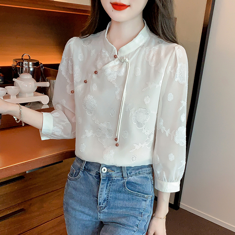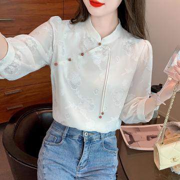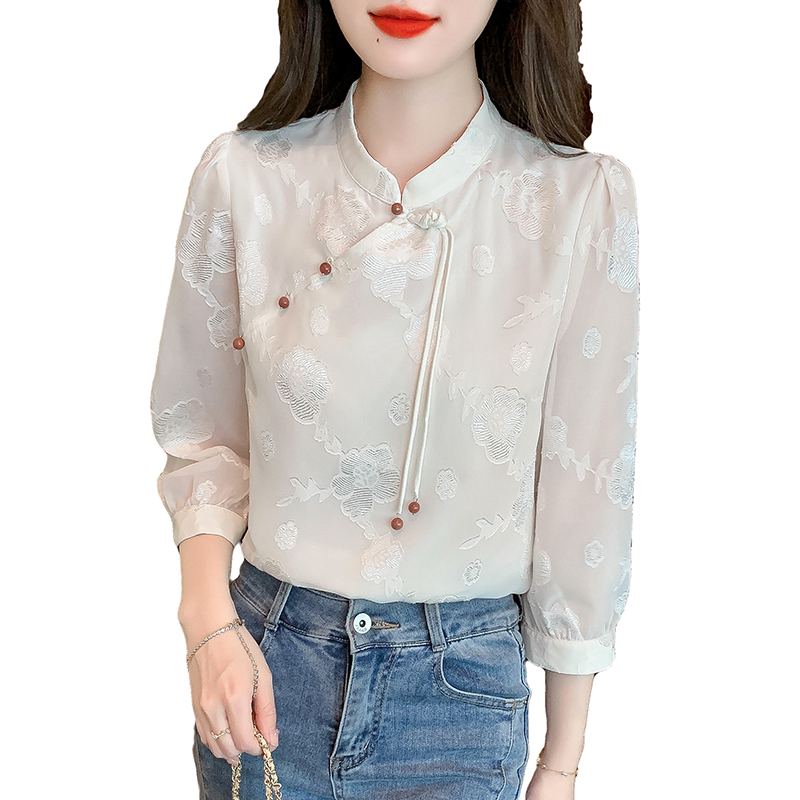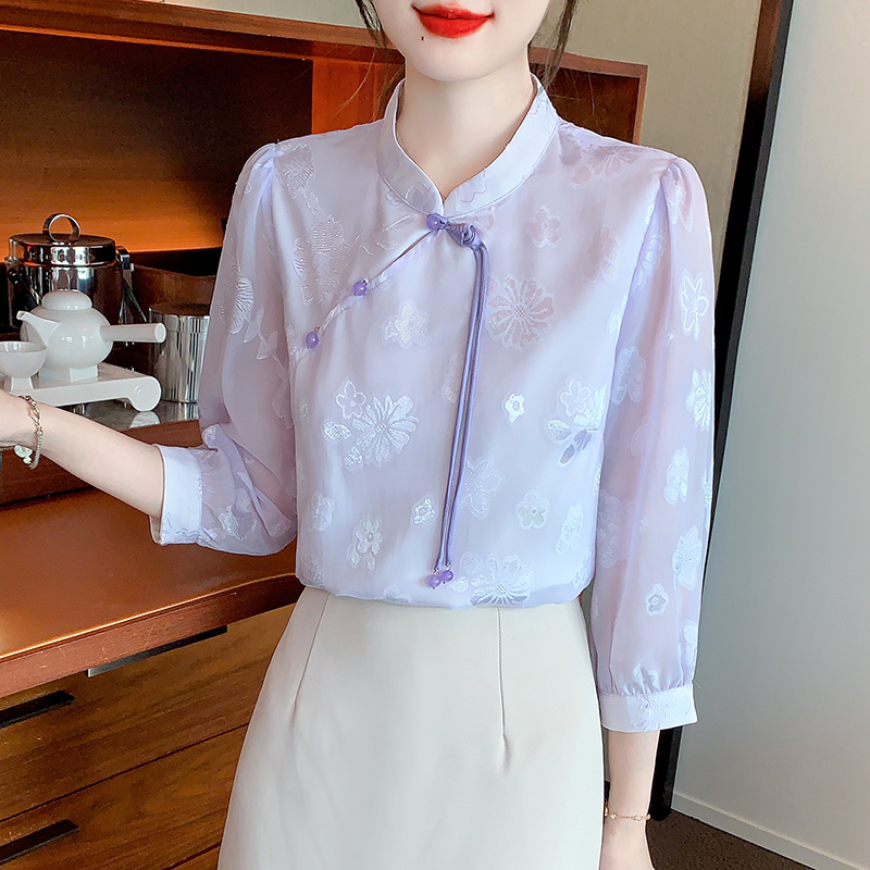 FA56851# 改良版旗袍雪纺衫女早春新款七分泡泡袖新中式别致上衣