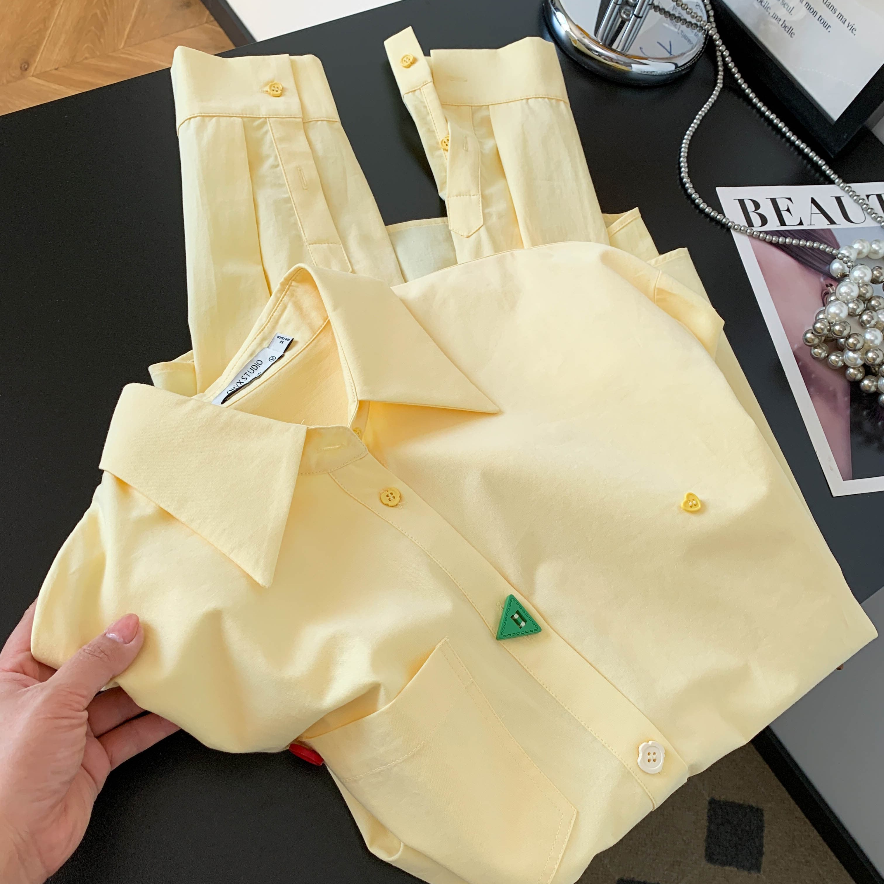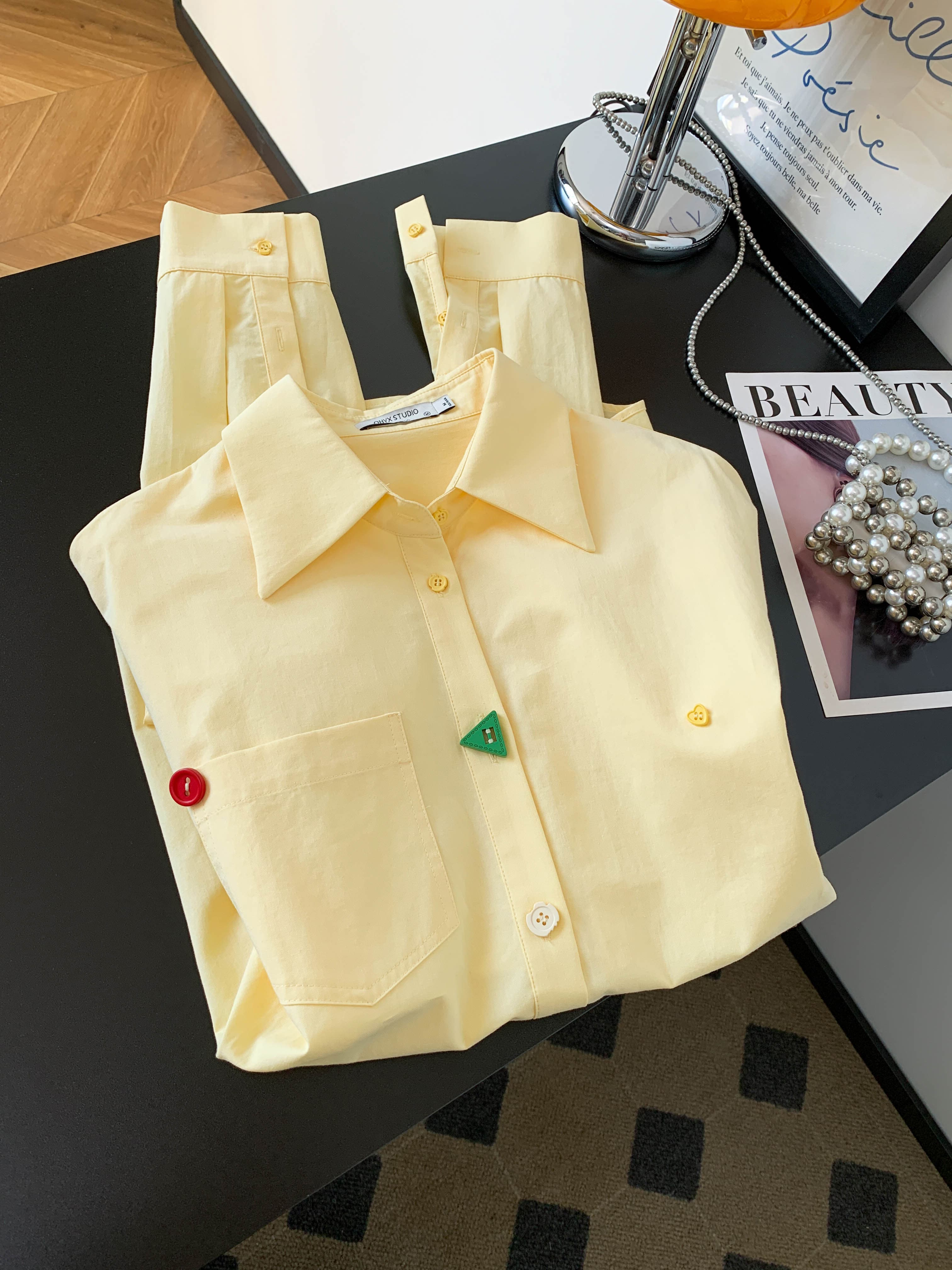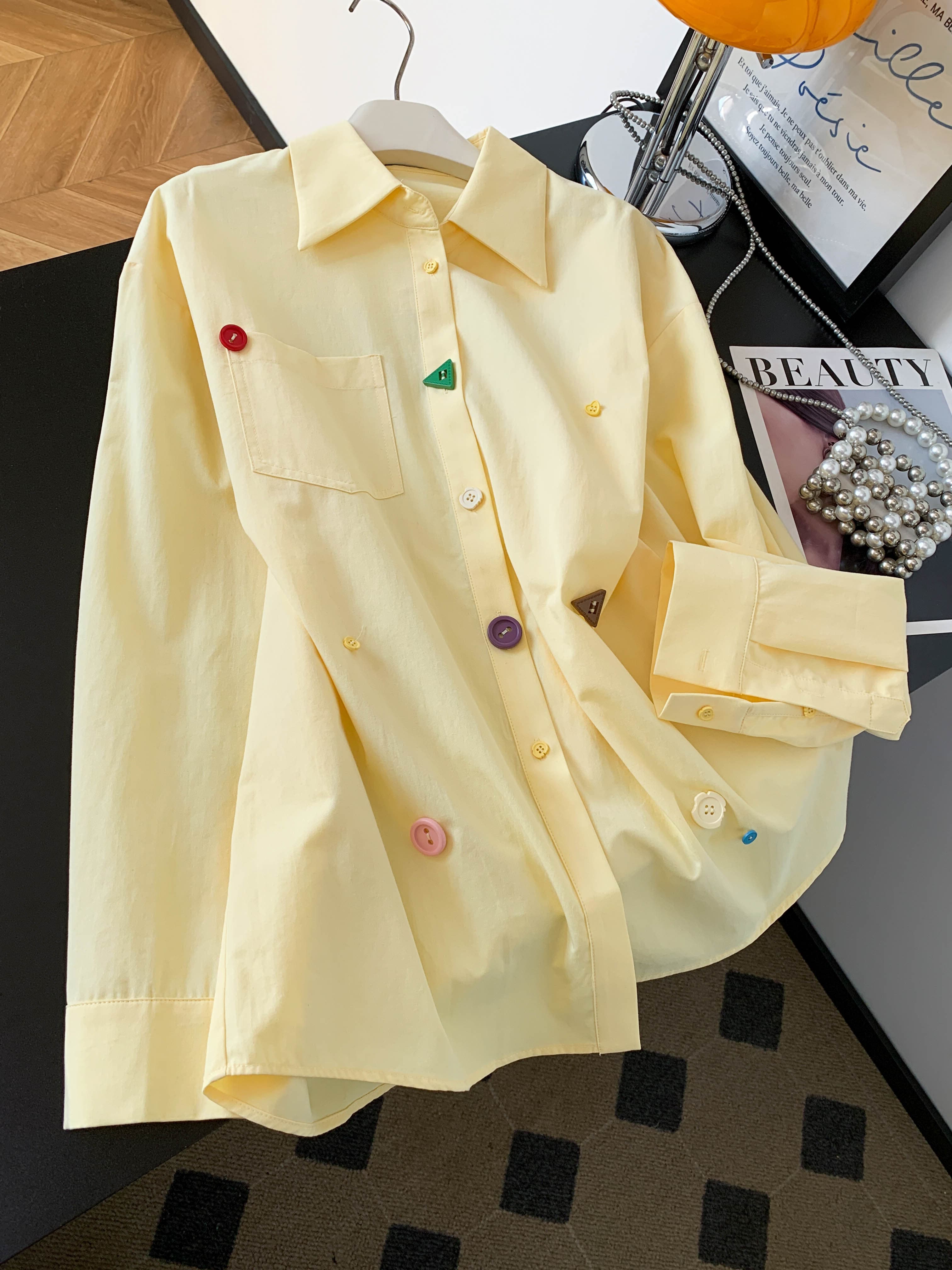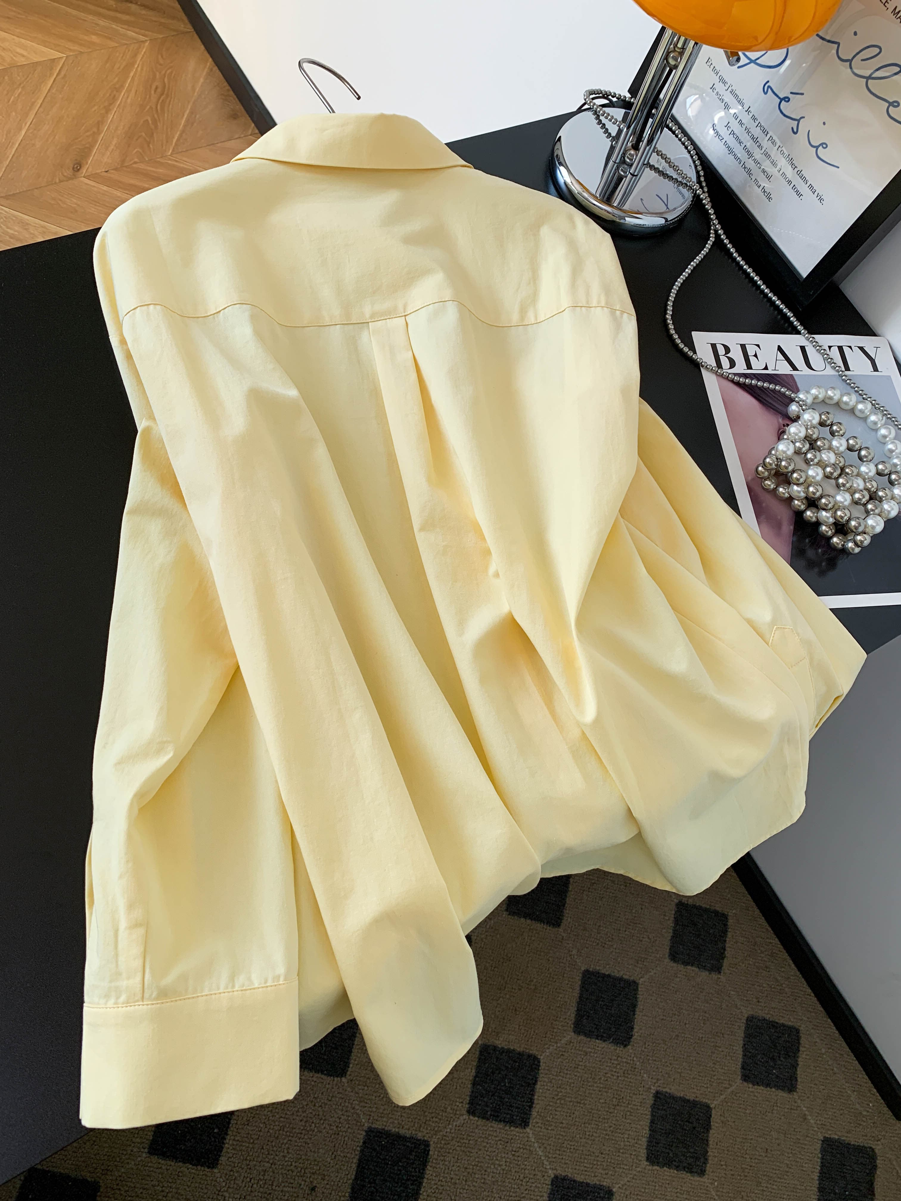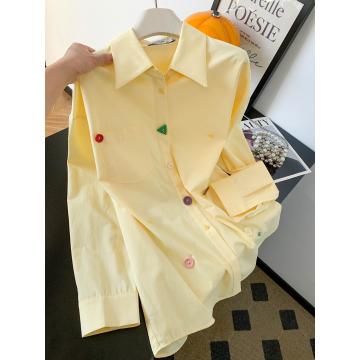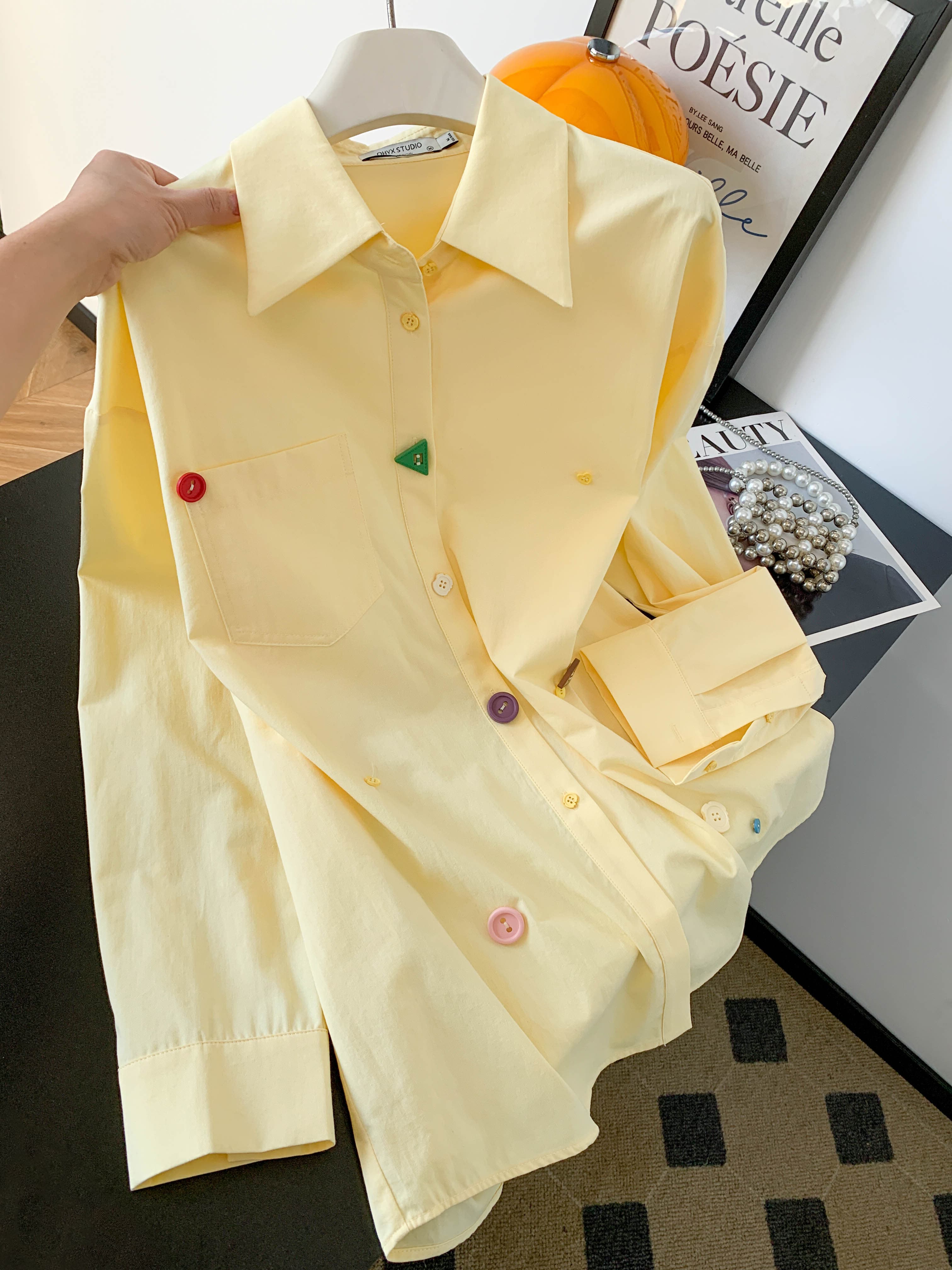 BY10226# 黄色设计感纽扣长袖衬衫女春季韩系多巴胺宽松衬衣小个子通勤上衣 服裝批發女裝批發服飾貨源