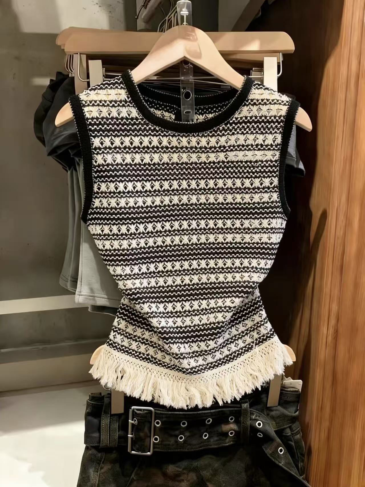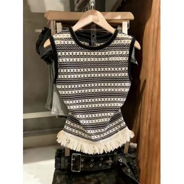 BY10842# 法式撞色流苏针织背心夏外穿复古宽松慵懒风镂空坎肩无袖上衣 服裝批發女裝批發服飾貨源