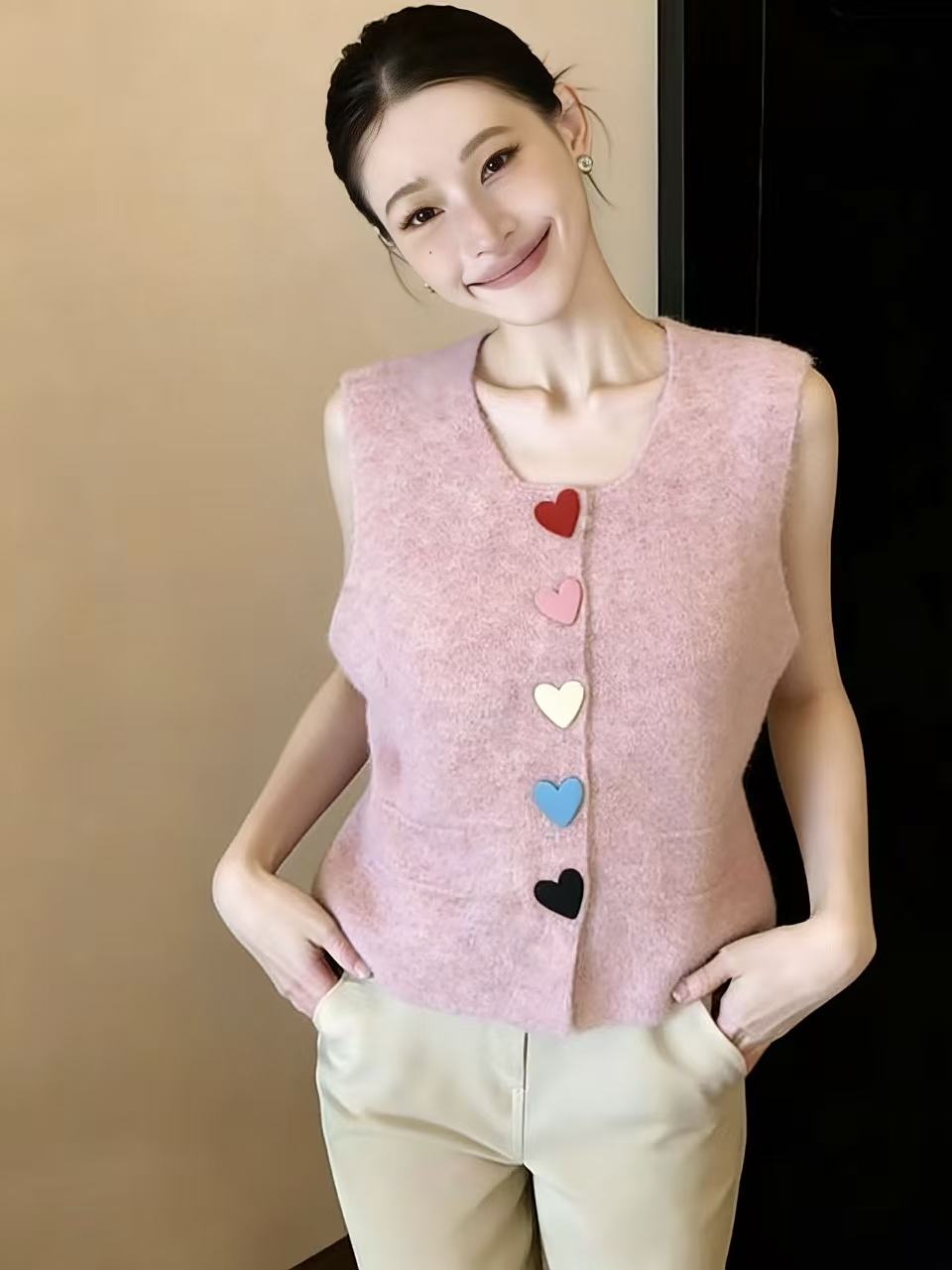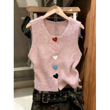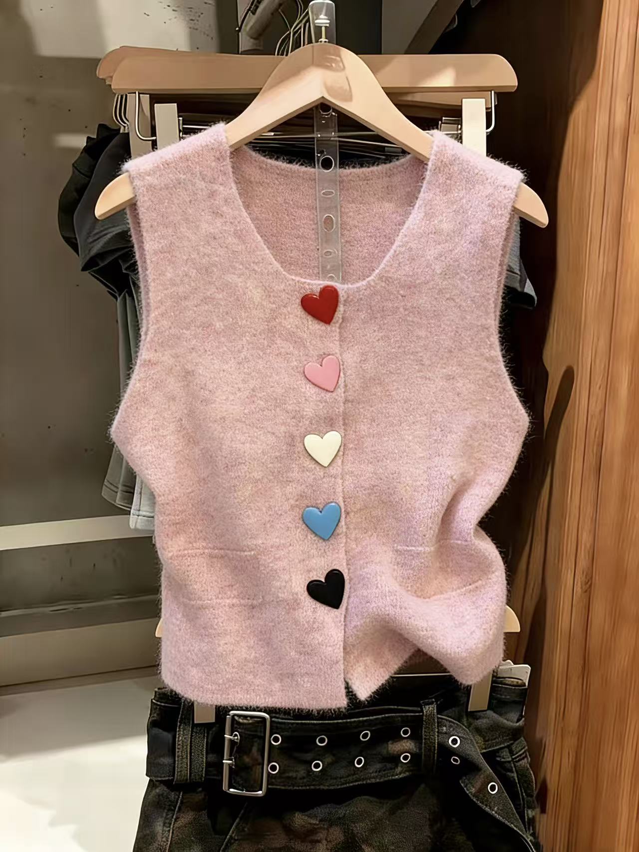 BY10851# 多巴胺风彩色爱心扣针织开衫马甲女新款减龄叠穿坎肩上衣 服裝批發女裝批發服飾貨源