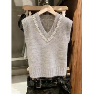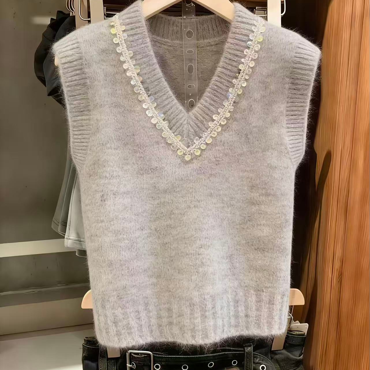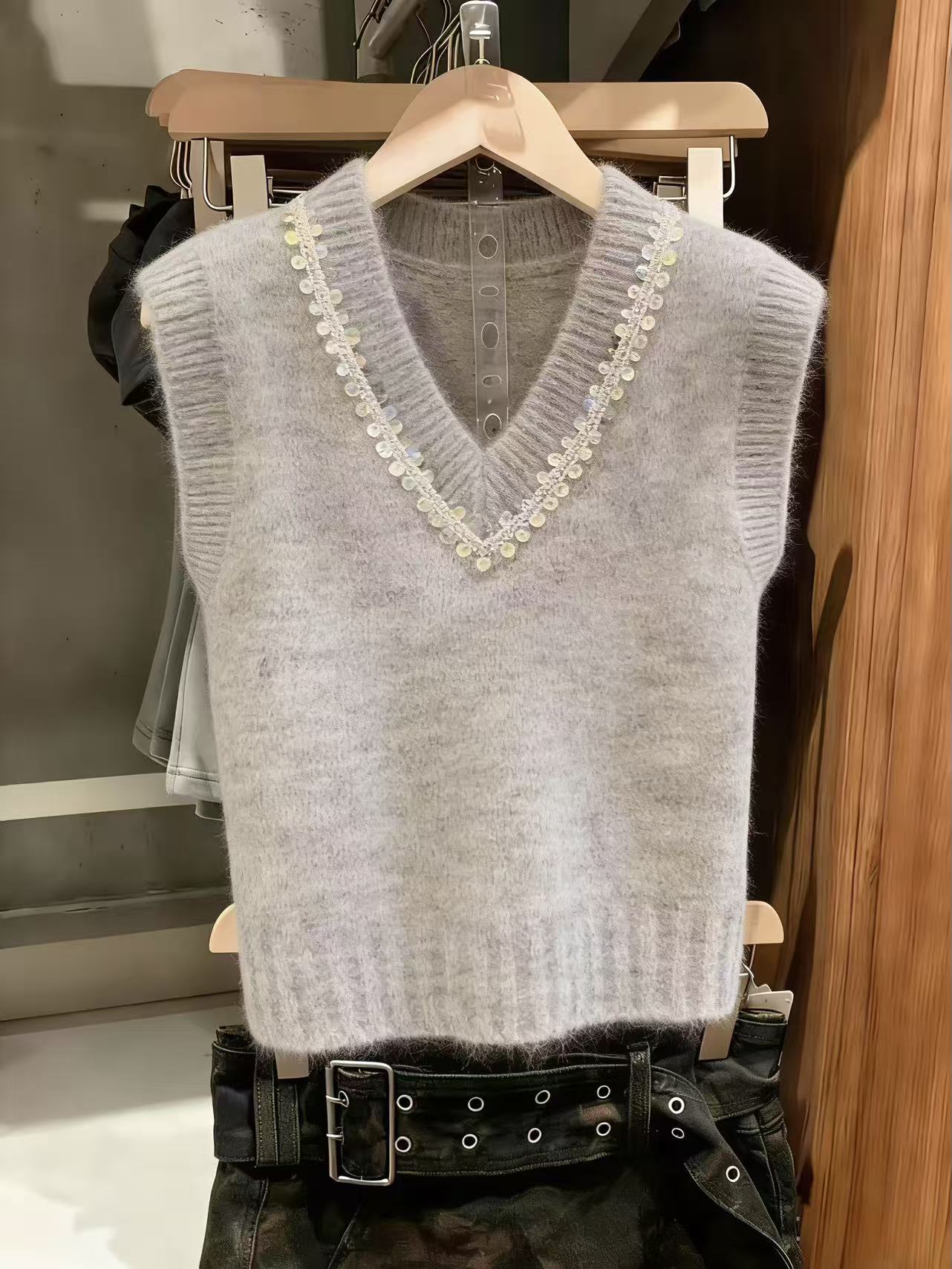 BY10852# 灰色甜美风亮片V领针织马甲女春季新款洋气叠穿无袖毛衣背心 服裝批發女裝批發服飾貨源