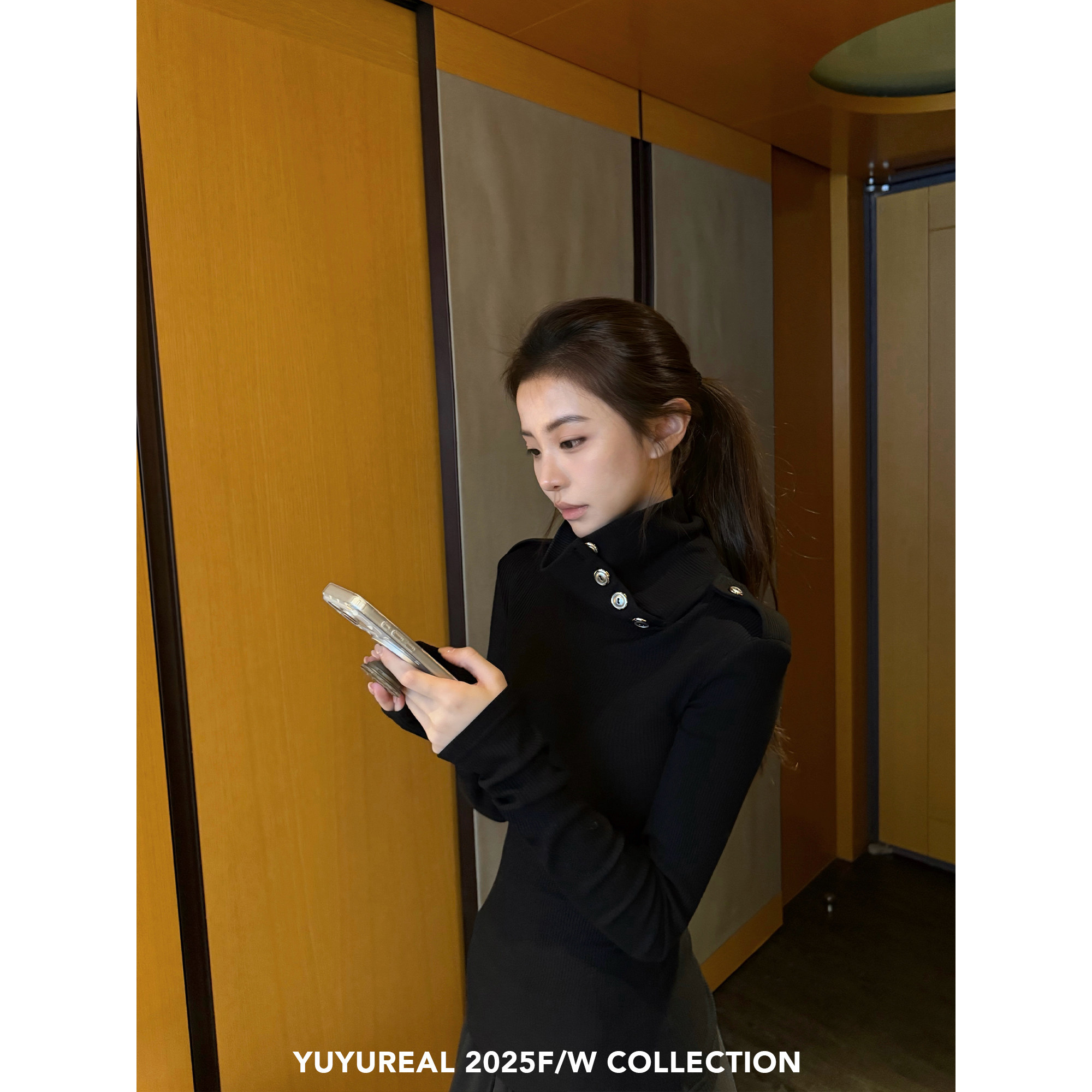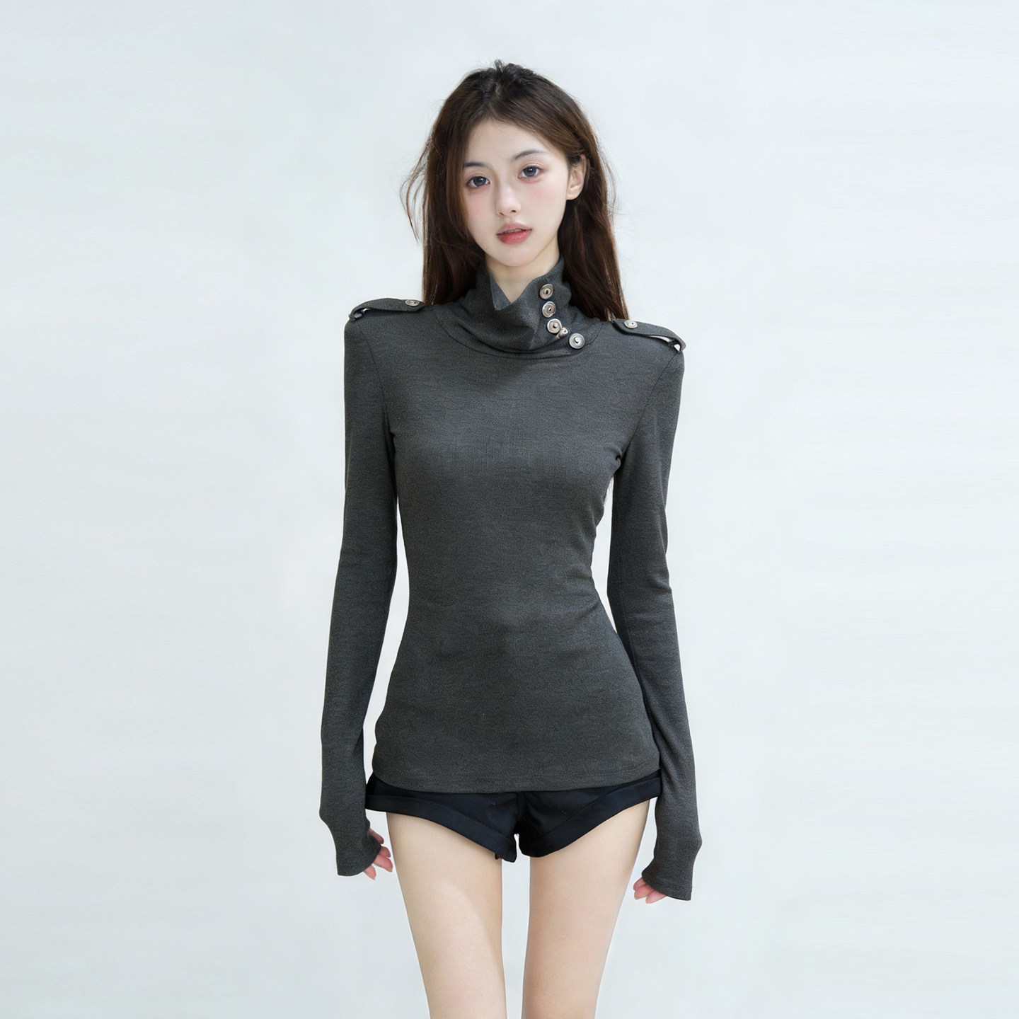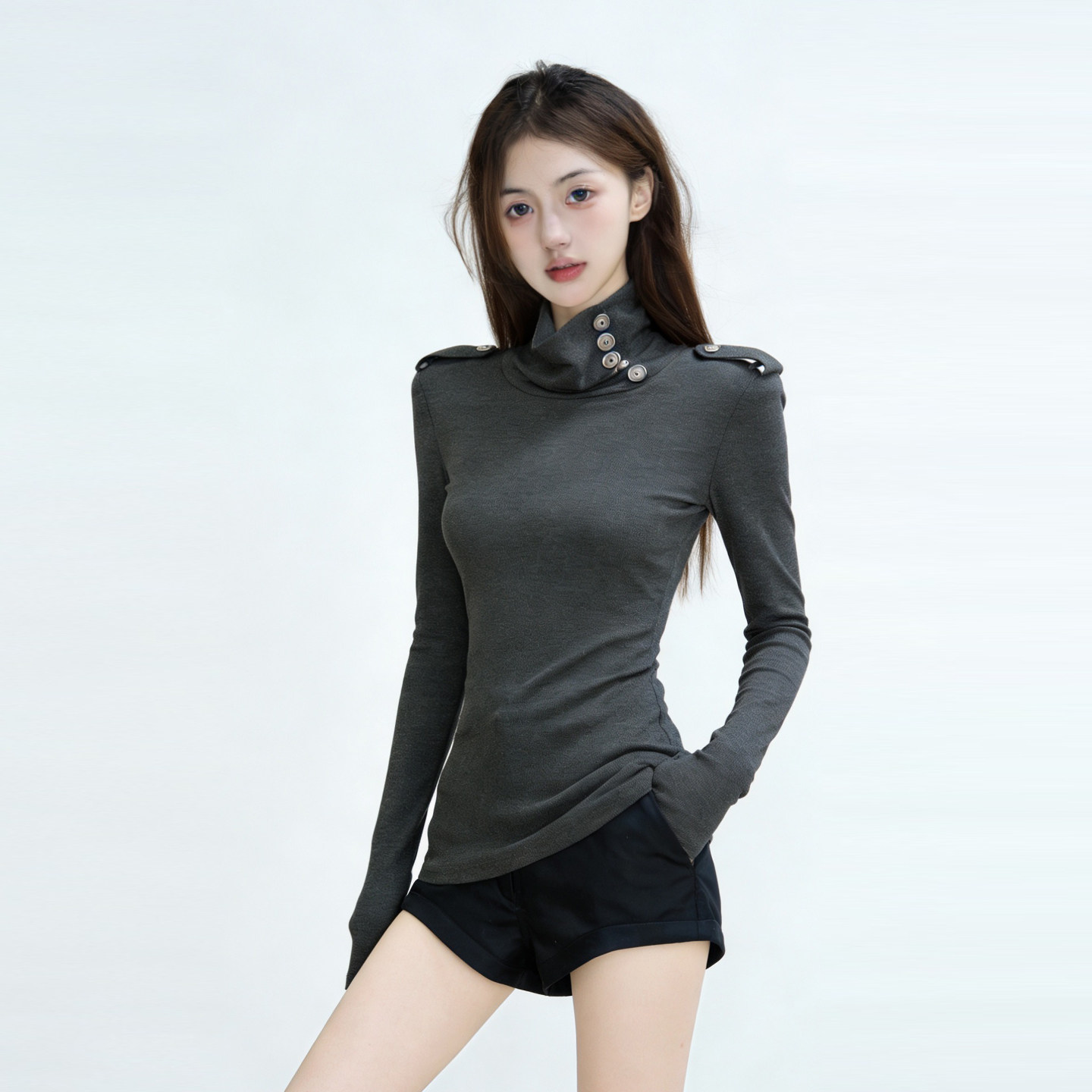 BY11808# 法国罗纹灰色复古半高领长袖打底衫女春秋收腰百搭气质上衣 服裝批發女裝批發服飾貨源
