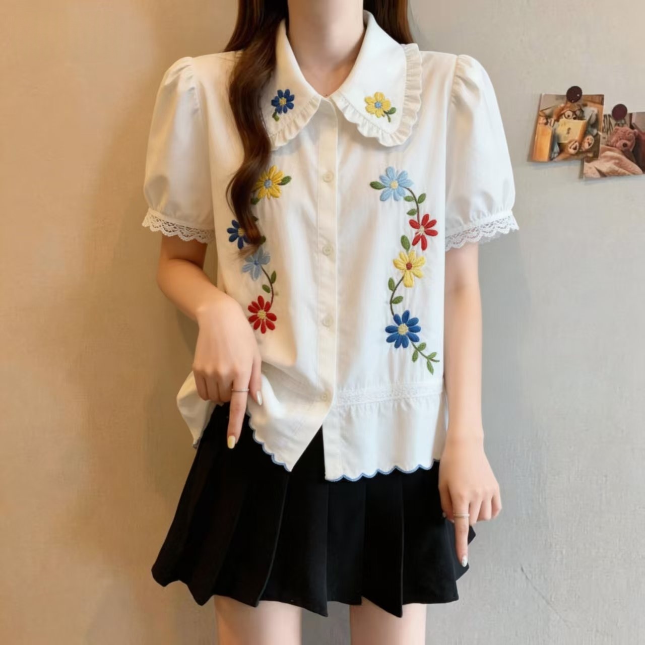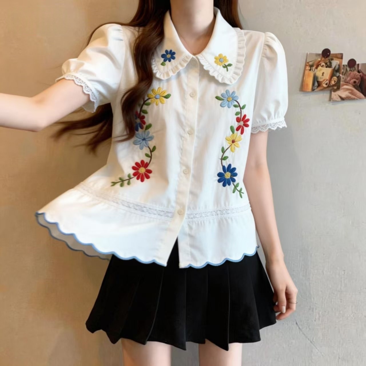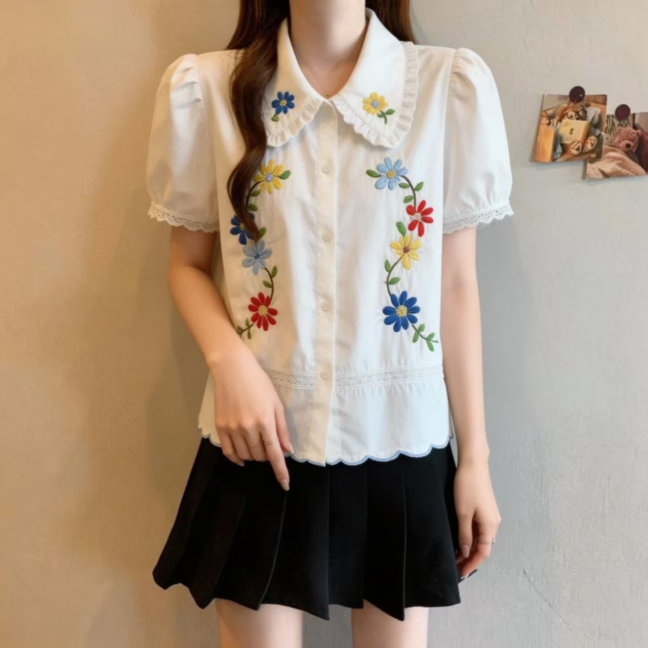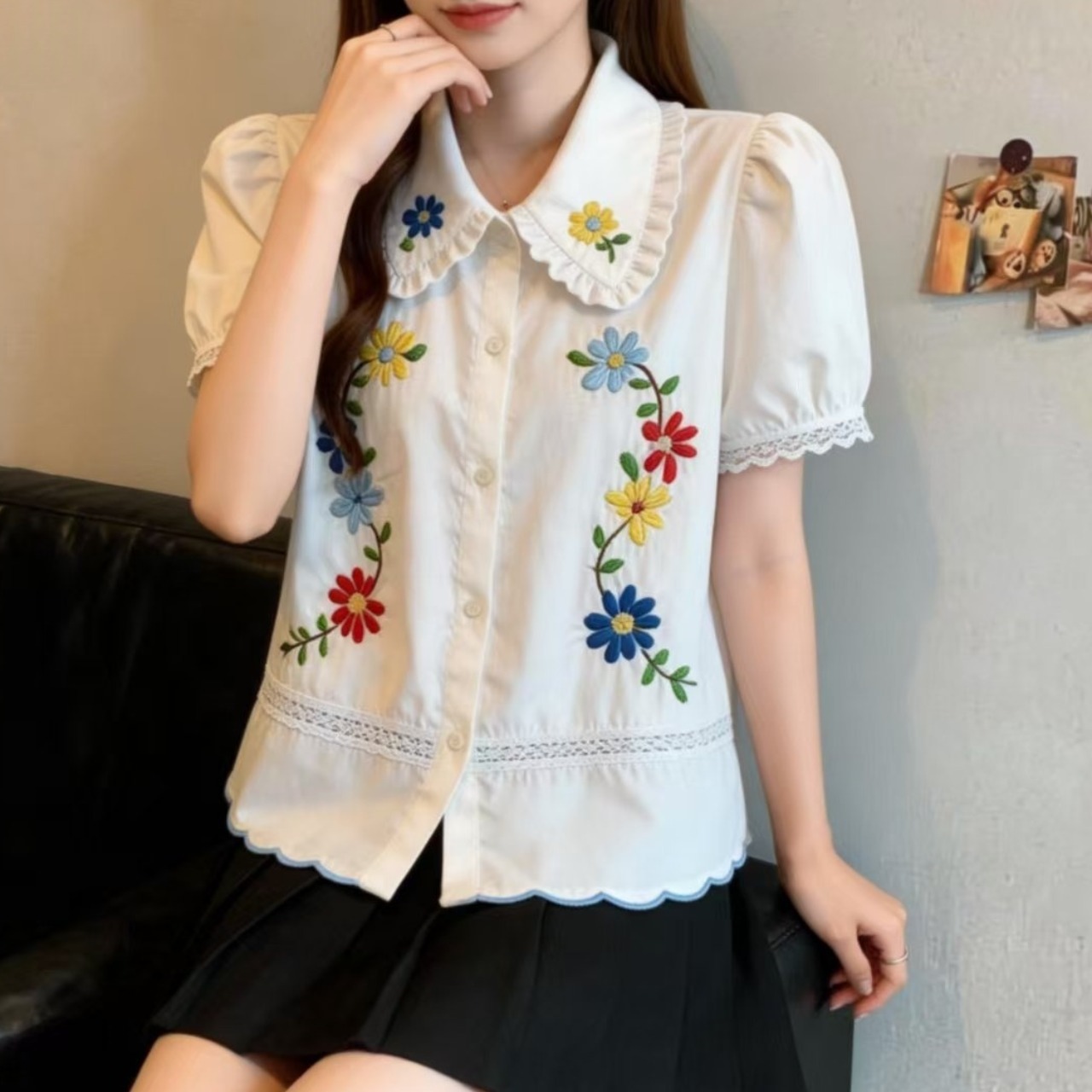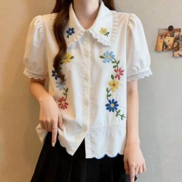 BY12642# 大码复古减龄娃娃领重工刺绣衬衫女夏季新款洋气百搭显瘦上衣 服裝批發女裝批發服飾貨源