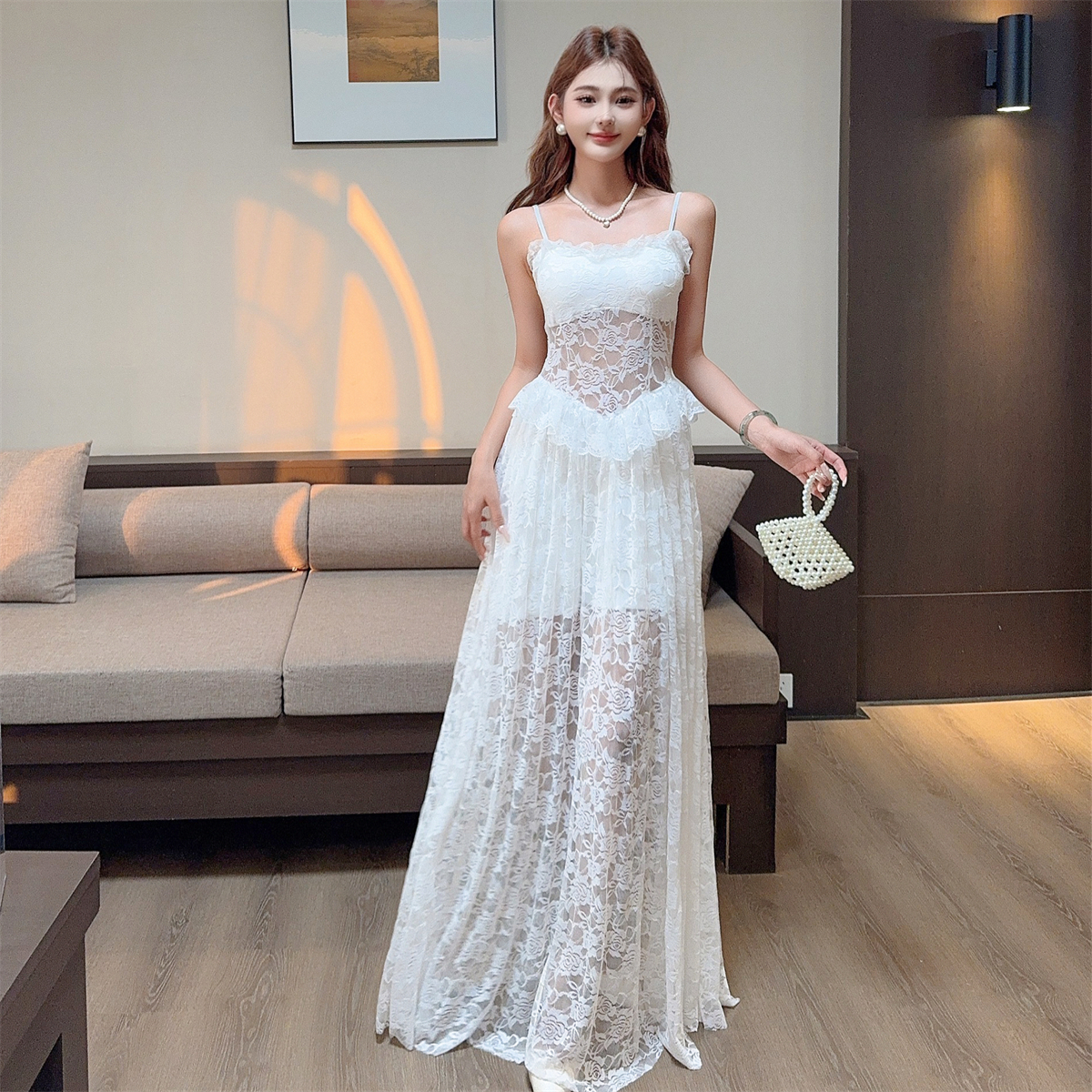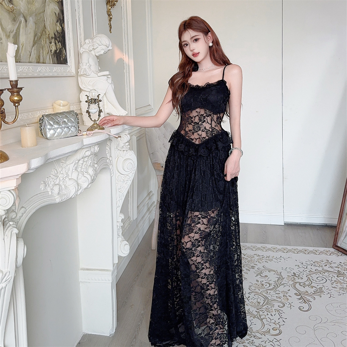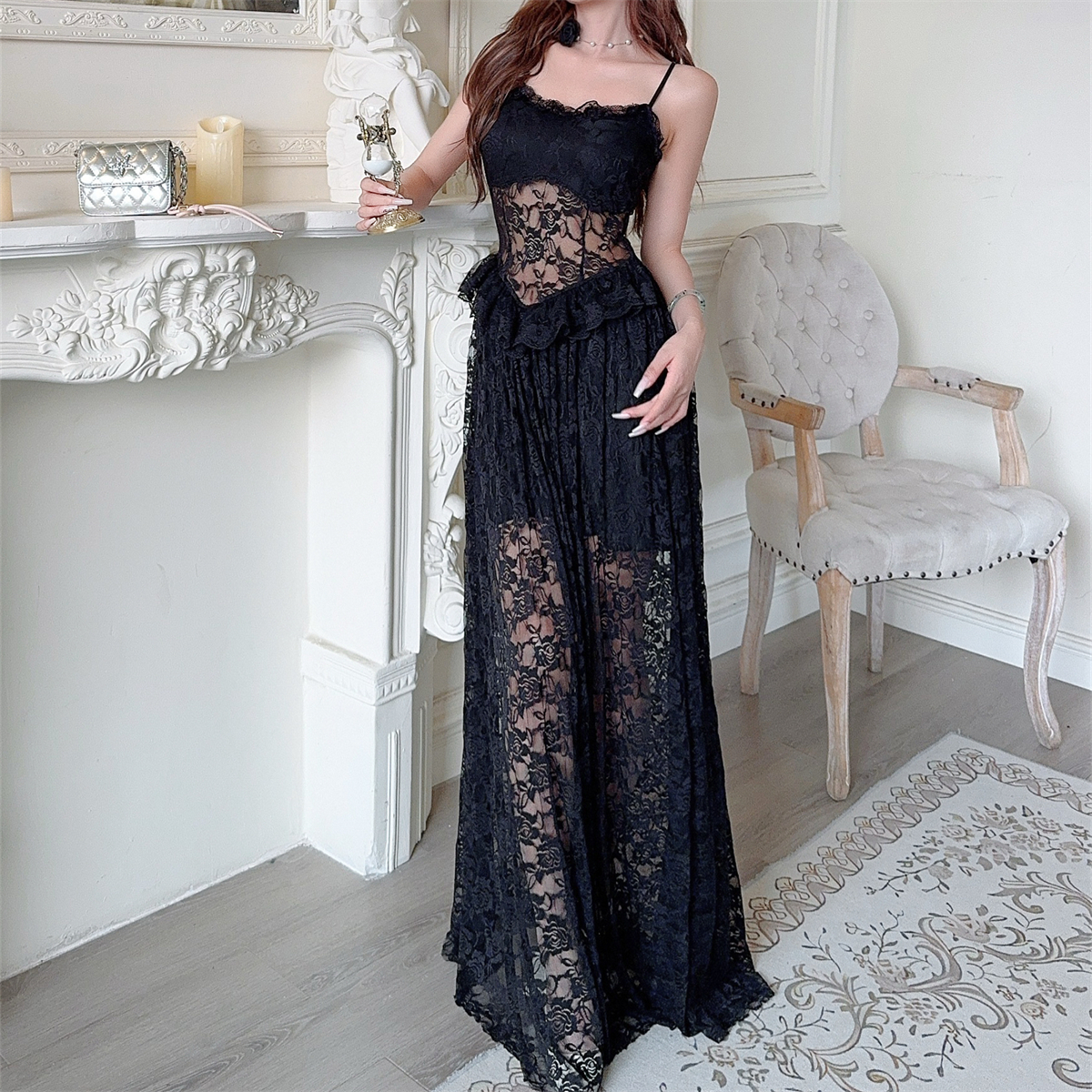 BY13047# 性感暗黑蕾丝连衣裙女修身显瘦层叠荷叶边婚礼约会仙气长裙子 服裝批發女裝批發服飾貨源