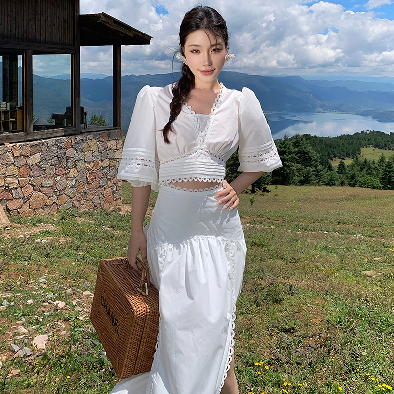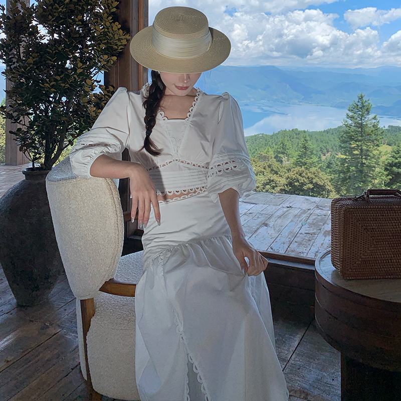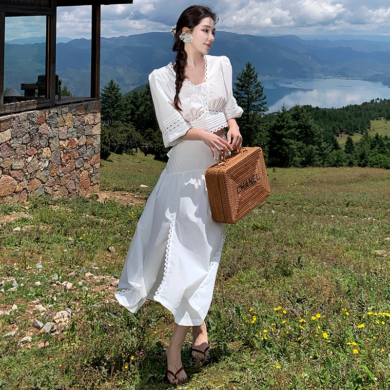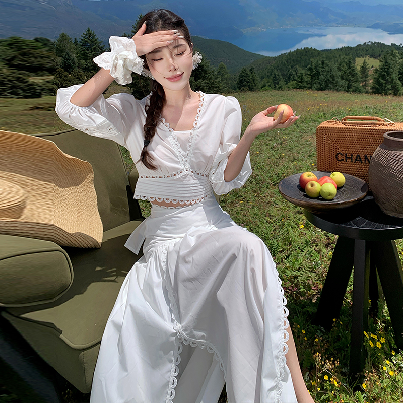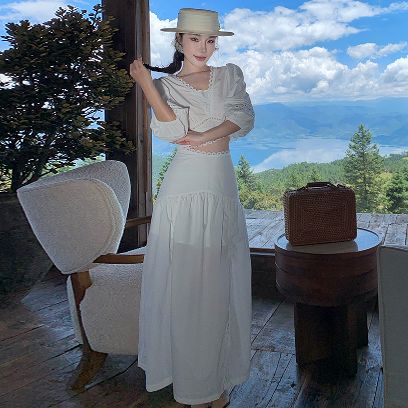 BY13063# 法式时尚气质套装绑带设计感衬衫+白色半身裙 服裝批發女裝批發服飾貨源