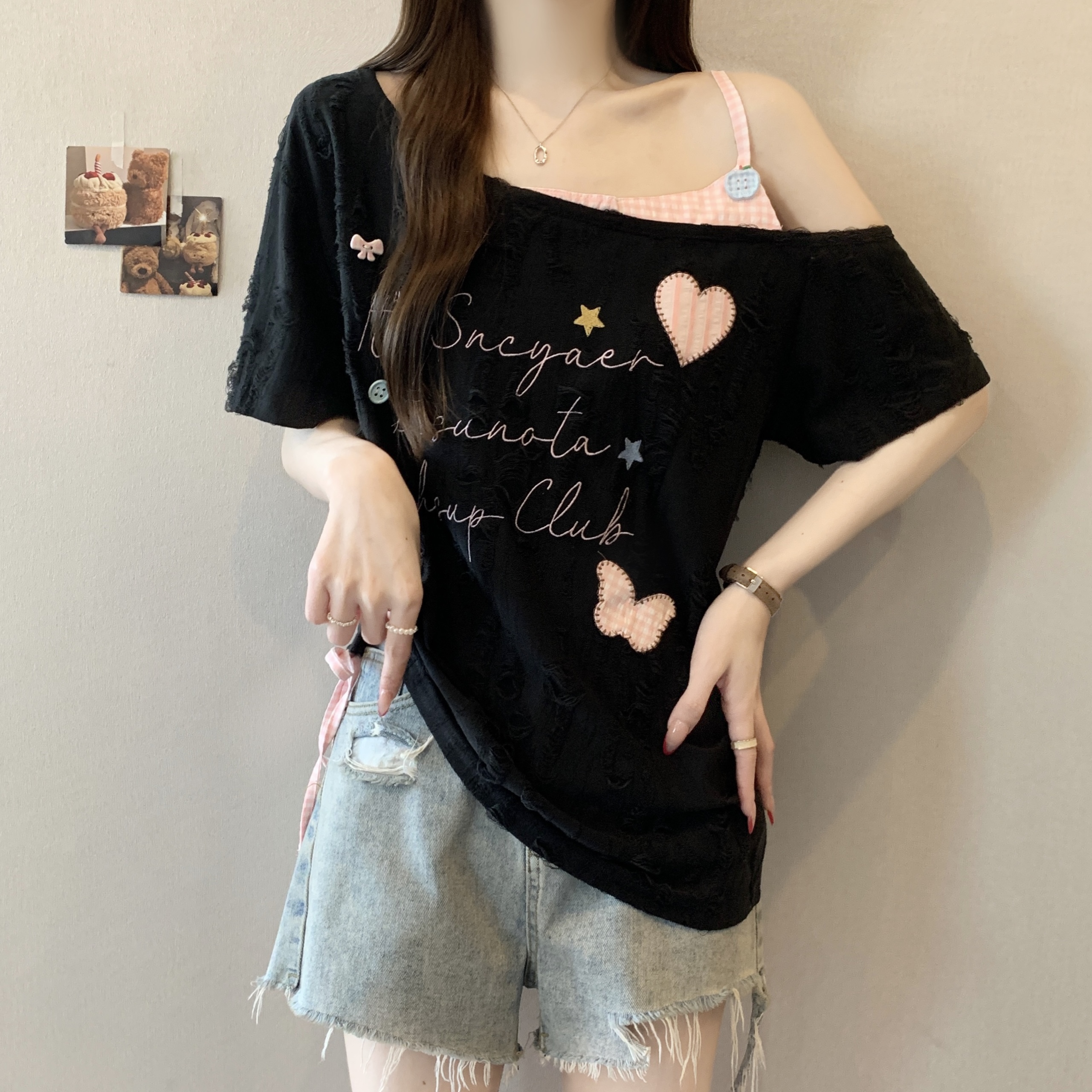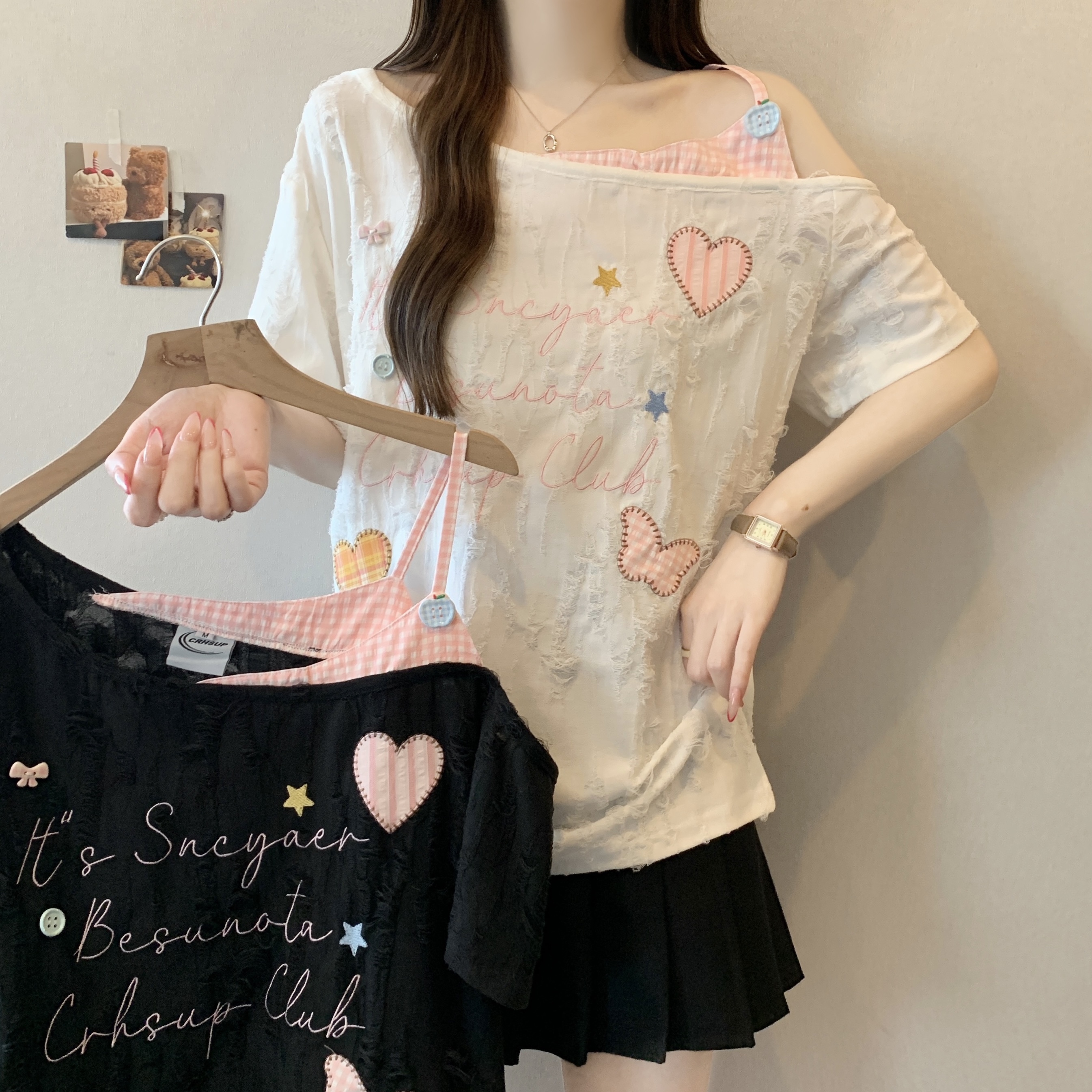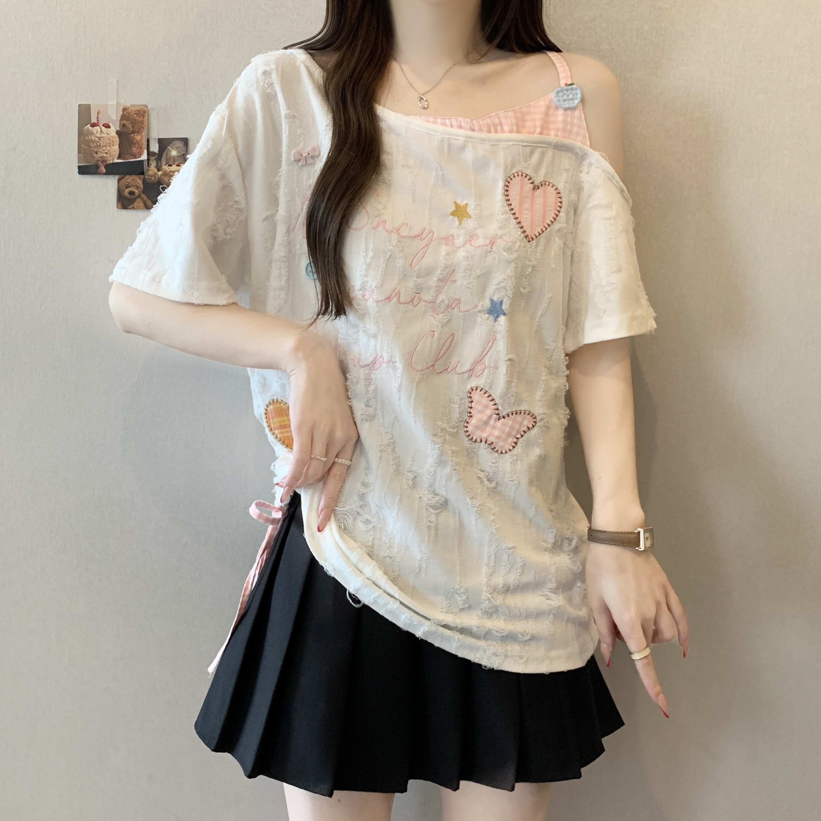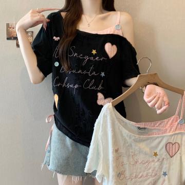Home > 短袖T恤 > BY13318# 胖MM甜美爱心贴布破洞斜肩吊带短袖t恤女夏季抽绳收腰显瘦上衣 服裝批發女裝批發服飾貨源