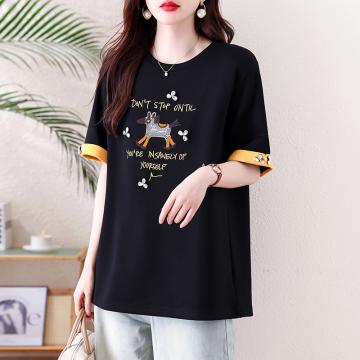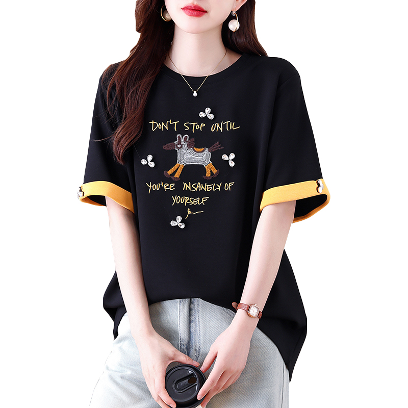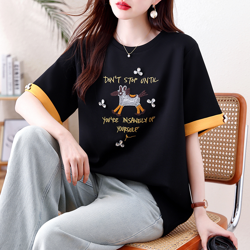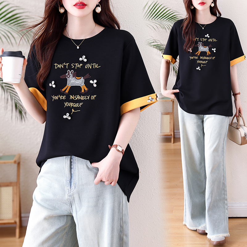 Home > 短袖T恤 > BY13332# 休闲刺绣拼接短袖T恤女春季新款上衣大码欧货宽松女装 服裝批發女裝批發服飾貨源