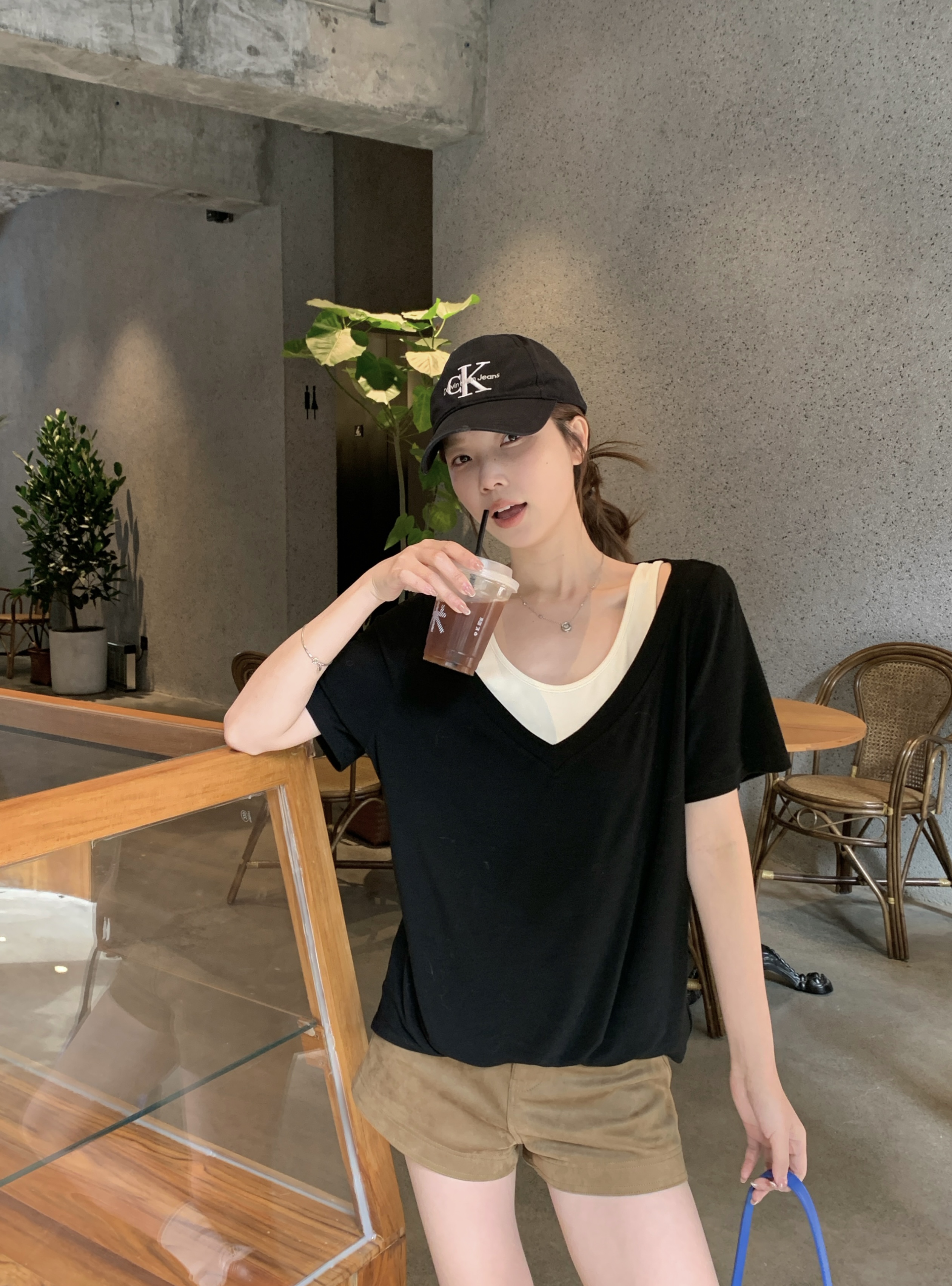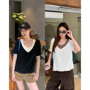 BY13345# 夏装新款胖mm大码女撞色假两件镂空短袖T恤设计感V领上衣 服裝批發女裝批發服飾貨源