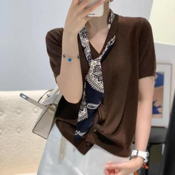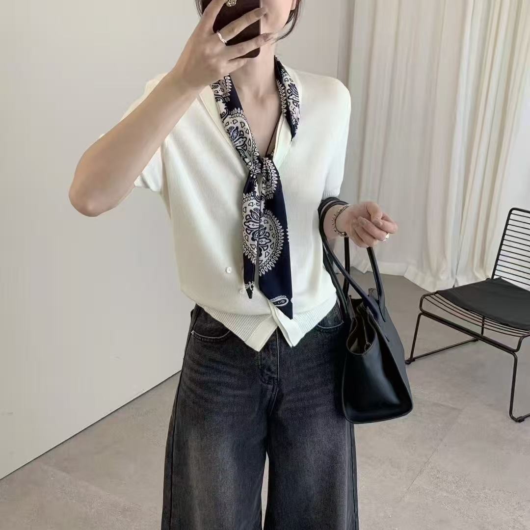 BY13473# 高端早秋新款V领单排扣开衫短袖针织衫女上衣送丝巾 服裝批發女裝批發服飾貨源