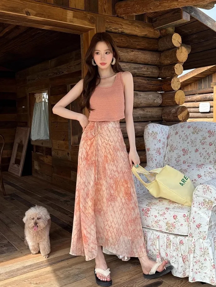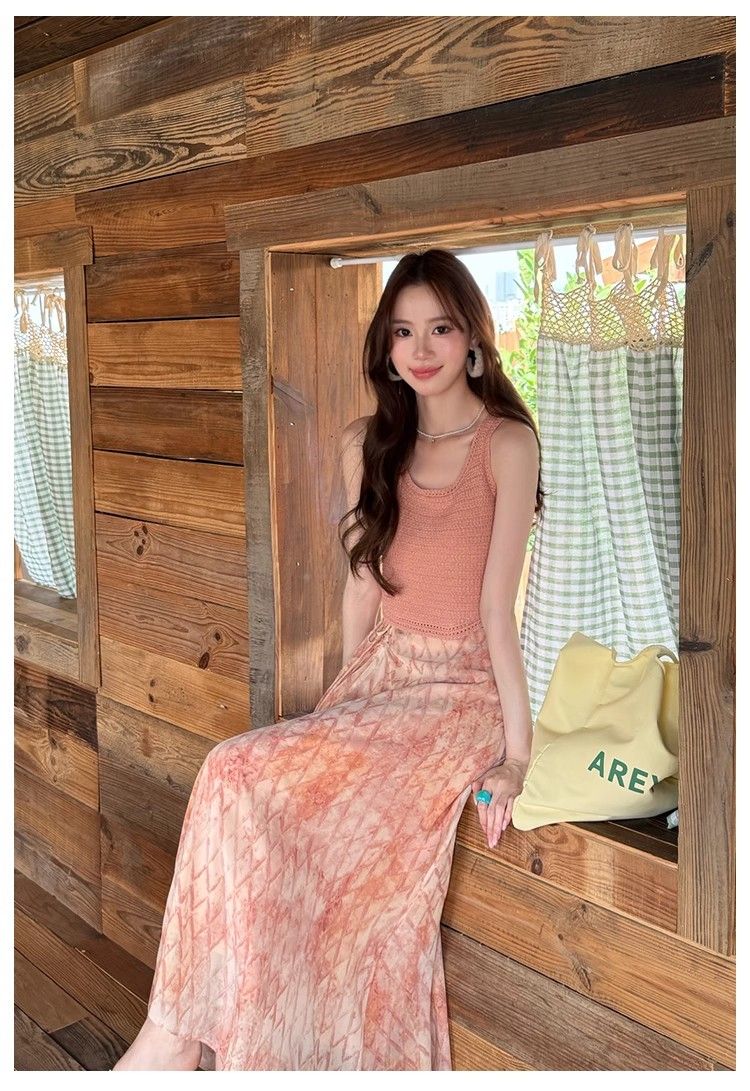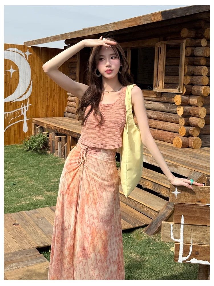 粉色吊带背心+碎花半身裙