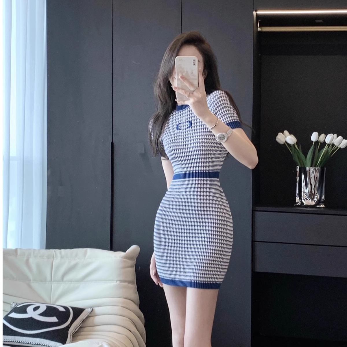 BY13492# 蓝色显瘦设计感显瘦针织弹力连衣裙气质时尚夏季休闲修身裙子 服裝批發女裝批發服飾貨源