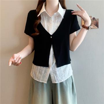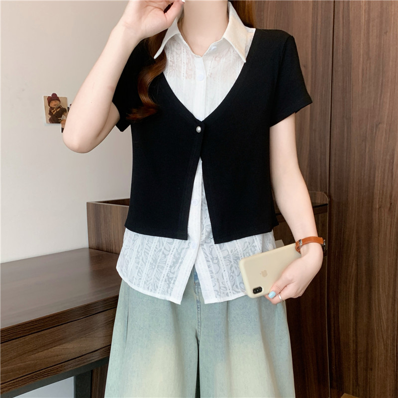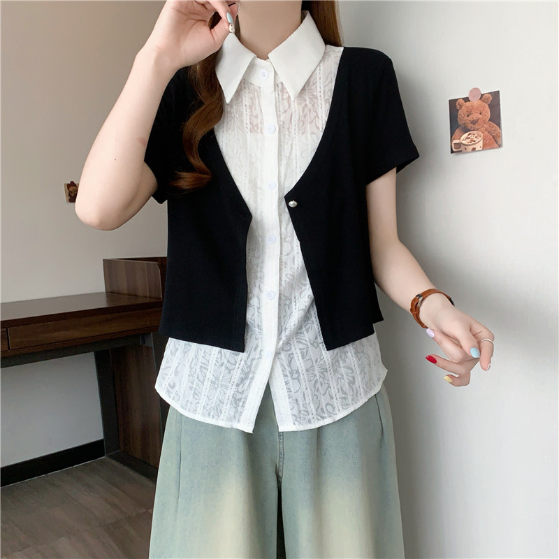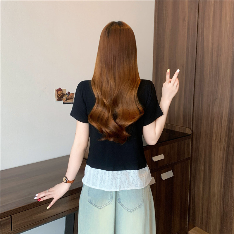 夏装新款大码女装胖mm黑色假两件蕾丝t恤衬衫设计感衬衣 服裝批發女裝批發服飾貨源