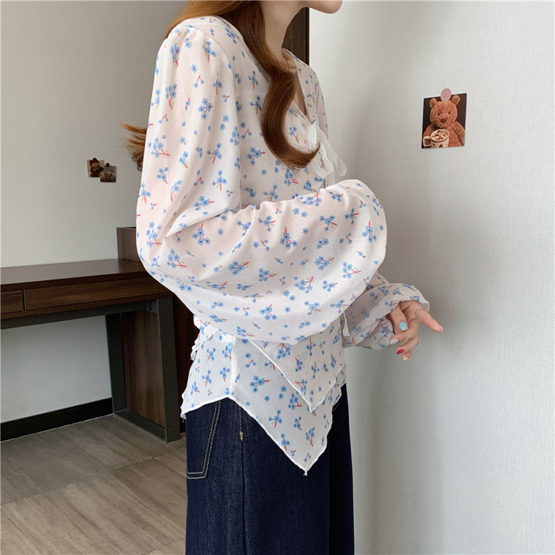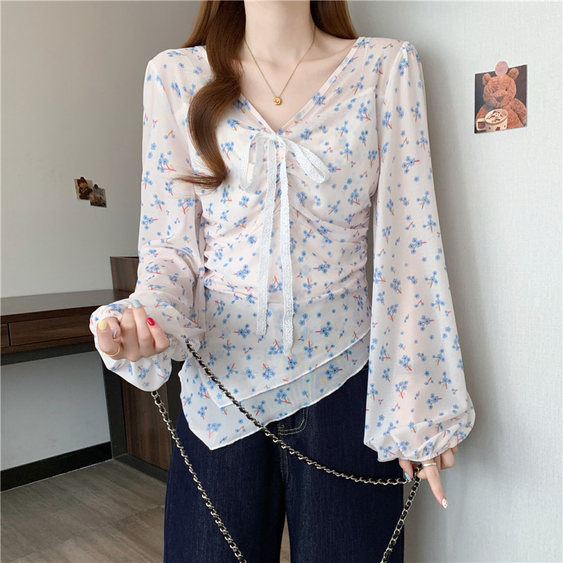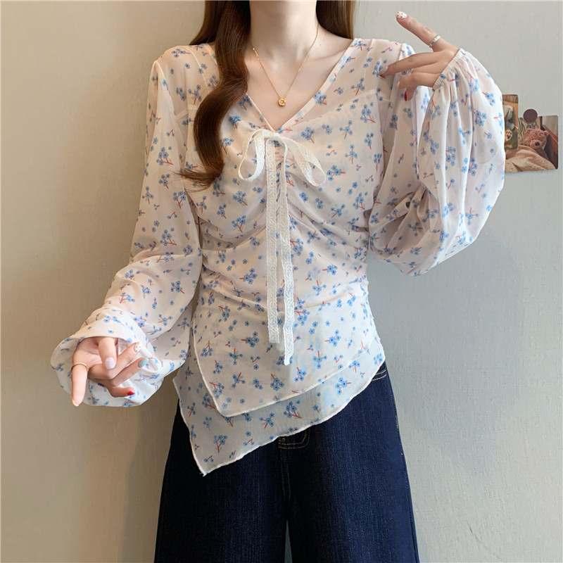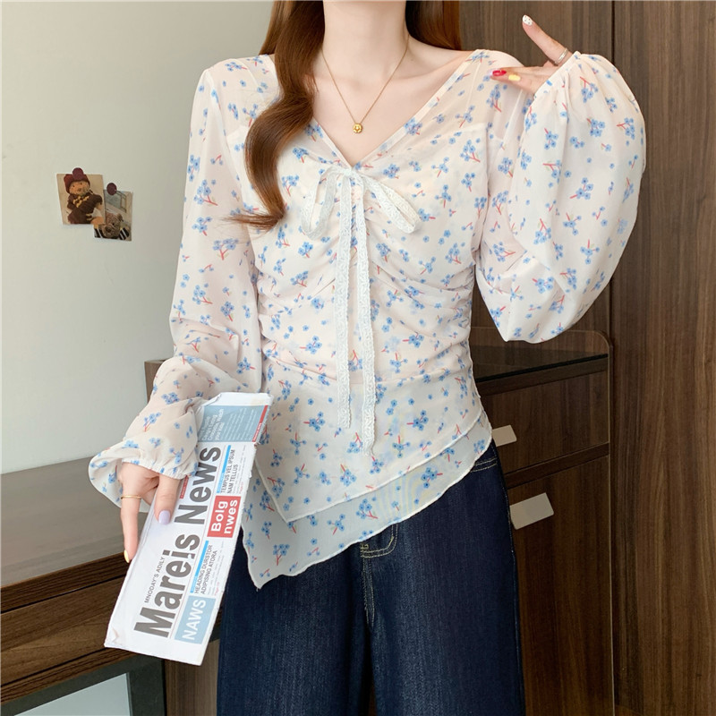 春装新款大码女装胖mm设计感小众衬衫V领碎花雪纺衫上衣 服裝批發女裝批發服飾貨源