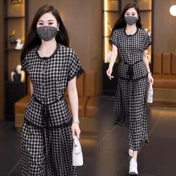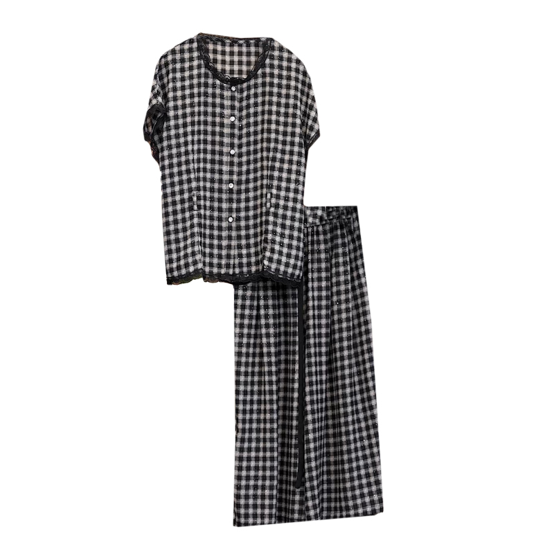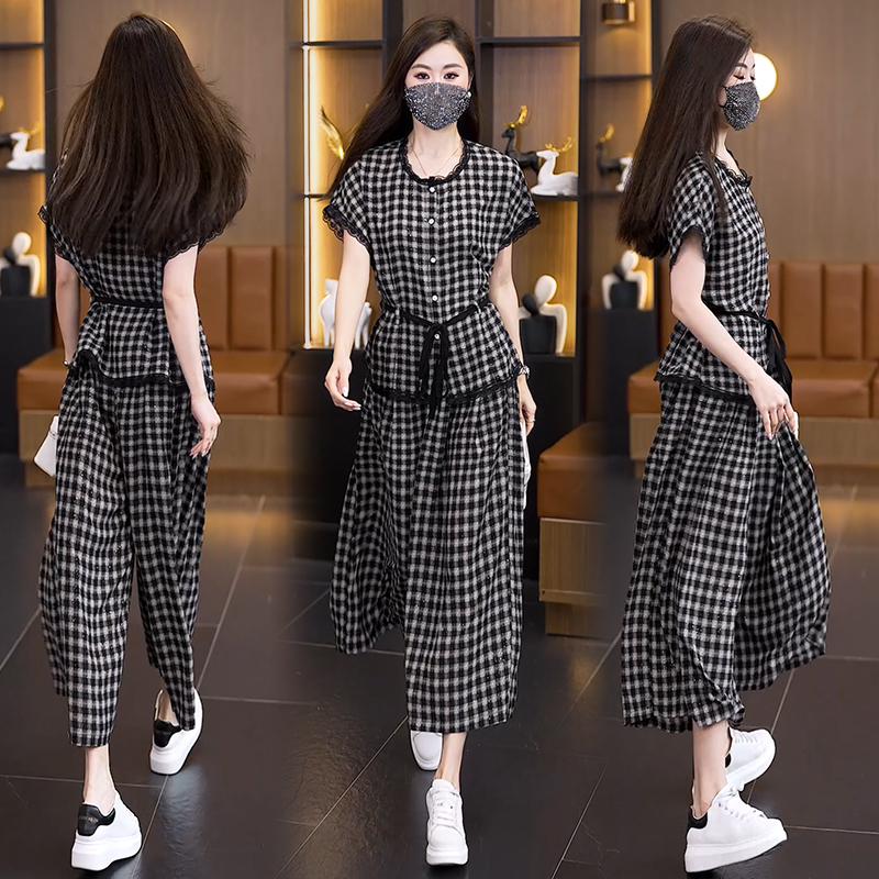 BY14076# 大码套装女夏蕾丝边短袖上衣+高腰阔腿裤宽松遮肚两件套 服裝批發女裝批發服飾貨源