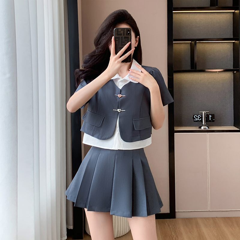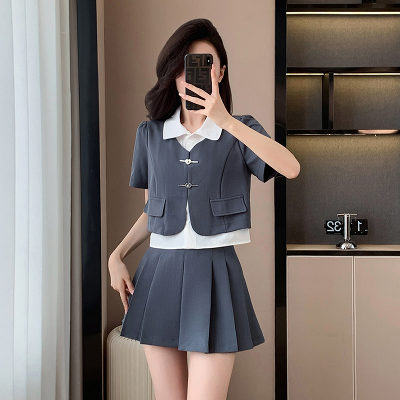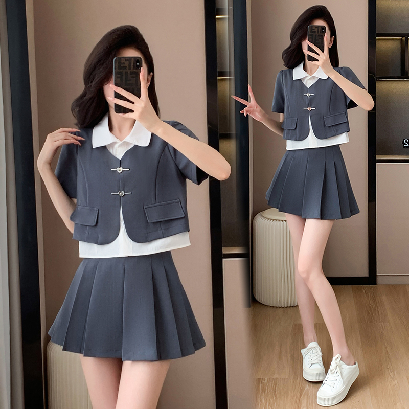 BY14088# 拼接假两件上衣+显瘦百褶裙两件套套装 服裝批發女裝批發服飾貨源