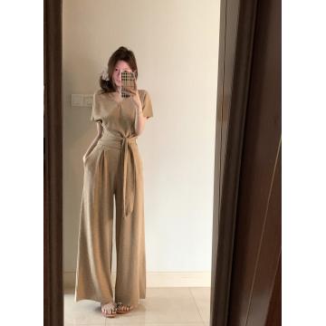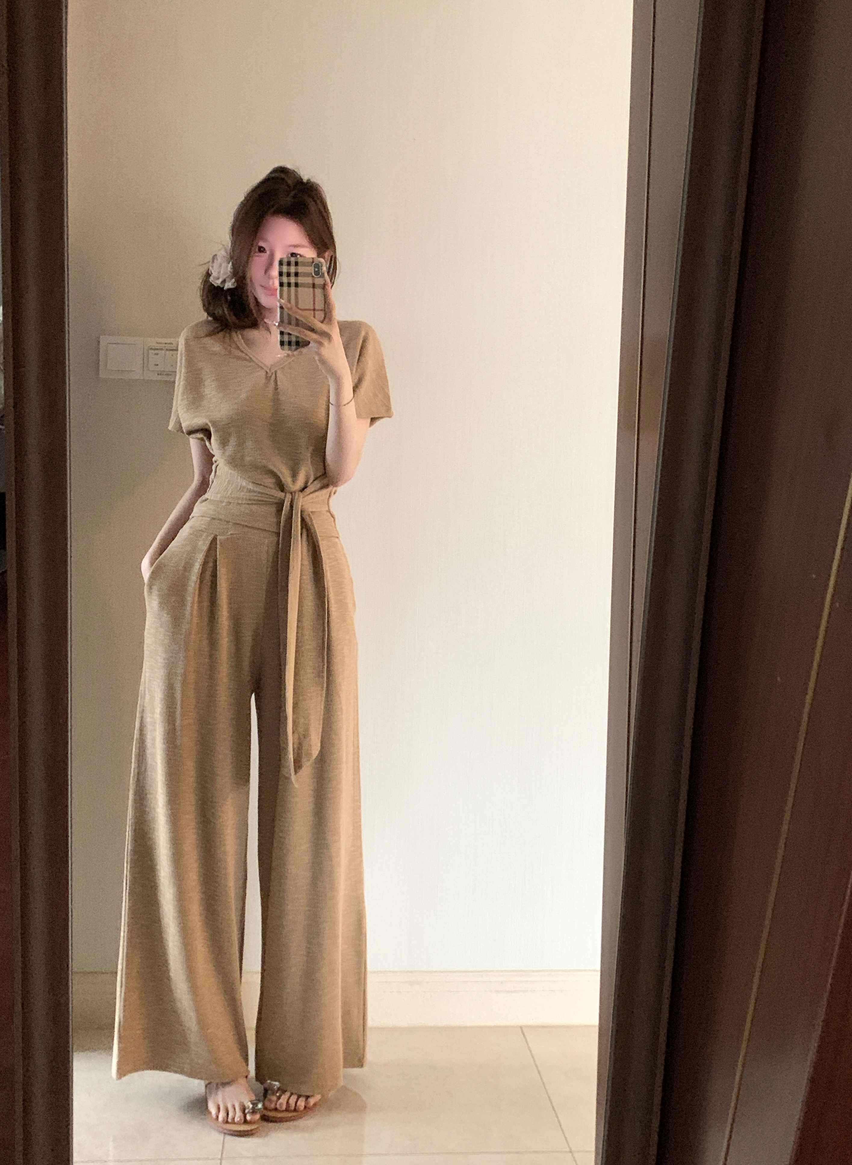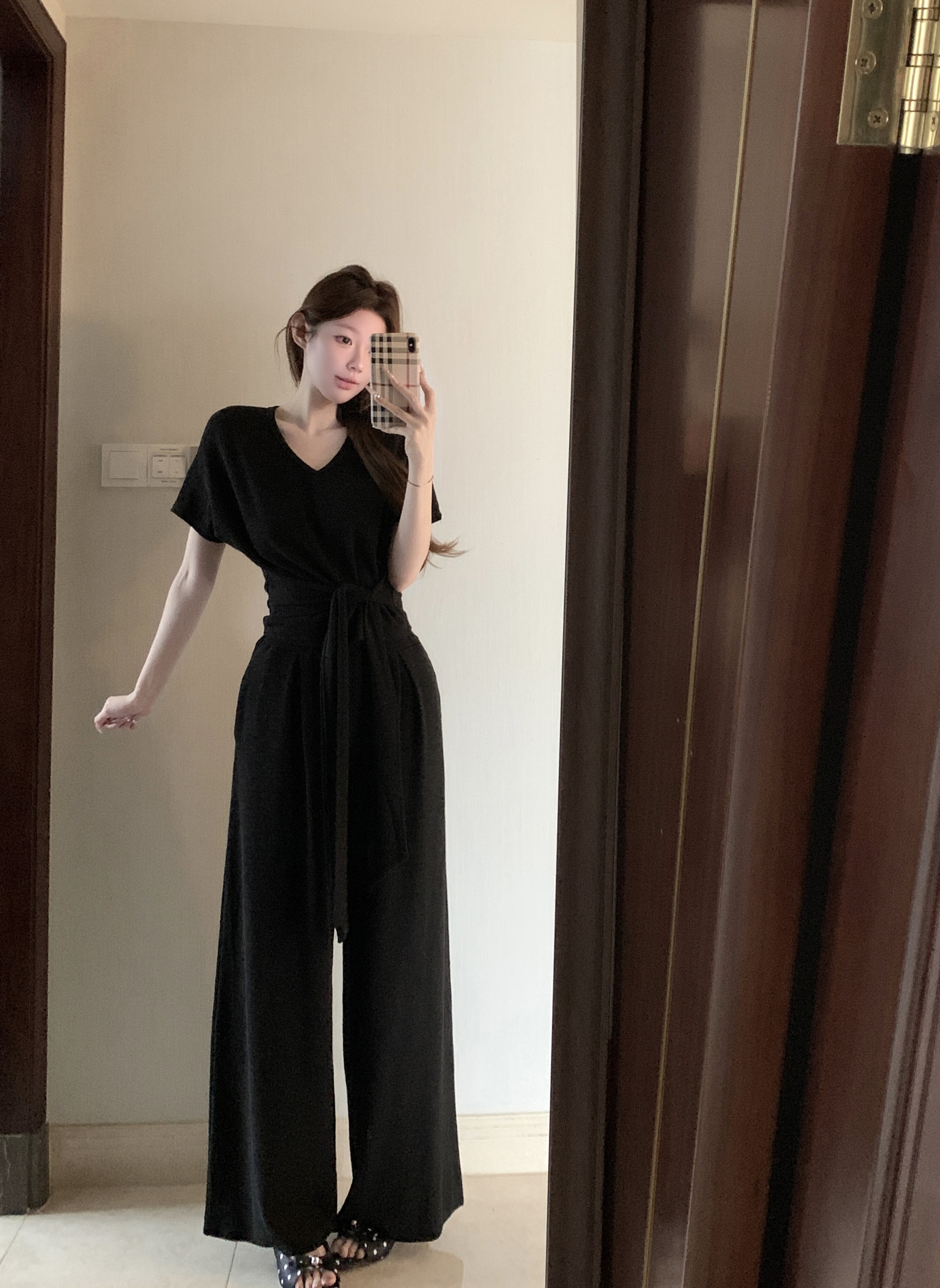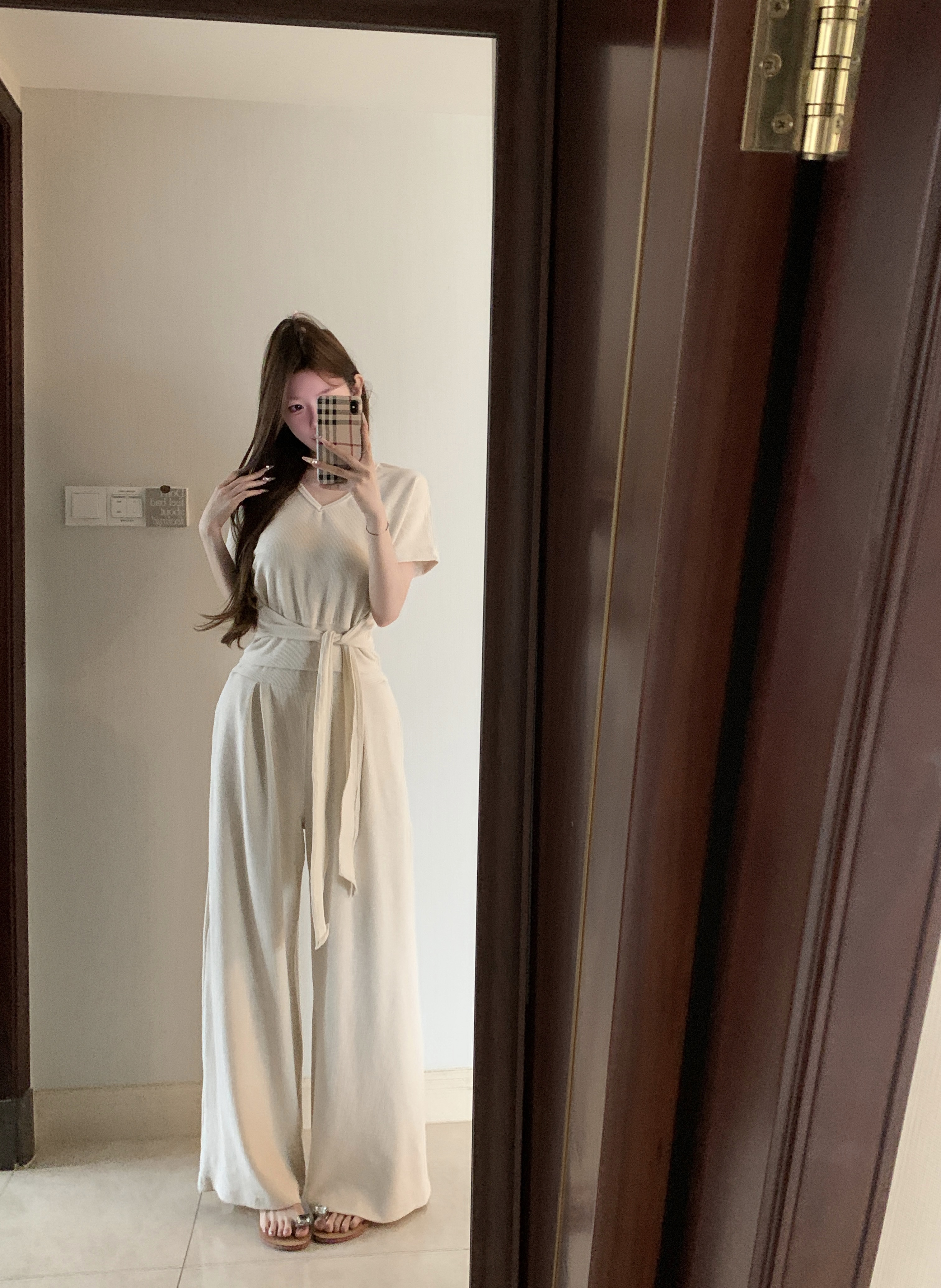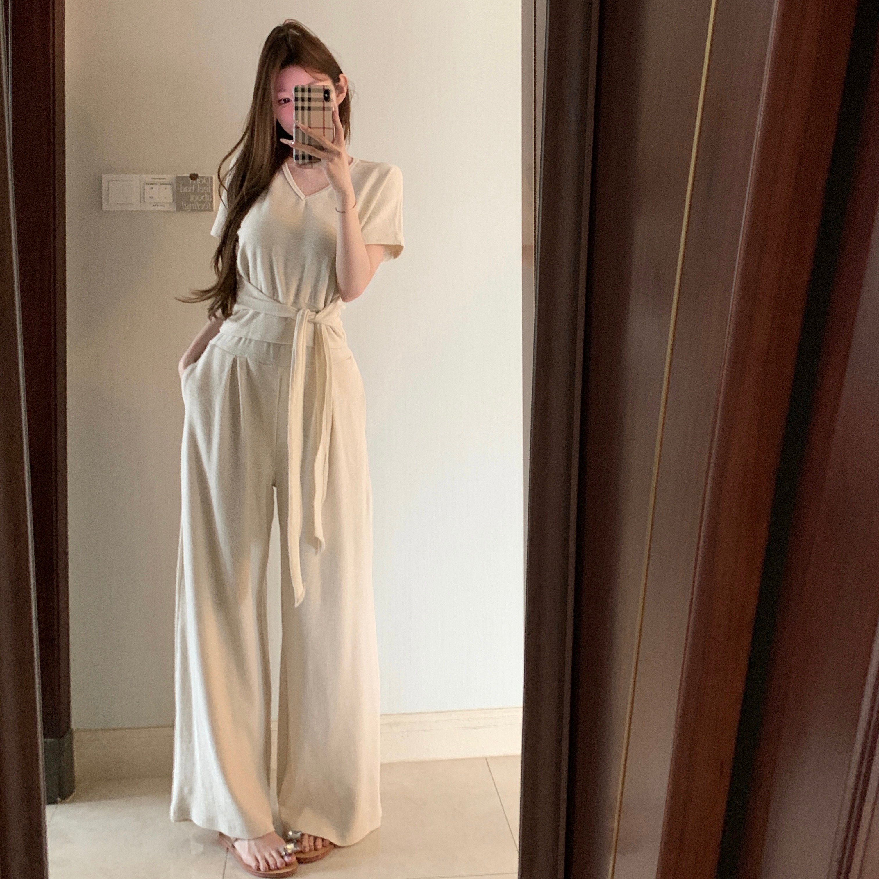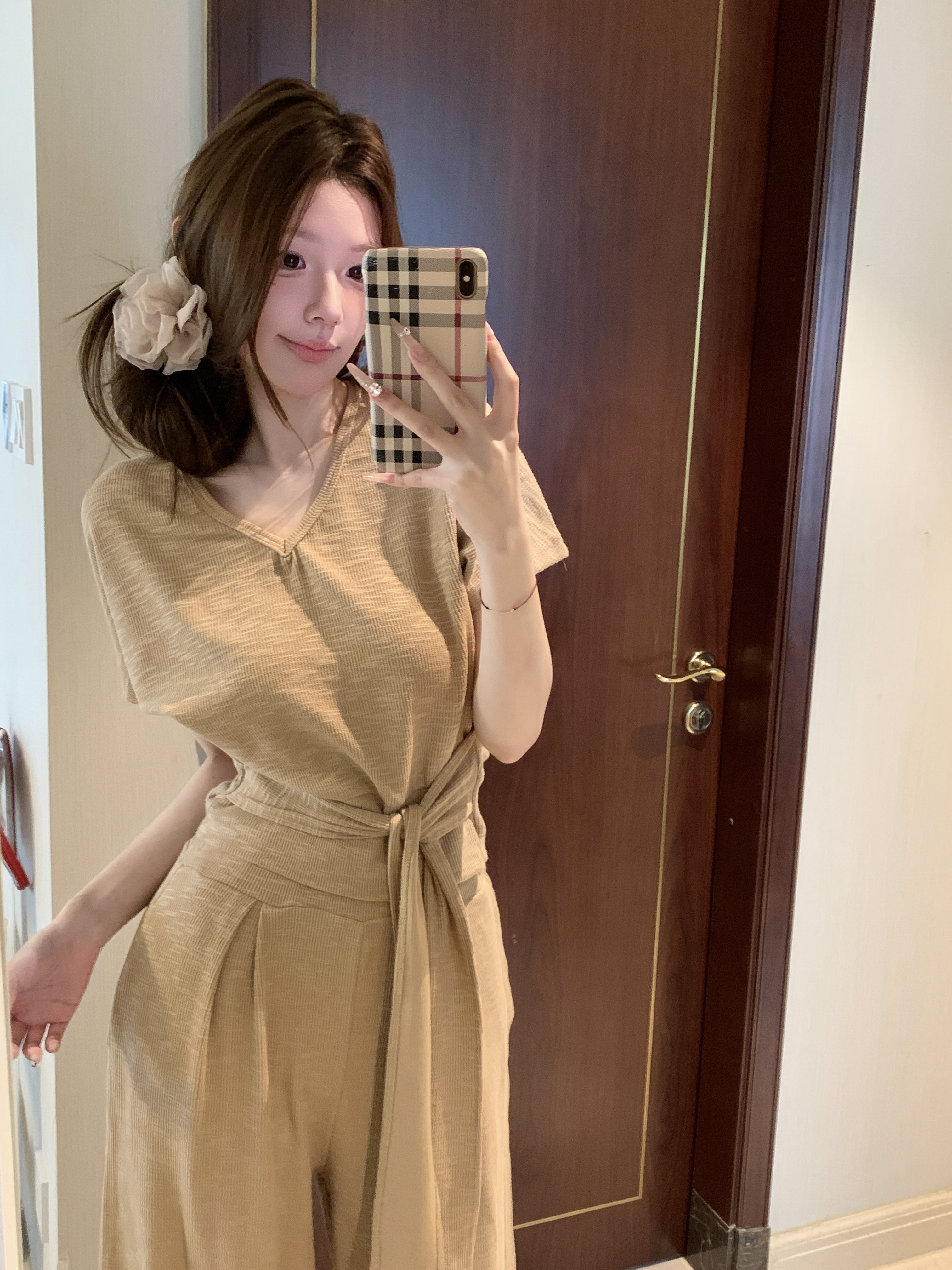 BY14099# 时尚绑带收腰套装百搭V领显瘦上衣+阔腿裤两件套装 服裝批發女裝批發服飾貨源