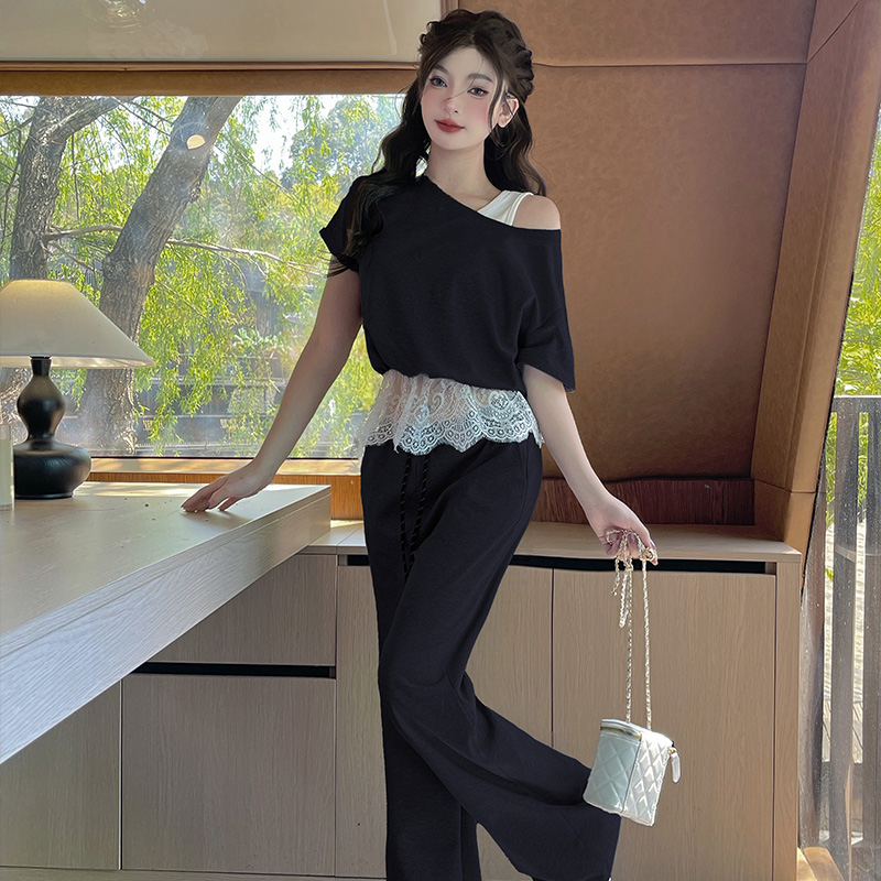 BY14106# 夏季蕾丝休闲日常百搭假两件上衣高腰阔腿裤两件套 服裝批發女裝批發服飾貨源