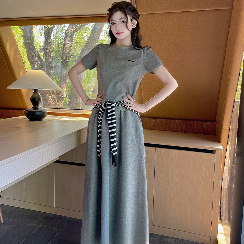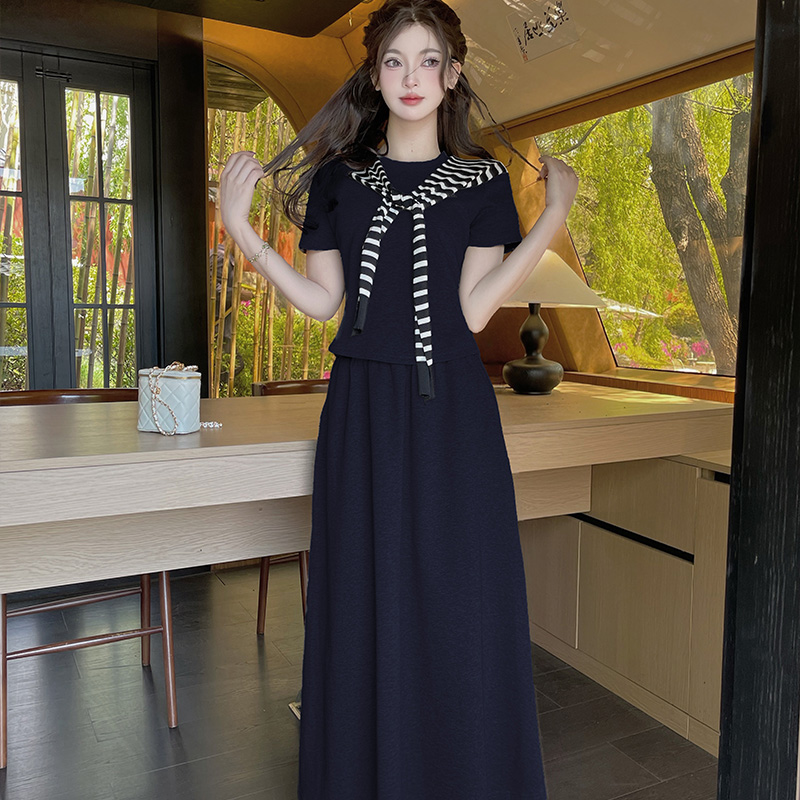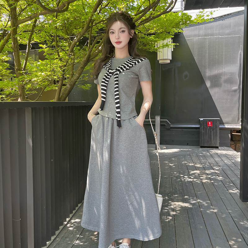 BY14110# 夏季休闲百搭短袖条纹披肩简约时尚半身裙套装三件套 服裝批發女裝批發服飾貨源