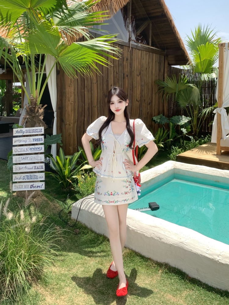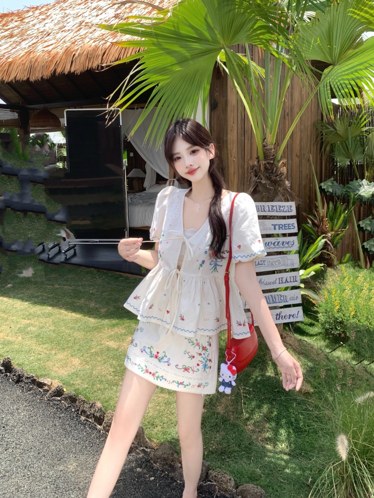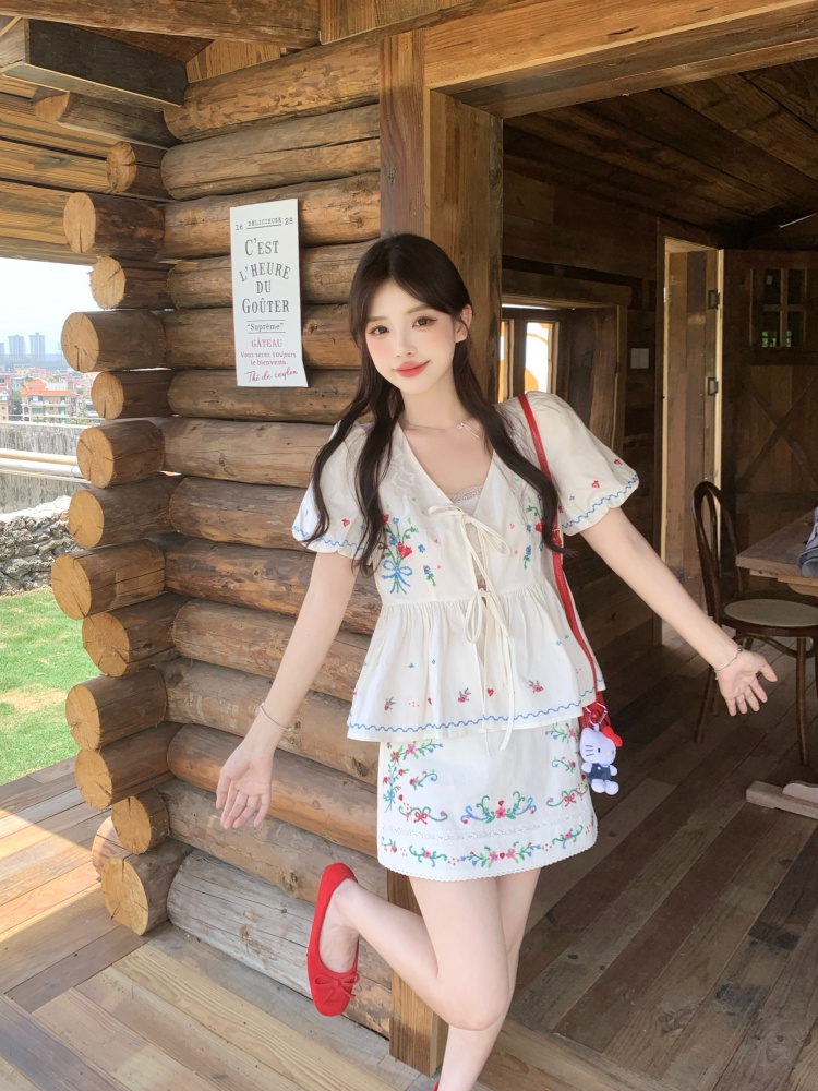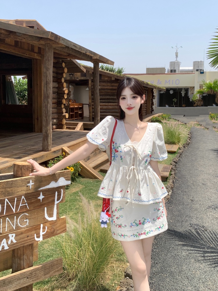 BY14139# 棉麻刺绣短袖重工绣花衬衫高腰直筒半身裙套装胖mm夏季两件套 服裝批發女裝批發服飾貨源