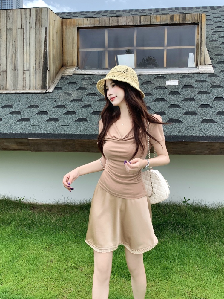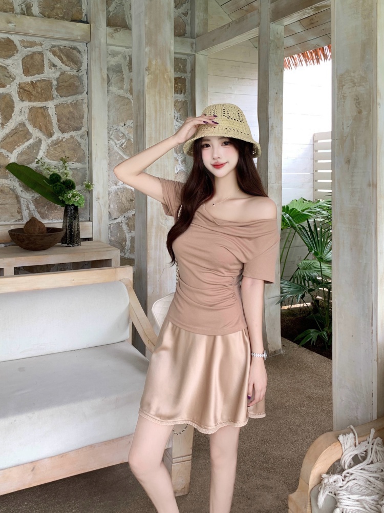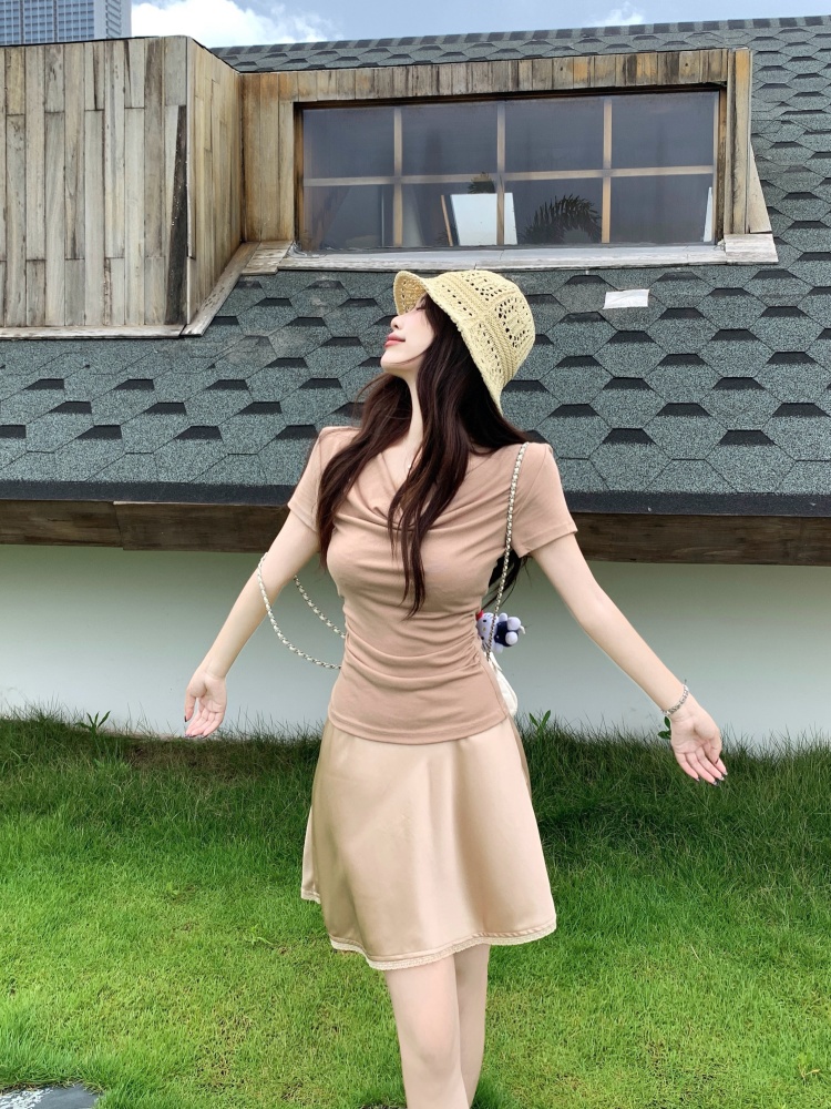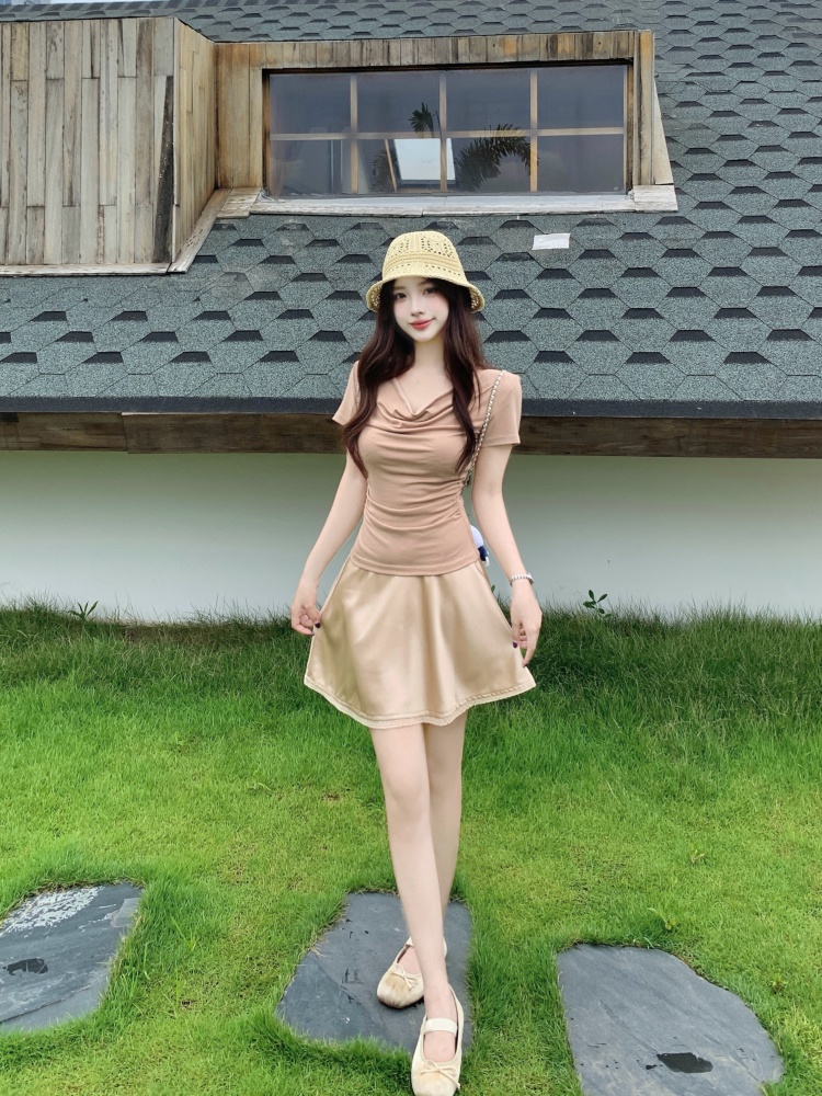 驼色上衣+香槟色半身裙