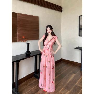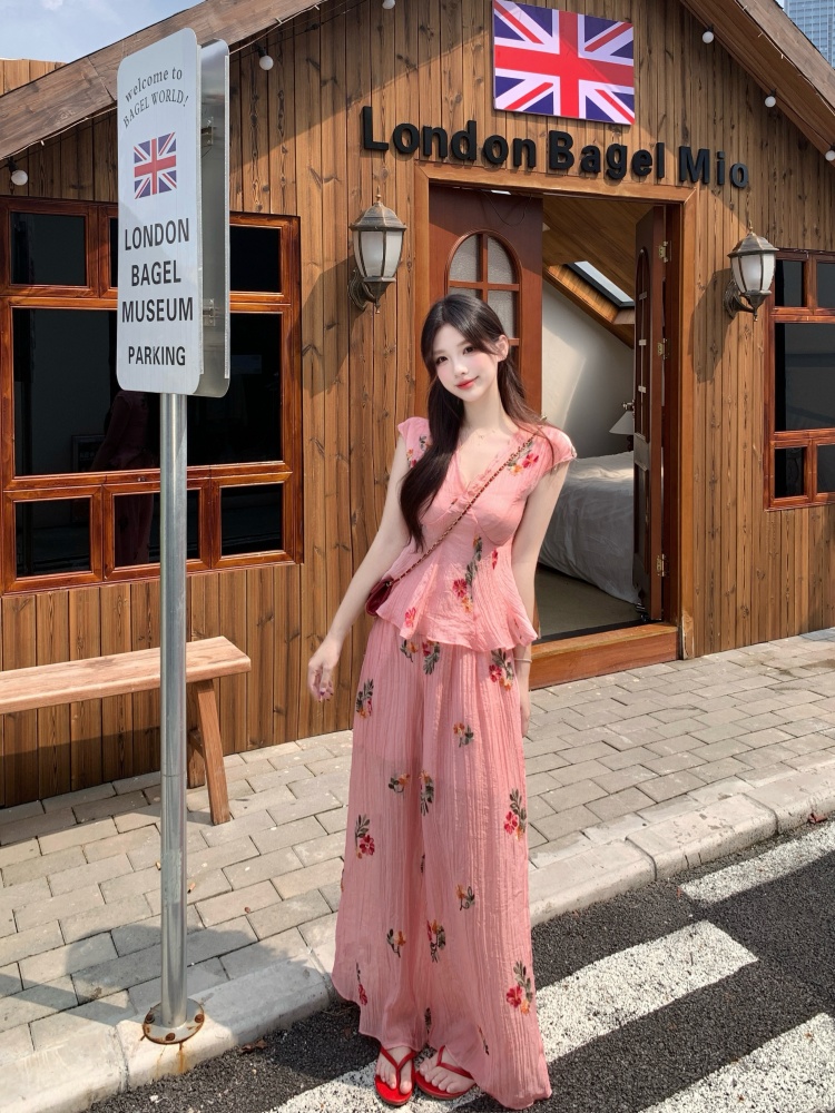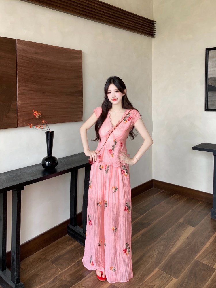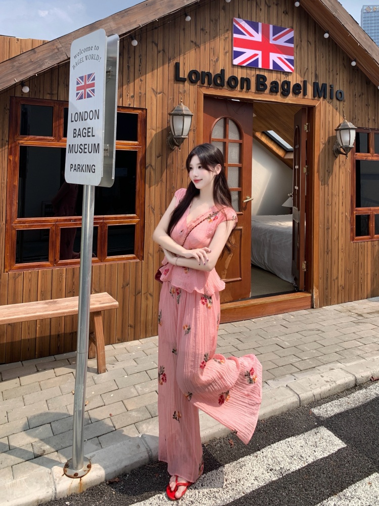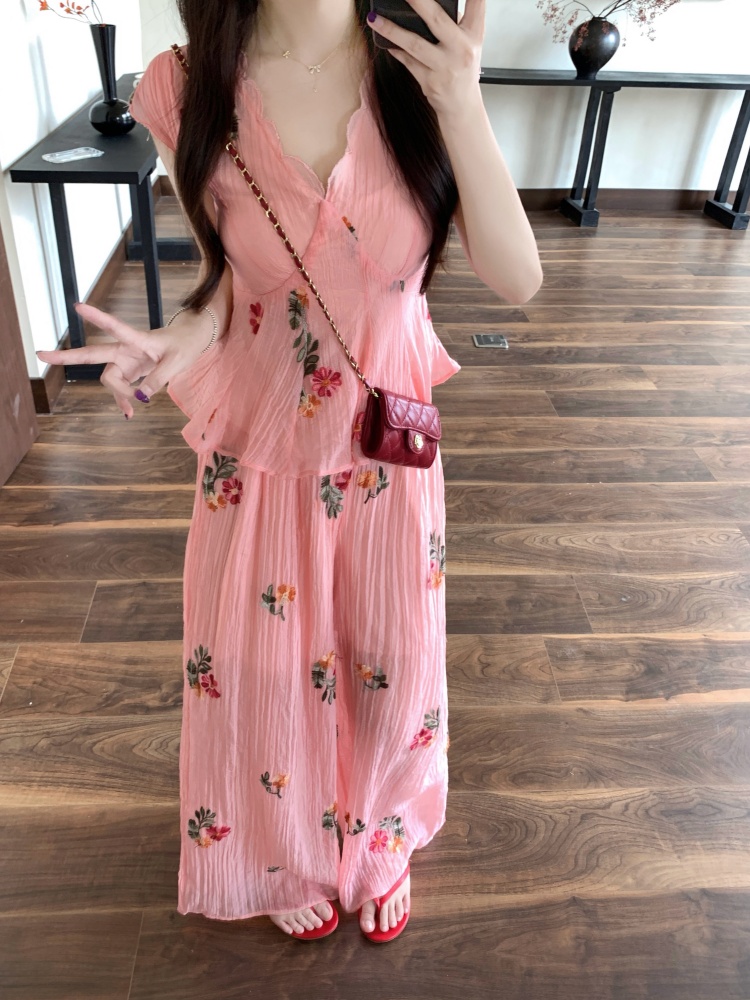 BY14142# 度假风套装重工刺绣胖mm肌理感碎花衬衫V领短袖上衣阔腿裤 服裝批發女裝批發服飾貨源