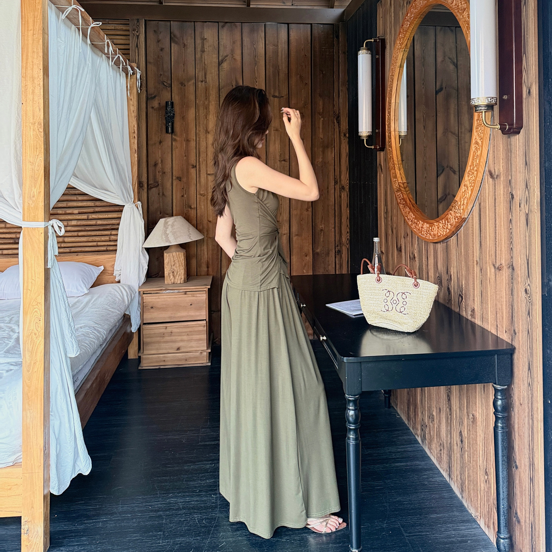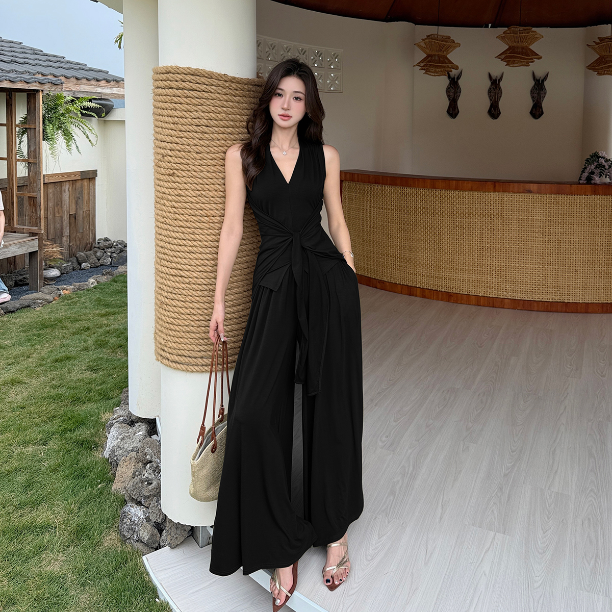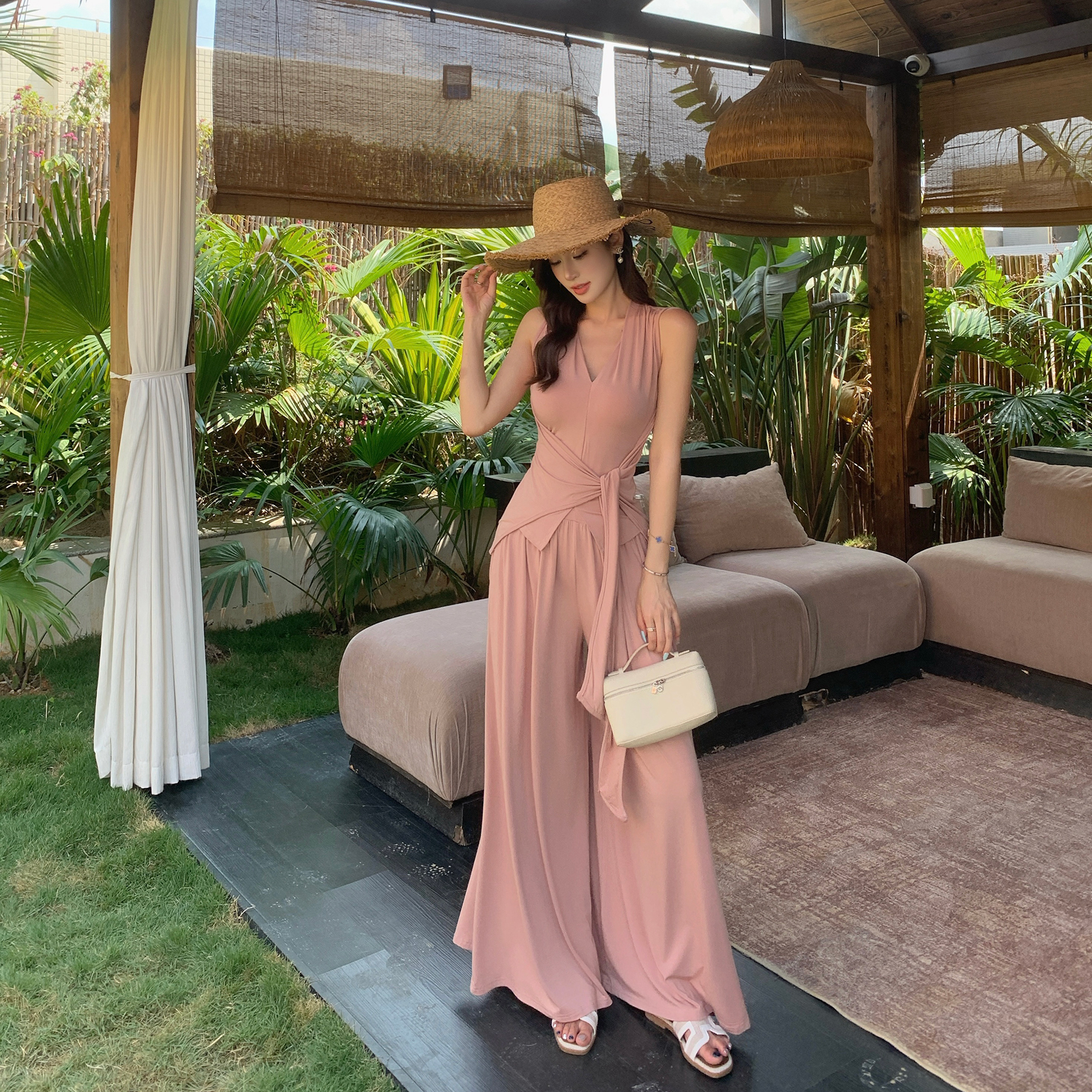 夏新款气质V领无袖上衣系带收腰显瘦高腰阔腿裤长裤两件套装女 服裝批發女裝批發服飾貨源