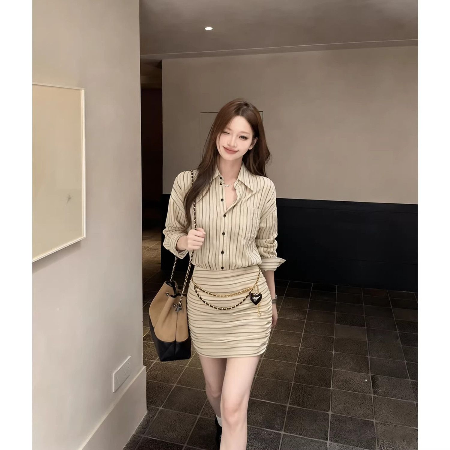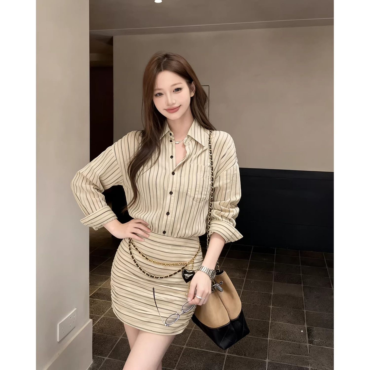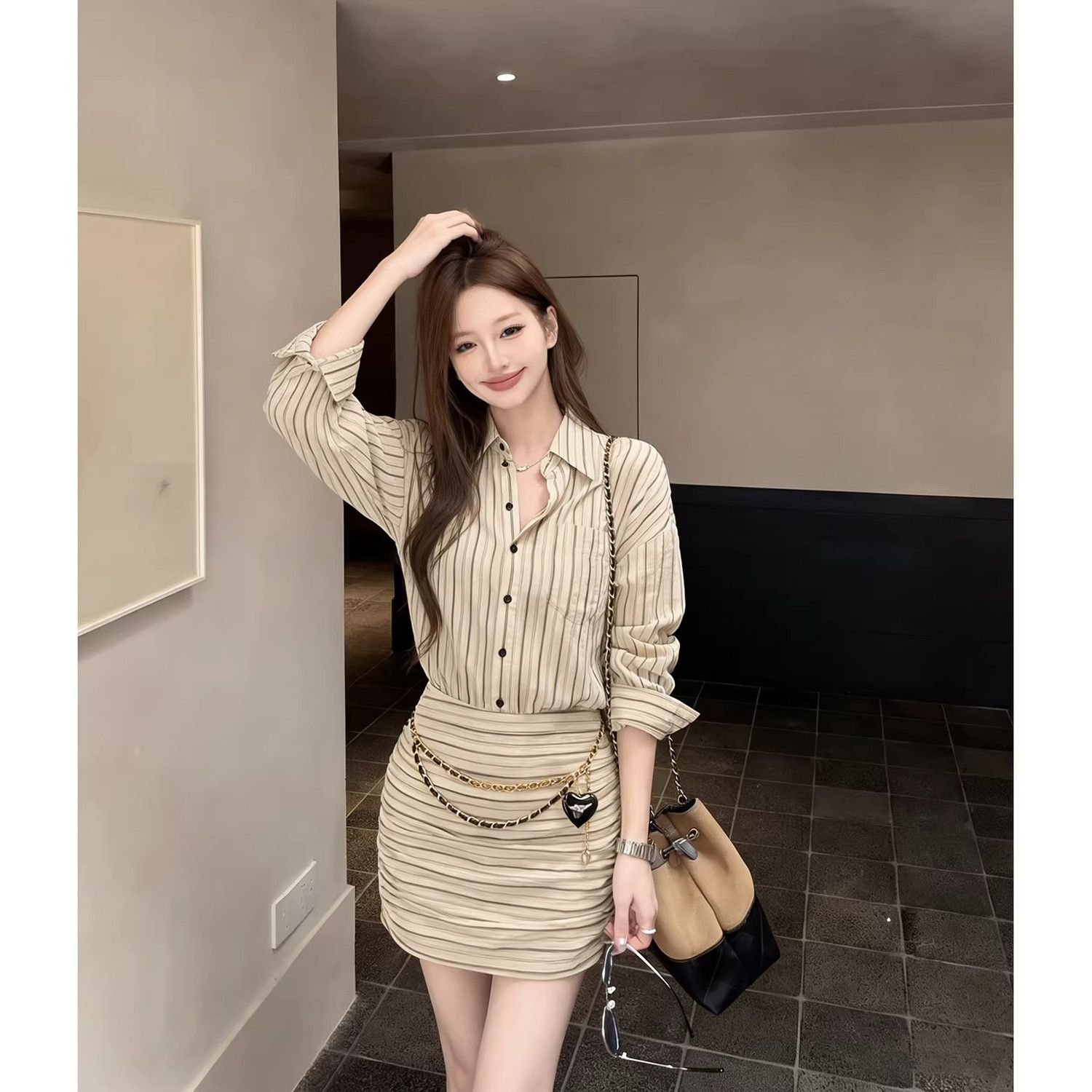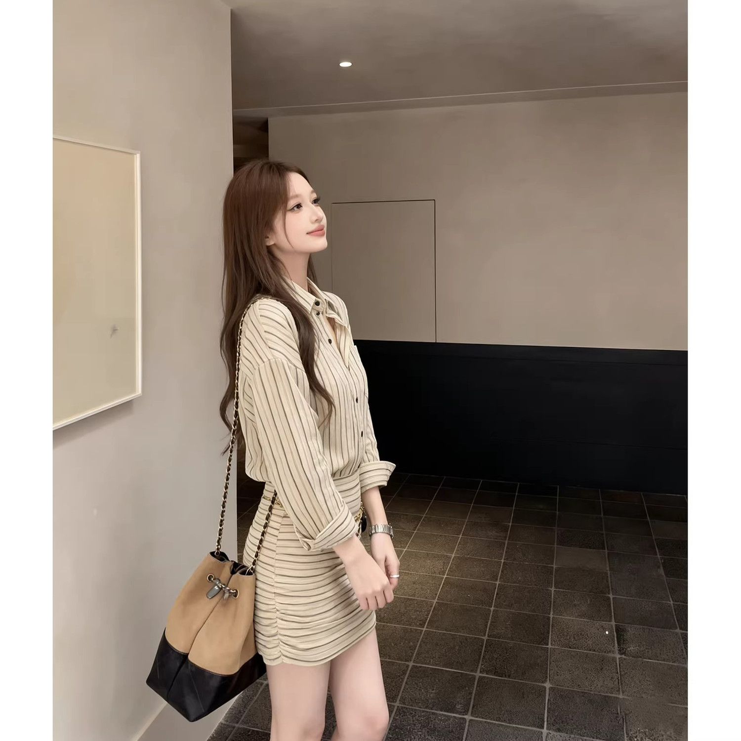 复古撞色条纹长袖包臂短裙高智感收腰显瘦翻领宽松衬衫连衣裙女 服裝批發女裝批發服飾貨源