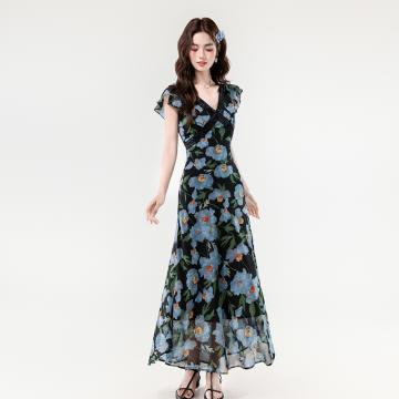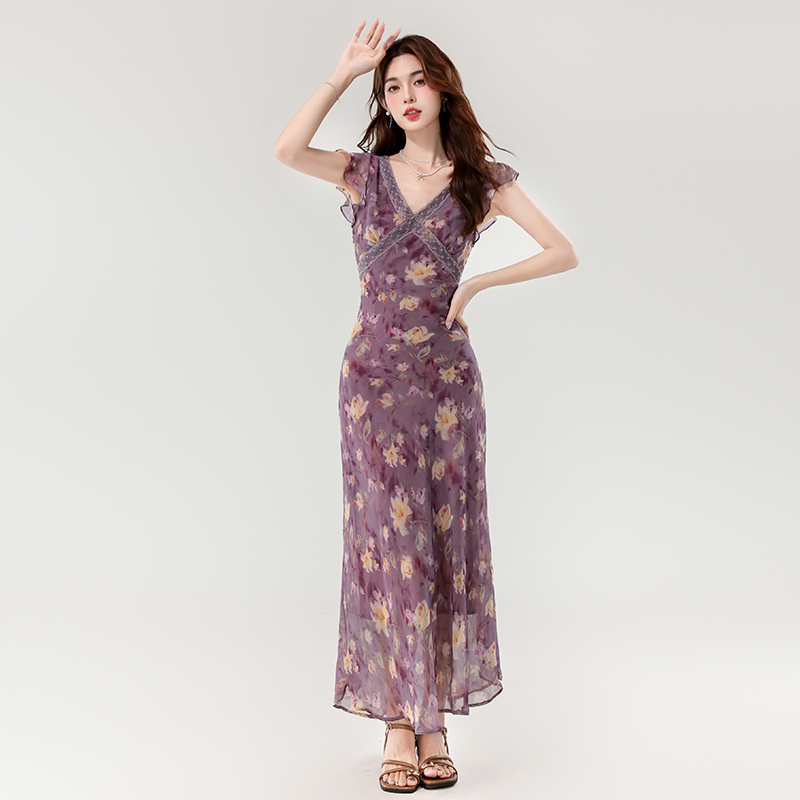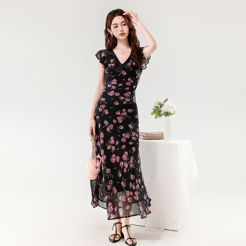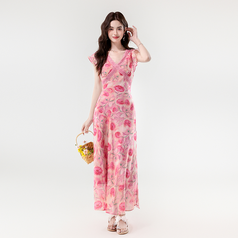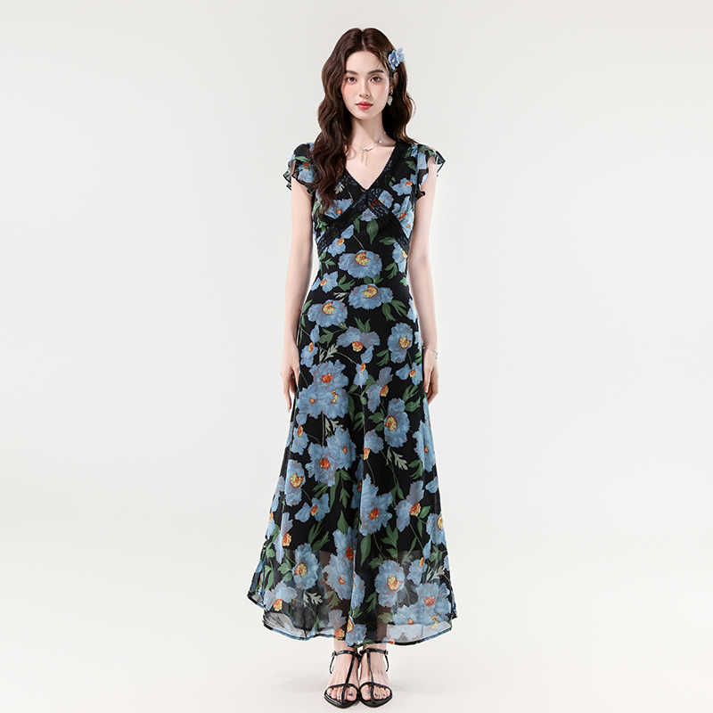 夏新款法式v领优雅浪漫花朵小飞袖蕾丝边长款显瘦连衣裙 服裝批發女裝批發服飾貨源