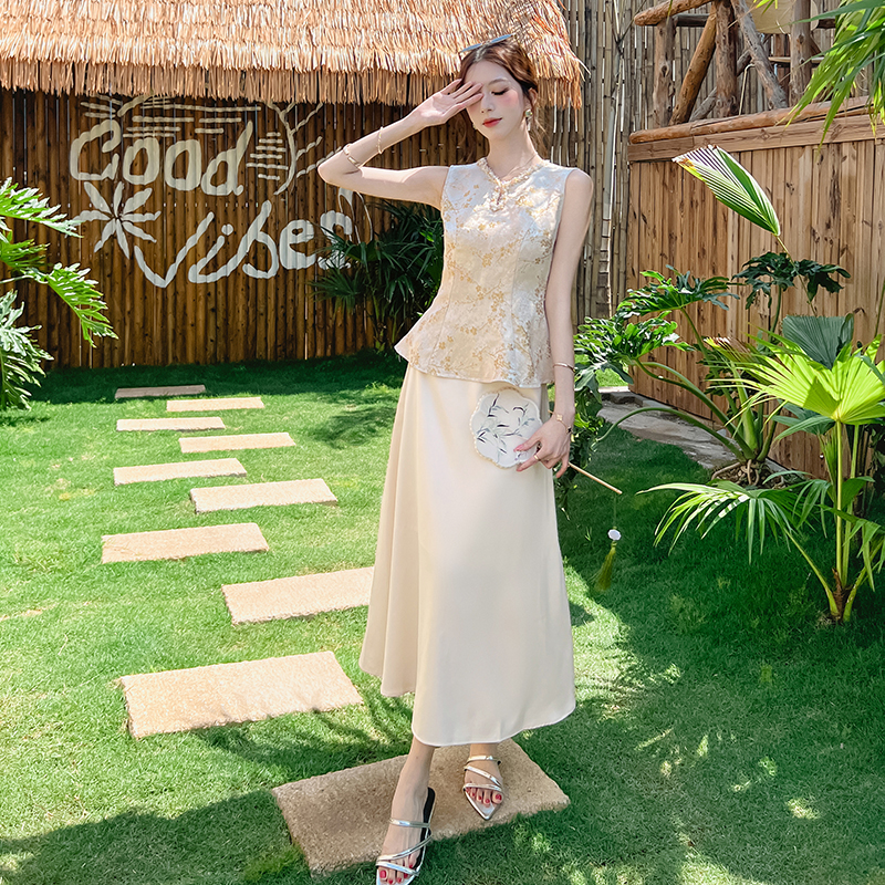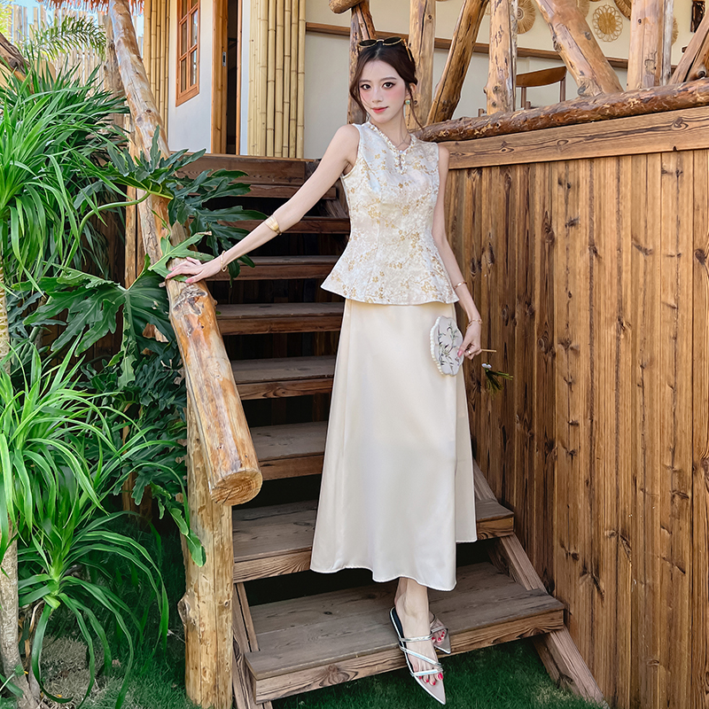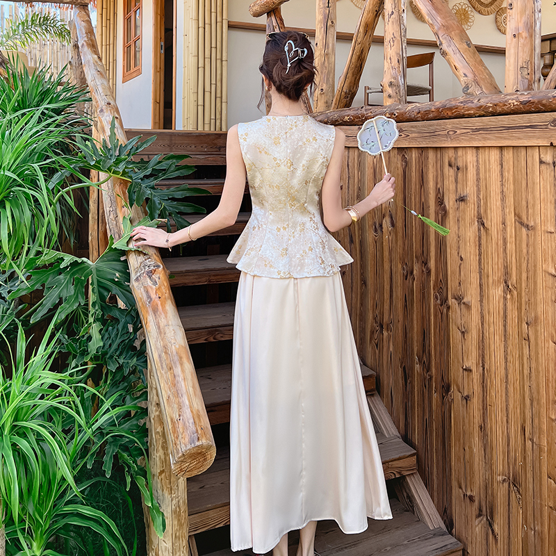 木子李的李新中式高级缎面提花无袖收腰马甲上衣垂感半身裙套装夏 服裝批發女裝批發服飾貨源