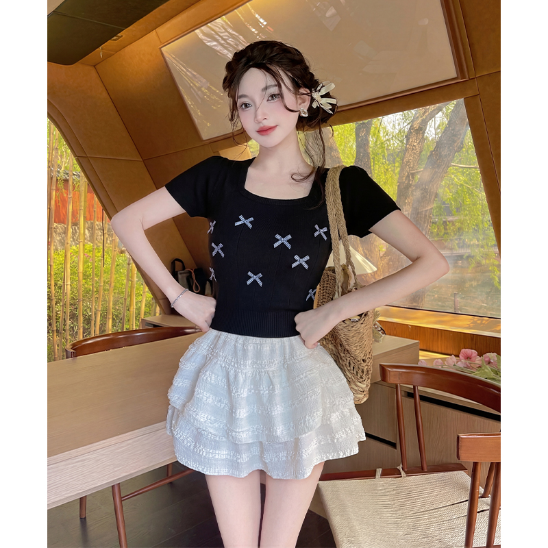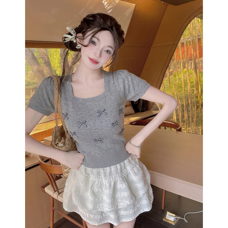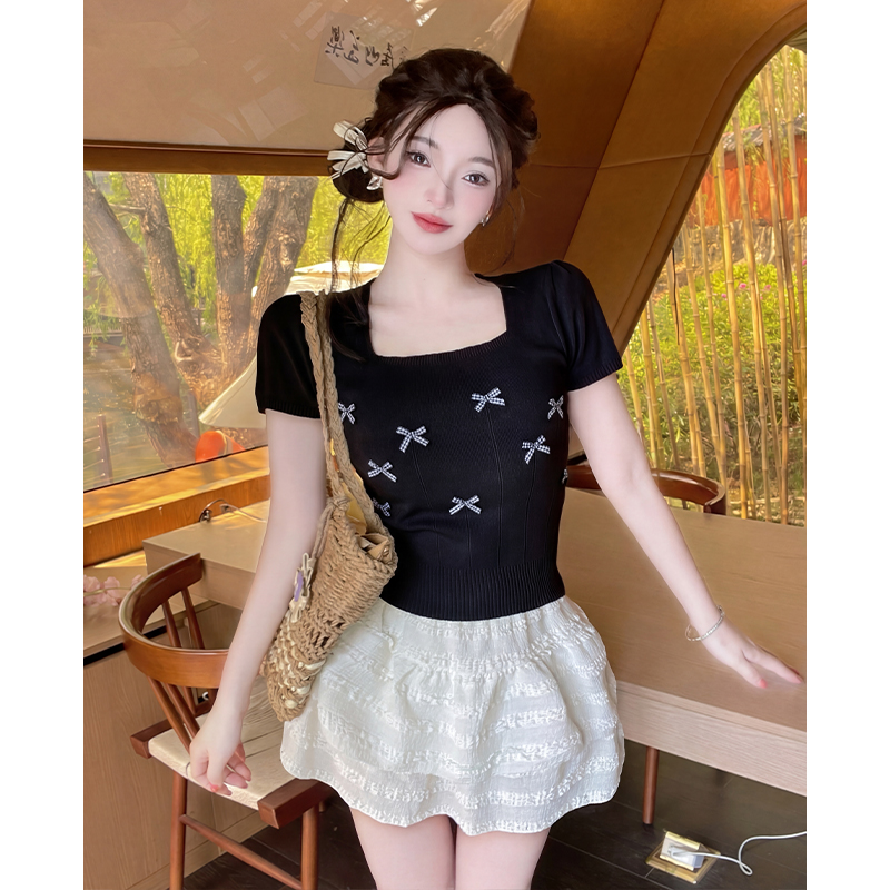 夏季新蝴蝶结针织衫短袖女泡泡袖T恤小清新方领气质短款上衣 服裝批發女裝批發服飾貨源