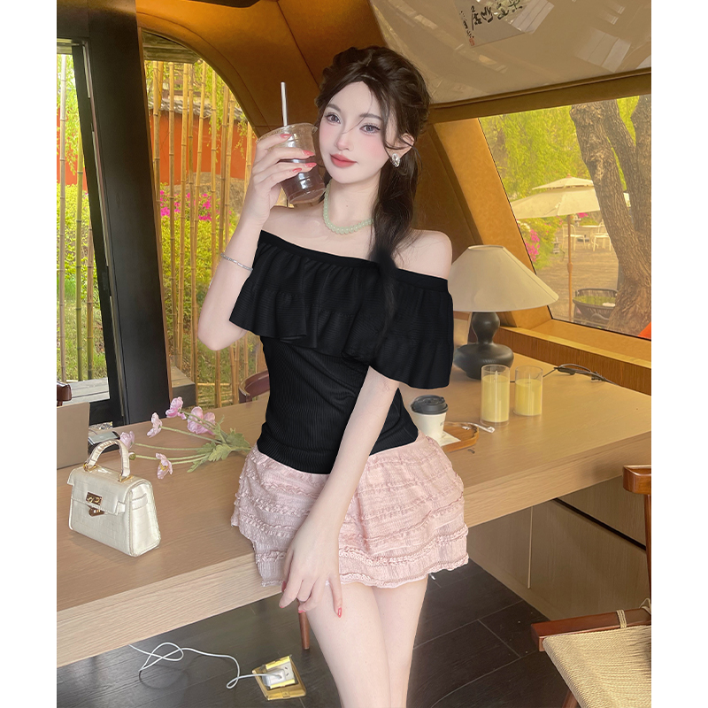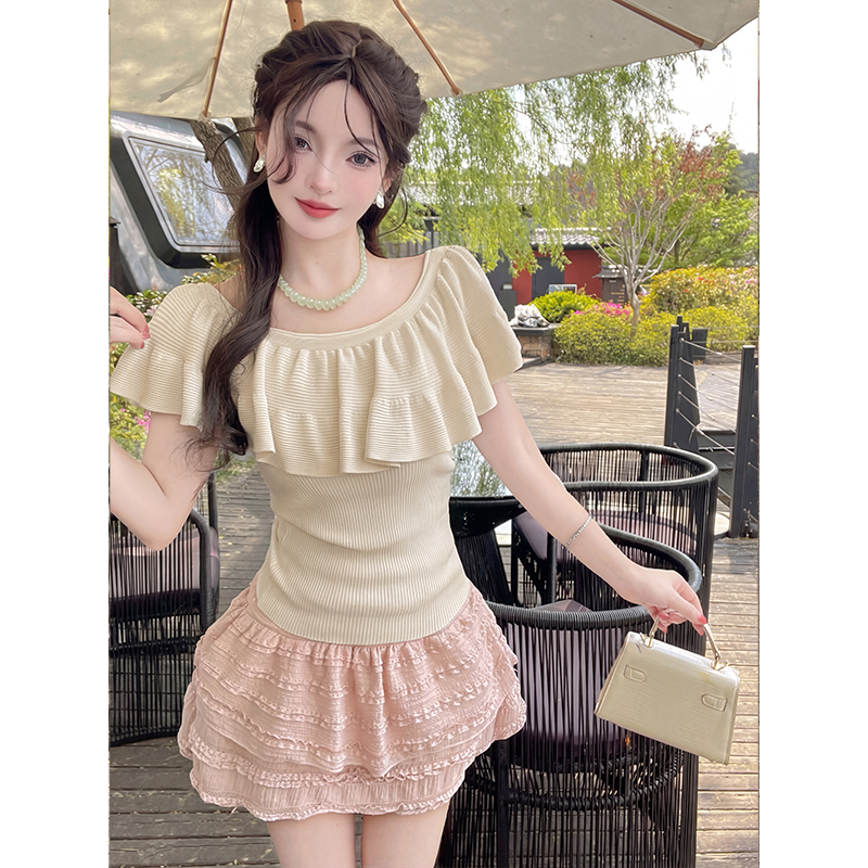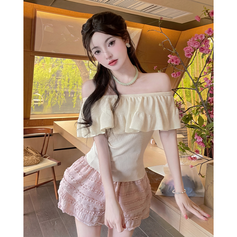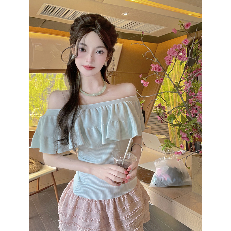 蓝色纯欲荷叶边一字领针织衫女夏季新款修身显瘦漂亮辣妹上衣 服裝批發女裝批發服飾貨源