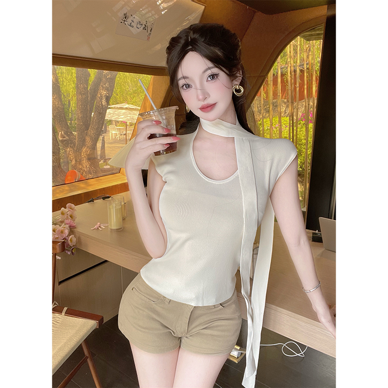 U领挂脖飘带针织衫T恤女夏季新款独特别致修身小飞袖短款上衣 服裝批發女裝批發服飾貨源