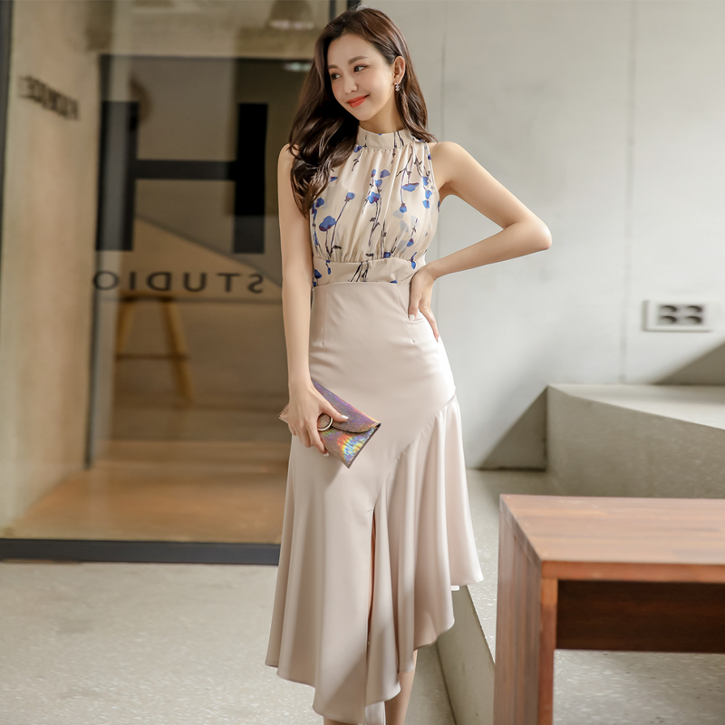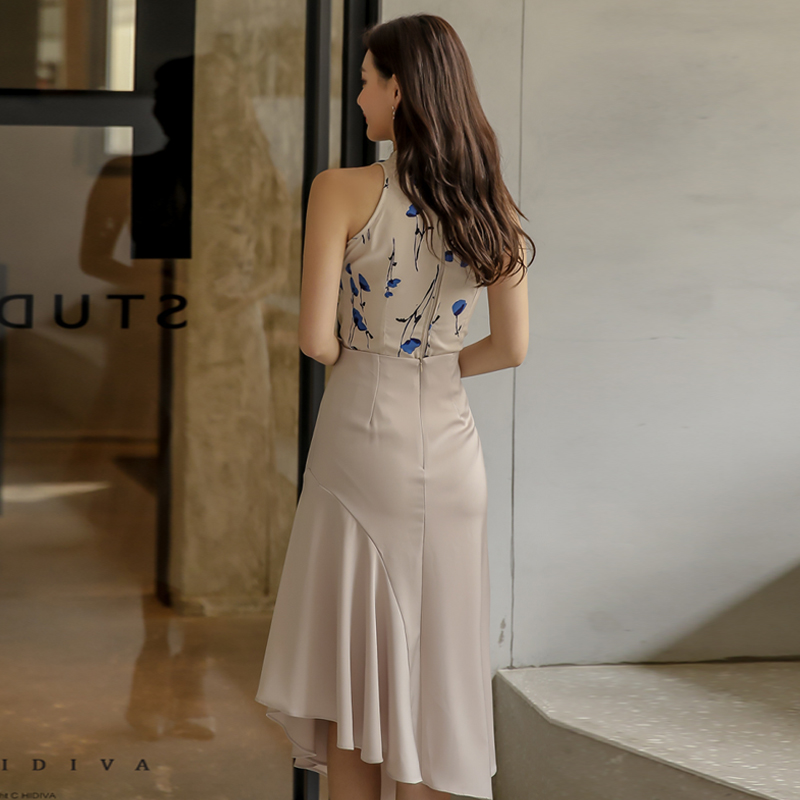 法式温柔风挂脖碎花裙女夏缎面质感收腰显瘦不规则鱼尾连衣裙 服裝批發女裝批發服飾貨源