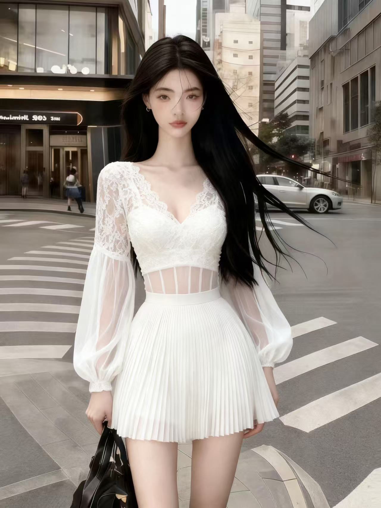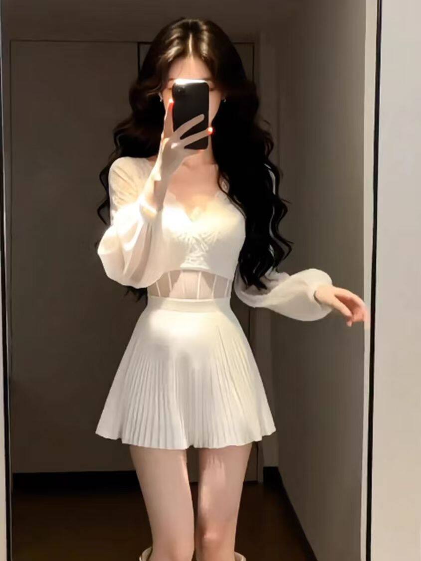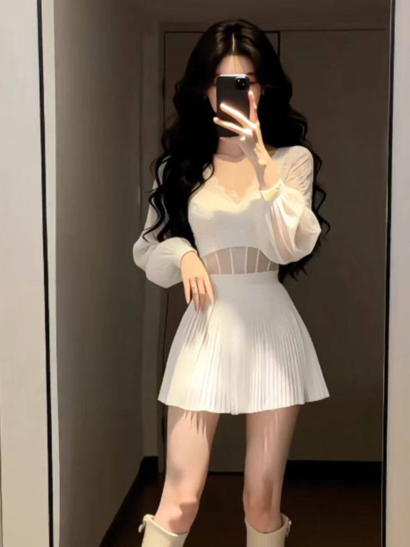 FA56865# 时尚氛围感纯欲气质辣妹风白色网纱V领长袖收腰百褶连衣裙