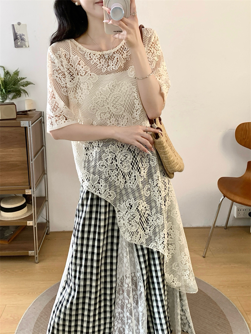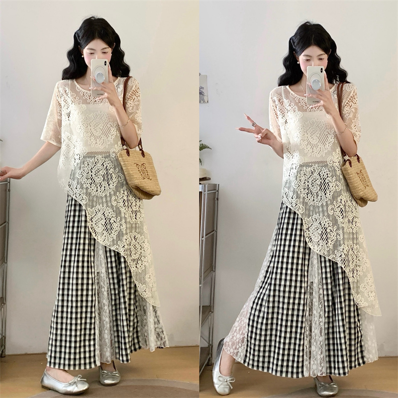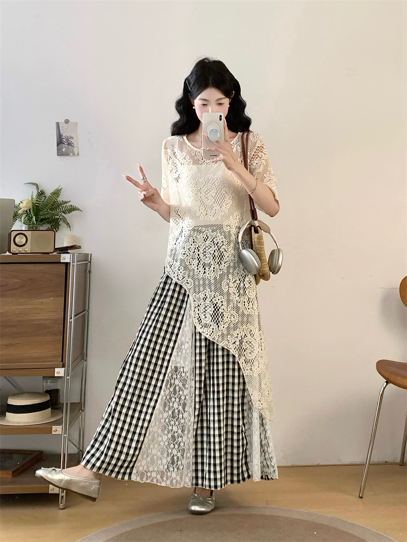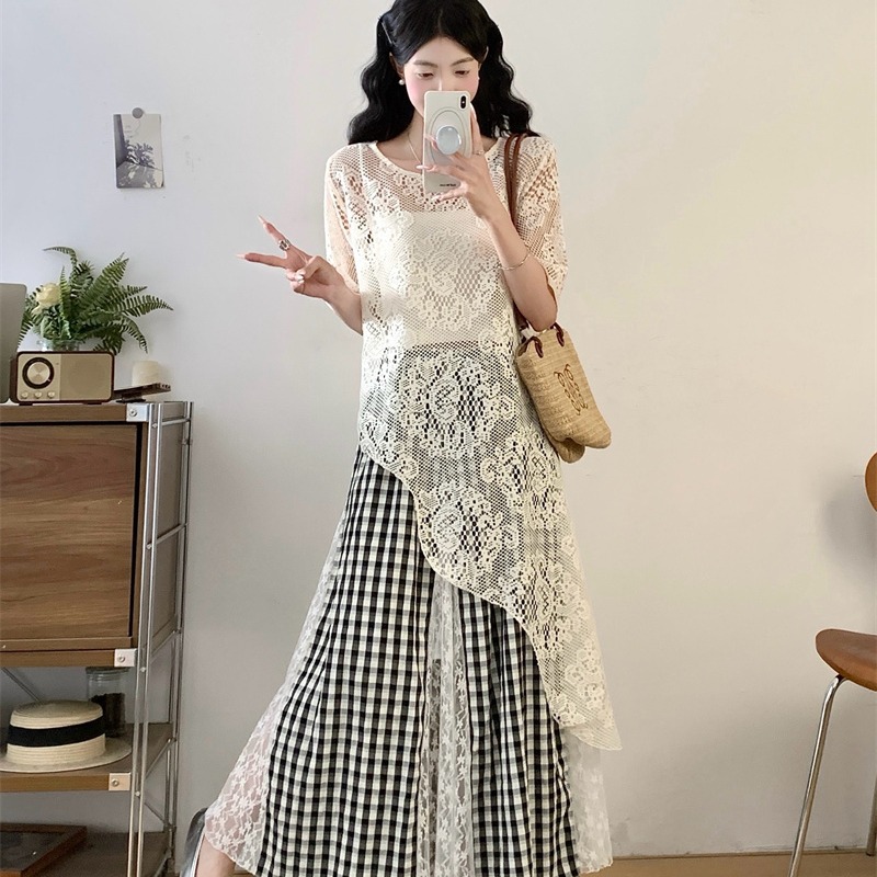 BY14338# 夏胖妹妹新款不规则上衣+法式蕾丝拼接格子半身裙两件套 服裝批發女裝批發服飾貨源