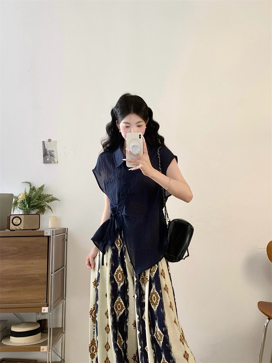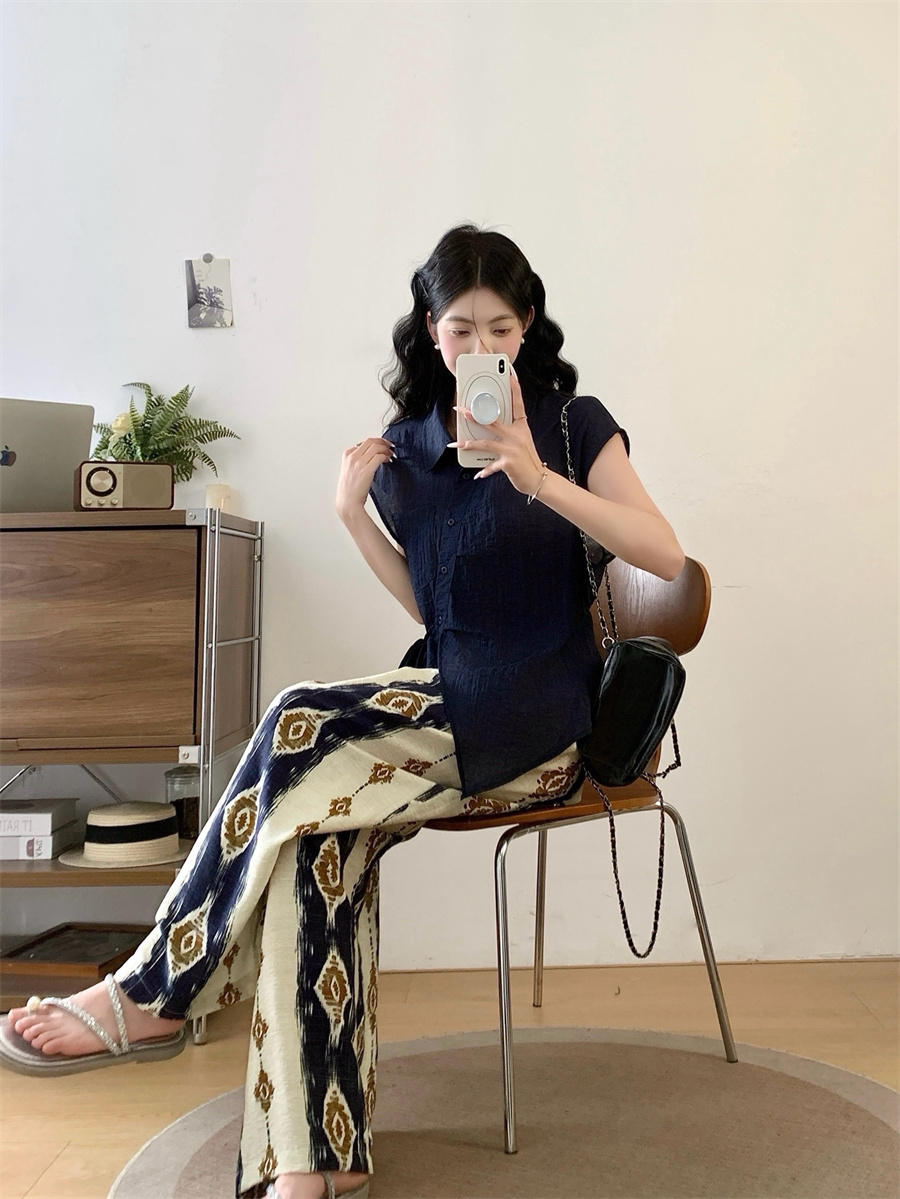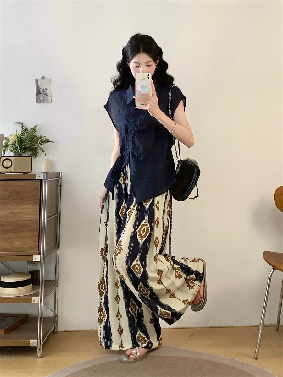 BY14339# 夏胖妹妹新款独特松弛感系带衬衫+印花阔腿裤两件套 服裝批發女裝批發服飾貨源
