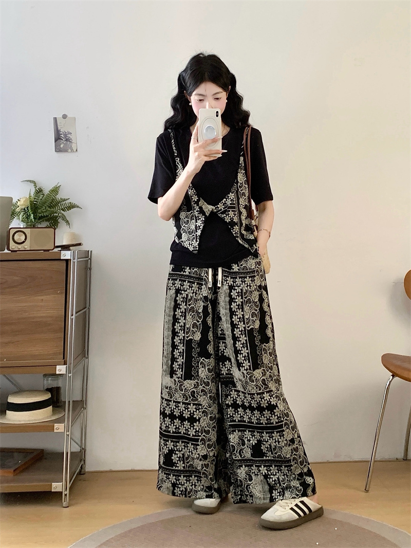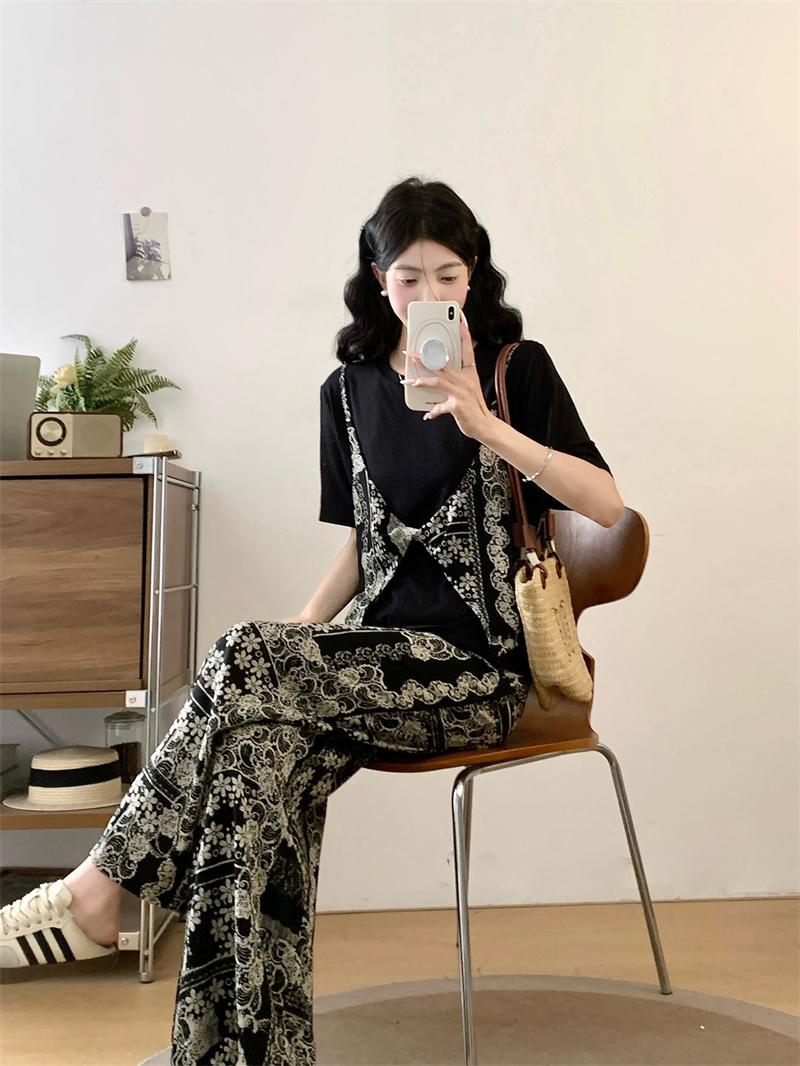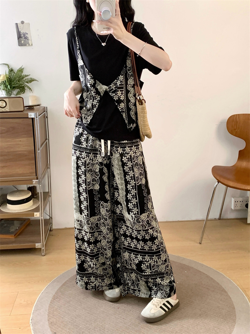 BY14340# 夏胖妹妹新款独特小众吊带假两件T恤+印花阔腿裤两件套 服裝批發女裝批發服飾貨源